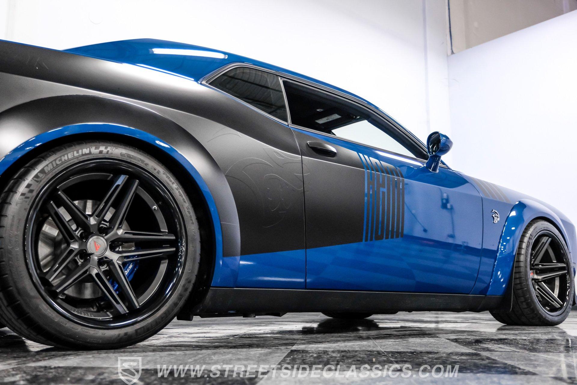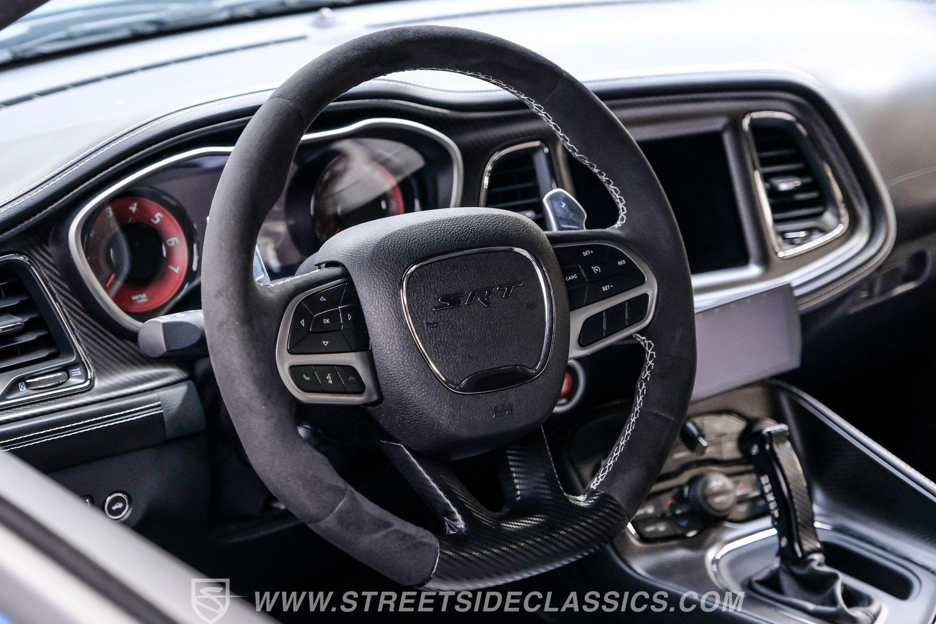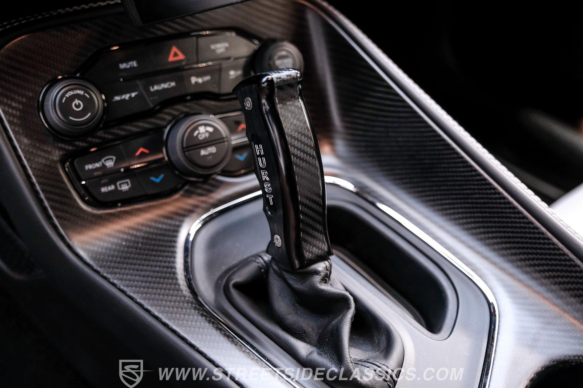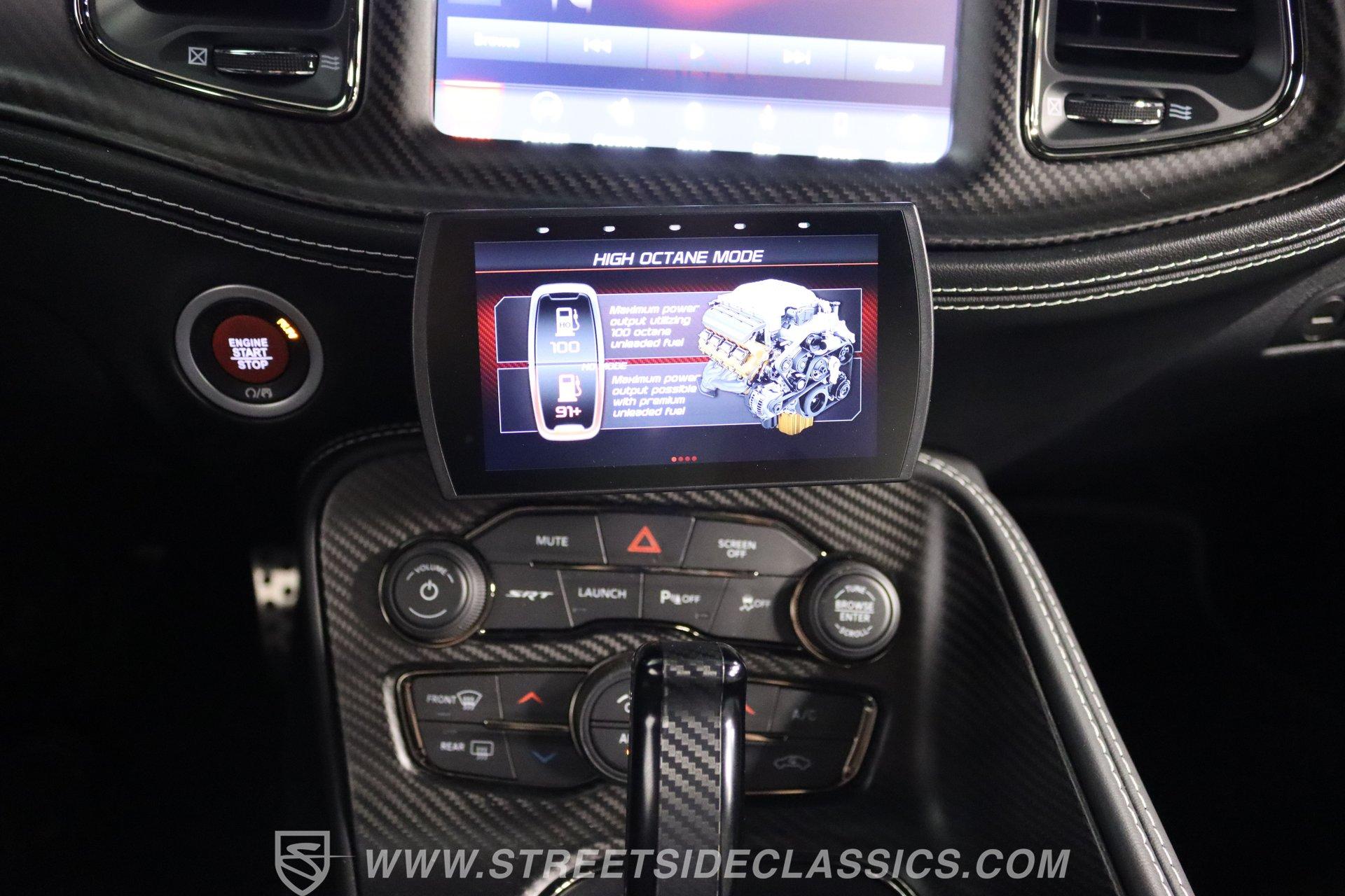 All these options are amazing, but the owner wanted even more, ordering Mopar Direct Connection dealer upgrades that include most significantly the Redeye Pre-Stage and Stage ll performance upgrades that consists of an engine that pumps out an incredible 840hp on pump gas (885hp on 100 octane) with a whopping 787-foot pounds of torque. The package also came with a Direct Connection 5'' Wifi tuner with hi-def touchscreen, 180-degree performance thermostat, 17 PSI boost, 3.17-inch Hellephant pully and a full Dodge warranty. Additional dealer items on this car include color matched valve covers, Mopar ABS control cover, Mopar valve shield and custom Hellcat Redeye logos in the engine bay. The suspension system was upgraded with an Eibach Pro lowering kit including front upper control arms, BMR adjustable rear camber arms, BMR rear upper control arms, Ferrada CM1 20x12 zero offset wheels in matte graphite grey with gloss black lip, 4-inch gloss black spike lugs and Michelin 335/30 ZR20 Pilot Sport tires. Other premium upgrades include Black Trackhawk quad exhaust tips, ZL1 front and rear tow strap hooks, custom Hellcat logo lift plugs, custom Hellcat Redeye rear facia logo, Lux tinted tail lights and side reflectors, custom billboard and racing stripes wrap by Precision Wraps, custom Hurst pistol grip shifter with billet, black and carbon fiber details and matching stainless footrest and E-brake pedal covers.