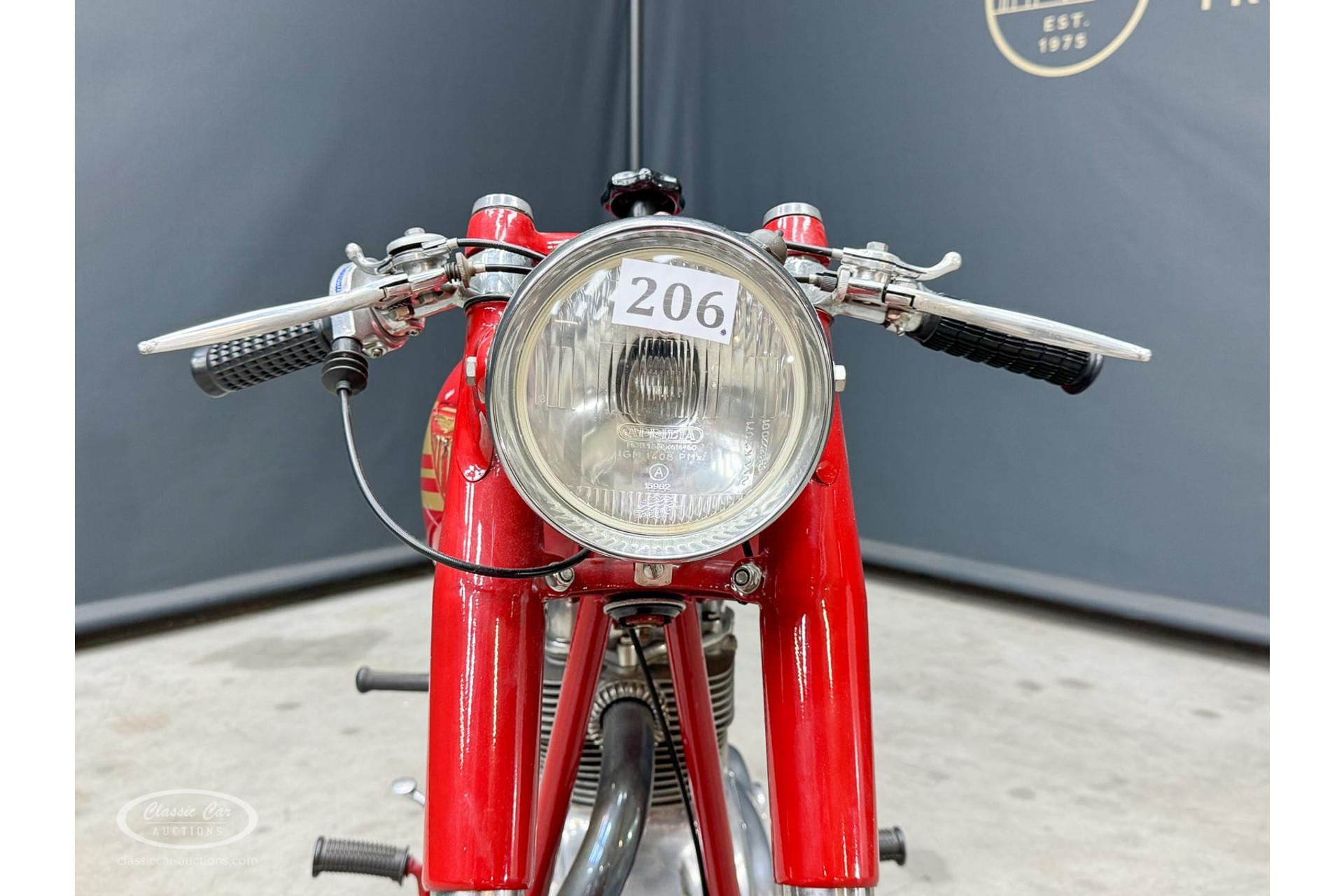 The motorcycle is in remarkable condition, with a beautiful paint finish and well-preserved chrome details. The craftsmanship put into Italian motorcycles at the time is evident here. The bike is a joy to look at and still shows the charm that made this model so popular in the 1950s.