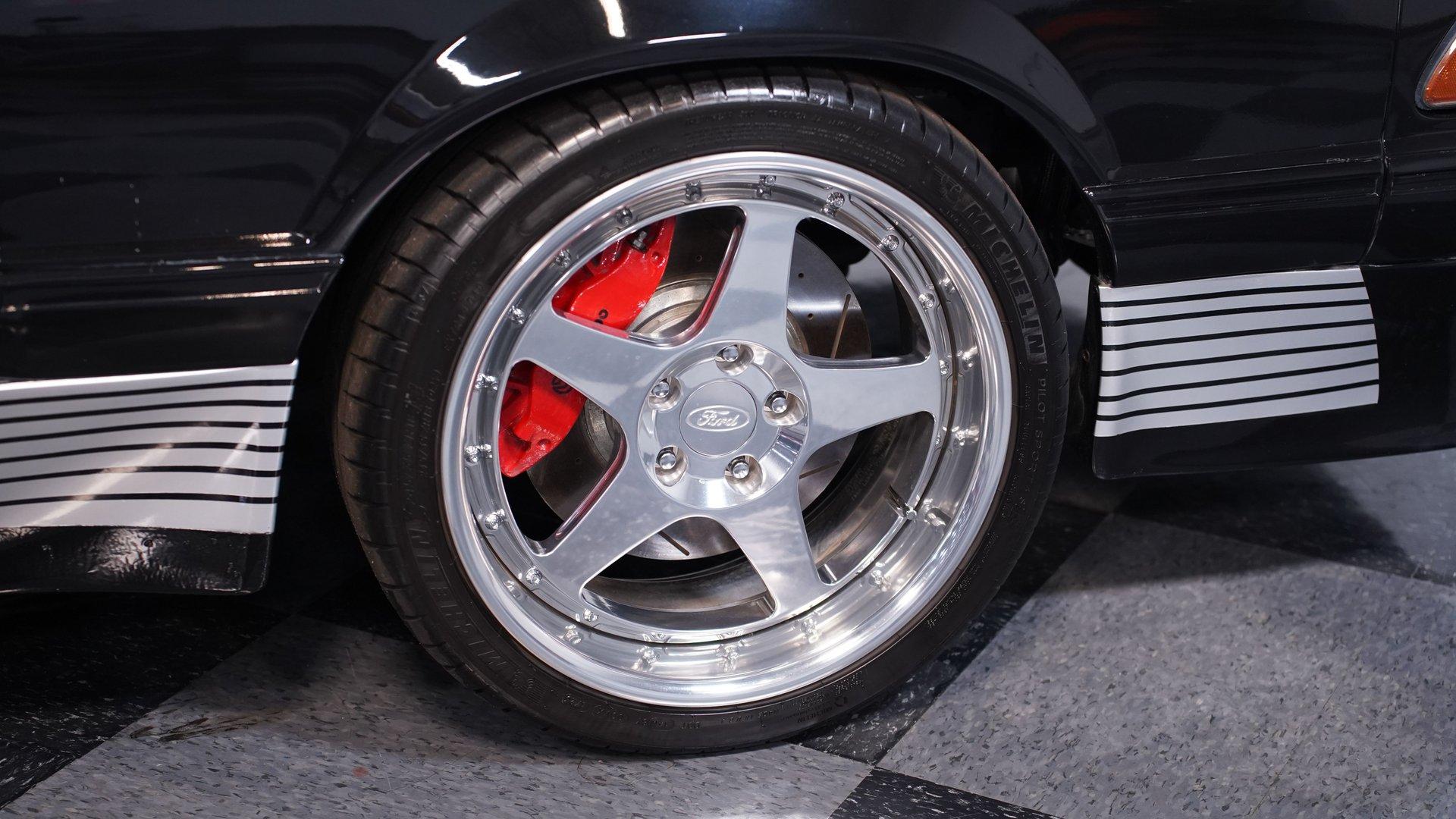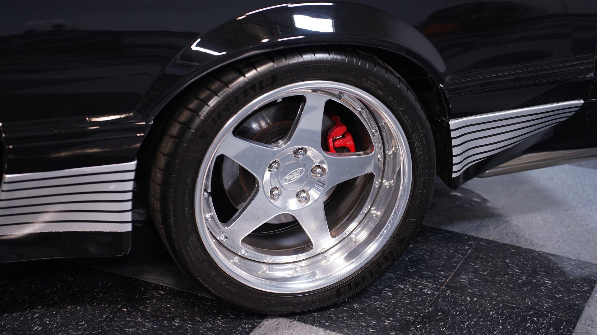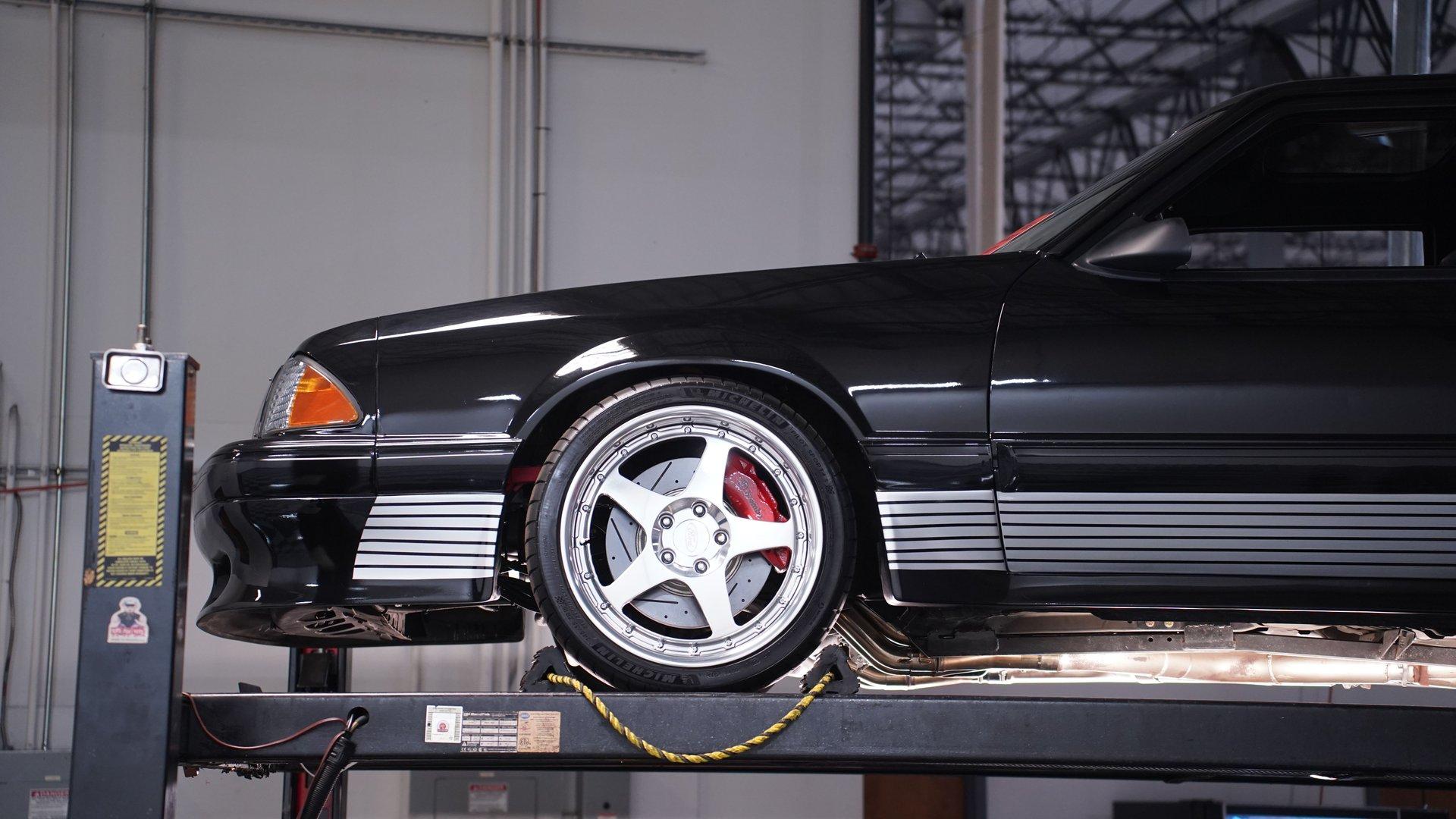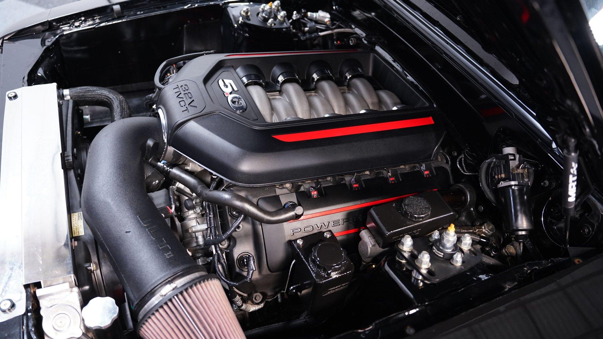 Under the hood, a Gen 1 5.0L Coyote V8 crate engine is the heart of this resto-mod, delivering an estimated 405 horsepower of naturally aspirated power. The JLT air intake, Kooks headers, and SVE aluminum radiator with dual electric fans keep everything running cool and strong. A 6-speed automatic transmission and Maximum Motorsports coilovers ensure the driving experience is both responsive and refined. Subframe connectors and a tubular K-member add rigidity, while the custom engine bay showcases top-tier craftsmanship.