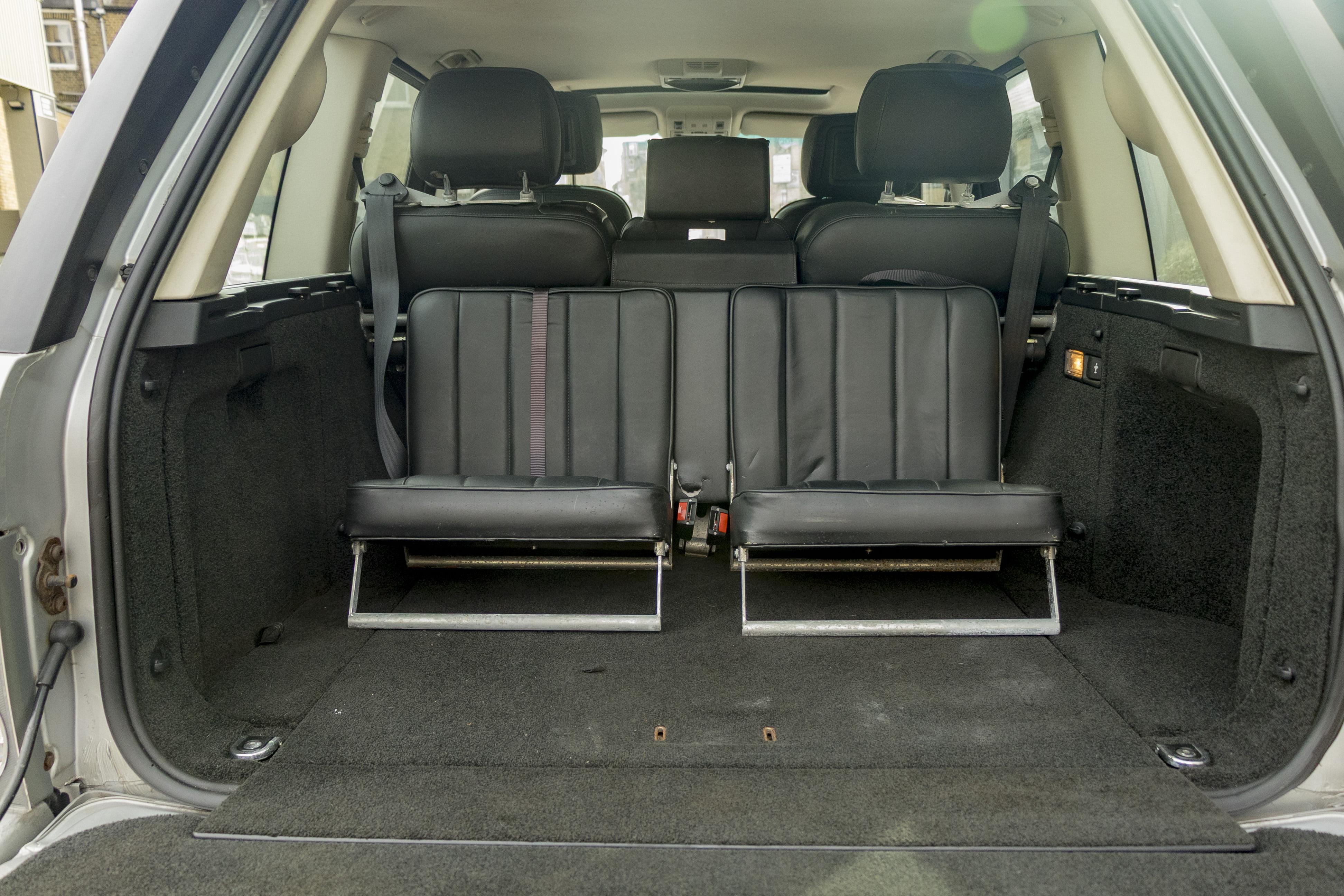 The interior is trimmed in black leather and features seven seats, including fold-away rear seats in the boot area. The front seats have electric adjustment. The driver's seat shows light age-related wear and there is a crack in the lower plastic shroud on the side of the seat. The vehicle is equipped with Harman/Kardon audio, factory satellite navigation, radio, TV and DVD functionality, rear headrest-mounted screens, and a factory electric sunroof, which is operational. The carpets, headlining and boot area are tidy, and a spare alloy wheel and jack are located beneath the boot floor.