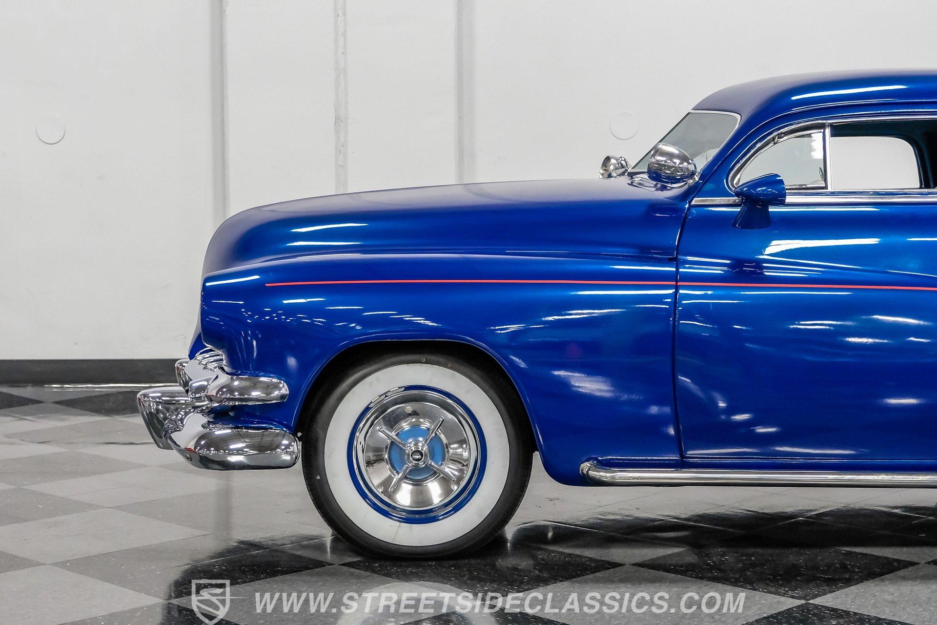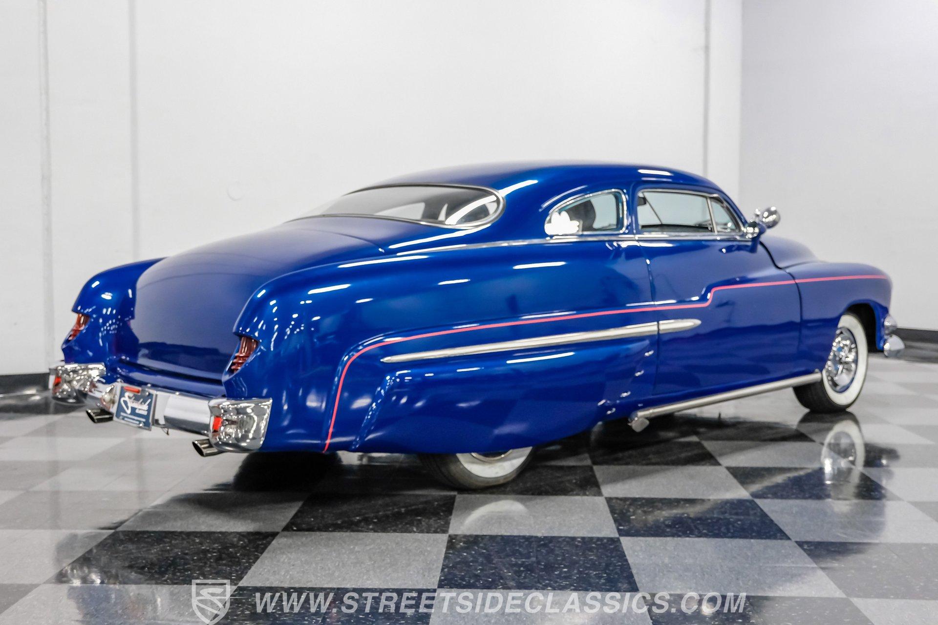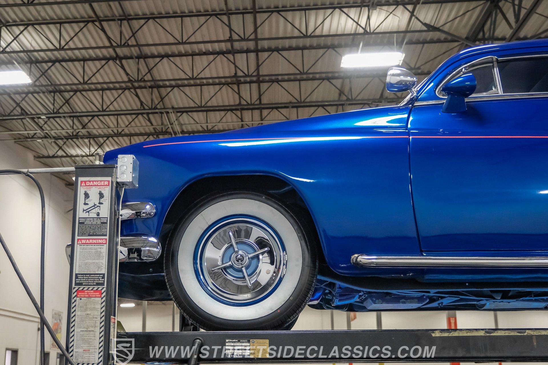 Owning a classic car means carrying a piece of history wherever you go. This 1951 Mercury Lead Sled Restomod brings that history to life with blue paint and red pinstriping applied two years ago, a 4.5-inch roof chop, Frenched headlights, rounded hood corners, a '55 Dodge front bumper and grille, and '55 Chevy taillights fitted with '54 Mercury lenses. Faux lake pipes and whitewall tires complete the vintage, custom look as it rolls down the road with unmistakable style.