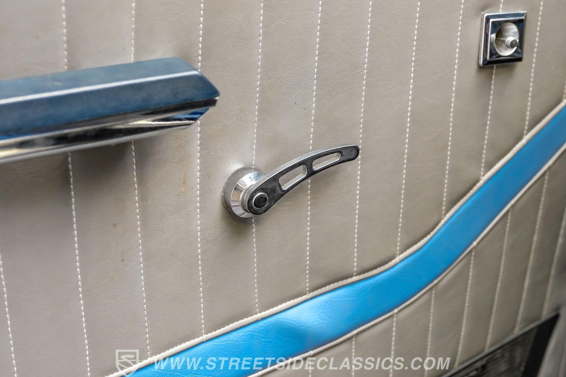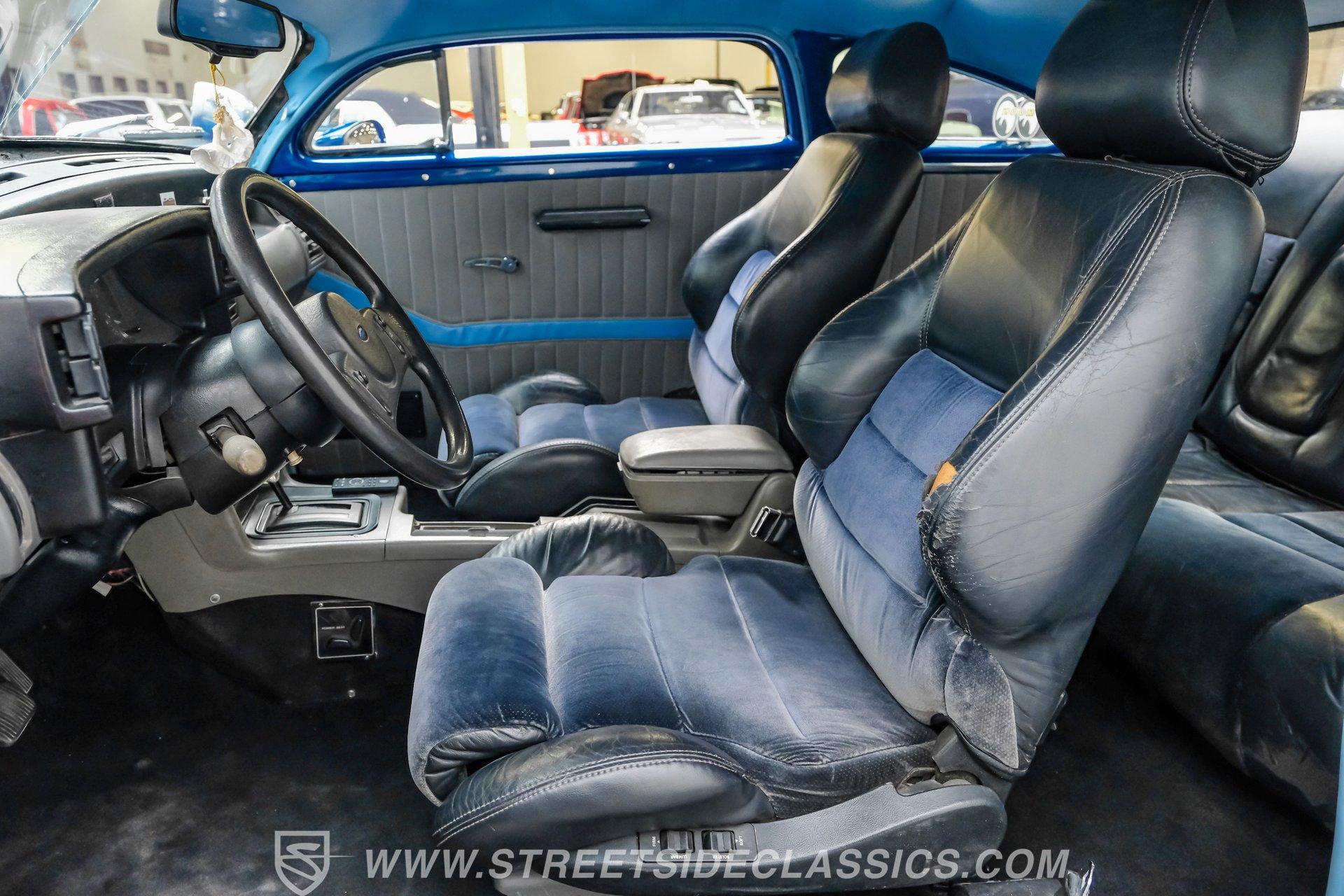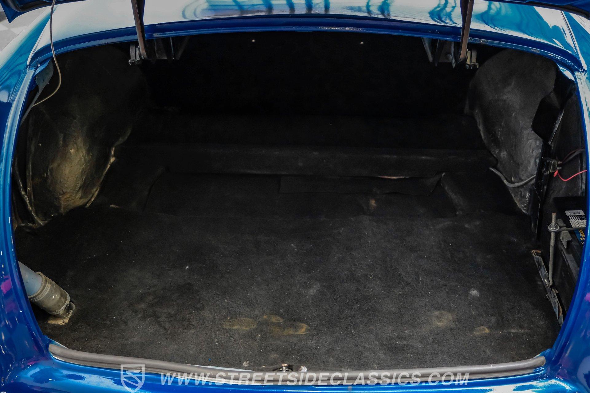 Step inside and you'll find a unique blend of classic flair and modern comfort. The interior features a blue and gray theme with a combination of leather and cloth front bucket seats sourced from a Mark VII, complemented by a custom rear bench. The dash, steering wheel, and center console hail from a late '80s Mustang, offering a familiar yet distinctive feel. Enjoy amenities like power windows, power seats, tilt steering, seat belts, and a Sony AM/FM/CD radio. Shaved door handles and door poppers on the spotlights add both convenience and style, while cold air conditioning keeps things comfortable.