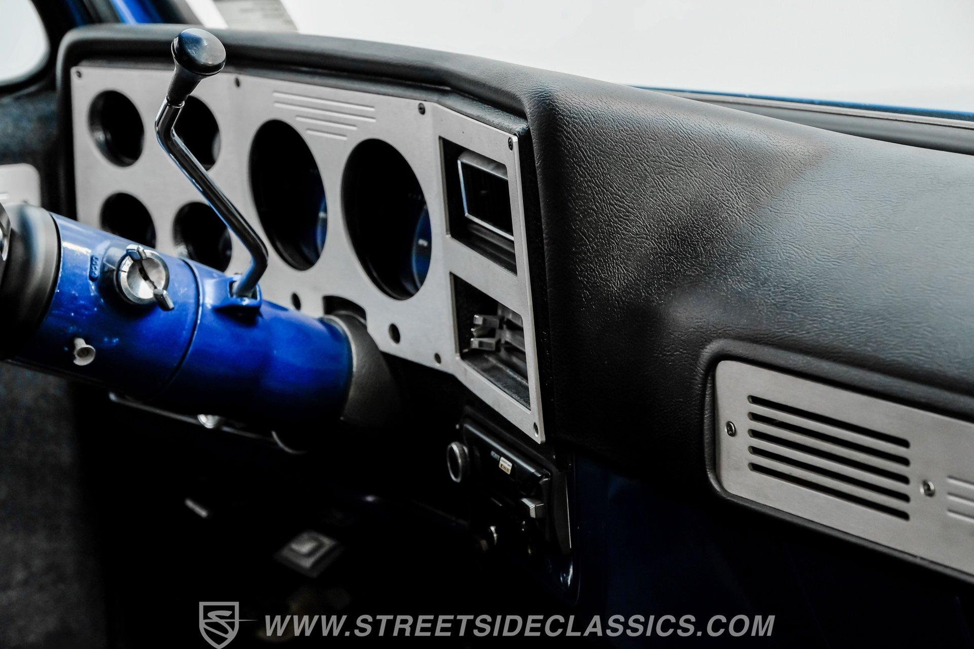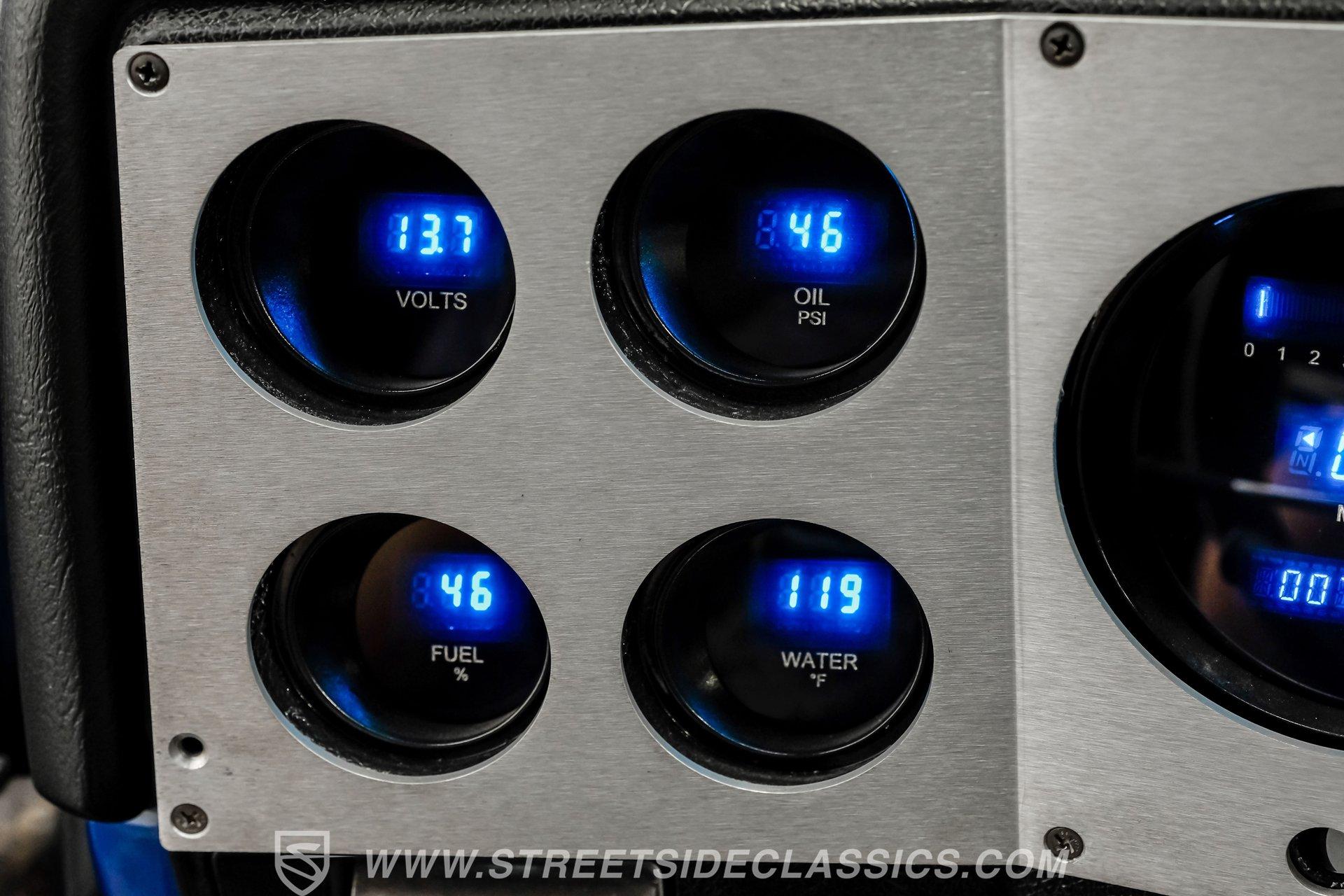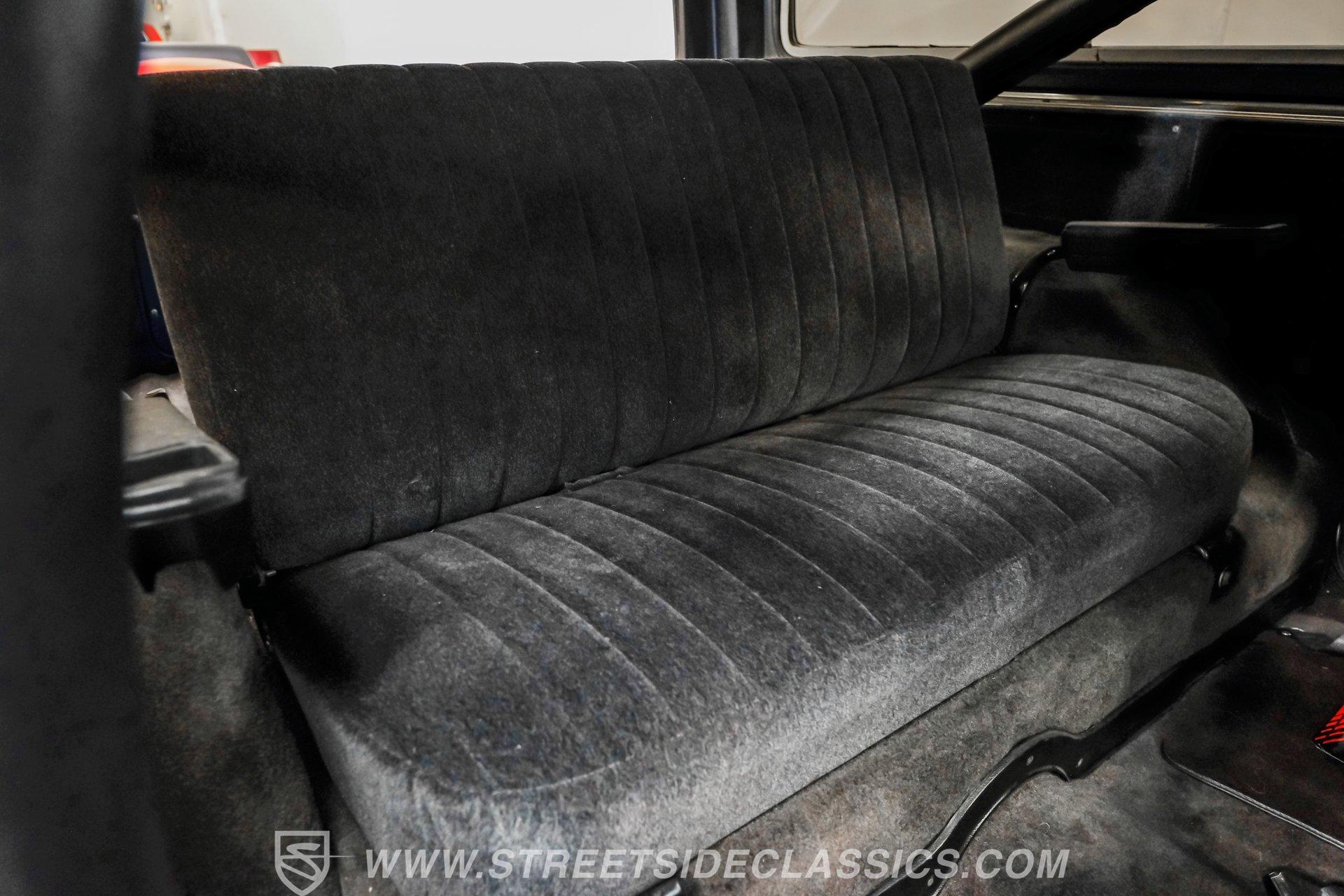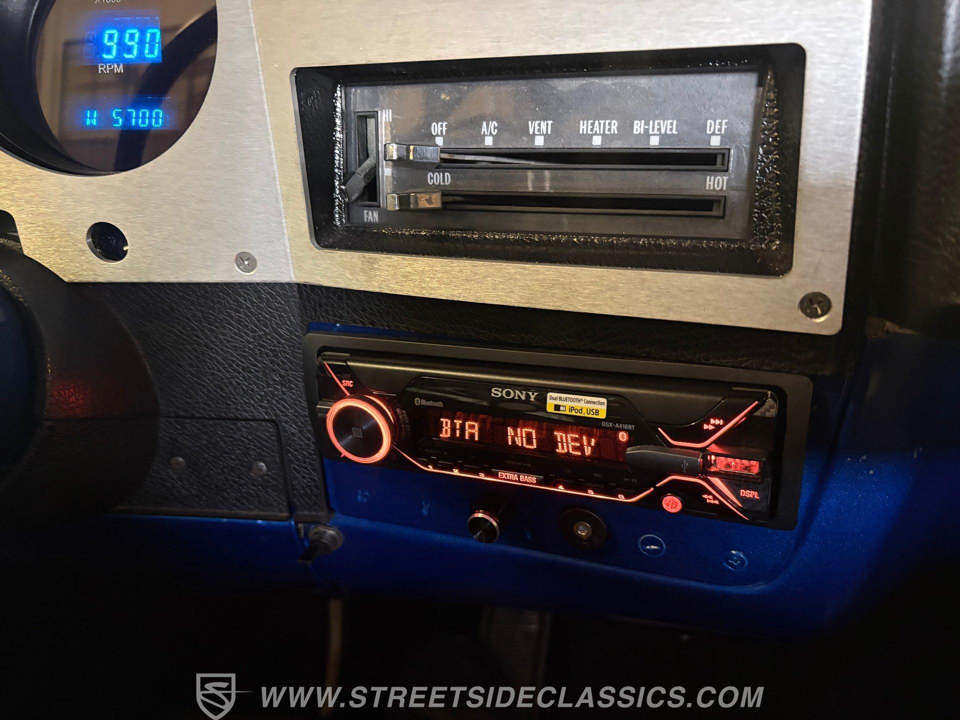 Step inside to discover a fully restored interior designed for both comfort and utility. Gray cloth bucket seats up front and a matching rear bench provide ample space for family and friends, while the center console adds convenient storage. Modern touches like Dakota Digital blue-lit gauges, a Sony AM/FM/Aux/Bluetooth stereo, and Kicker speakers with Pioneer subs ensure you travel with style and sound. Power windows and locks, a tilt column with an aftermarket steering wheel, and a Rhino-lined headliner and rear floor round out a cabin that's as functional as it is inviting.