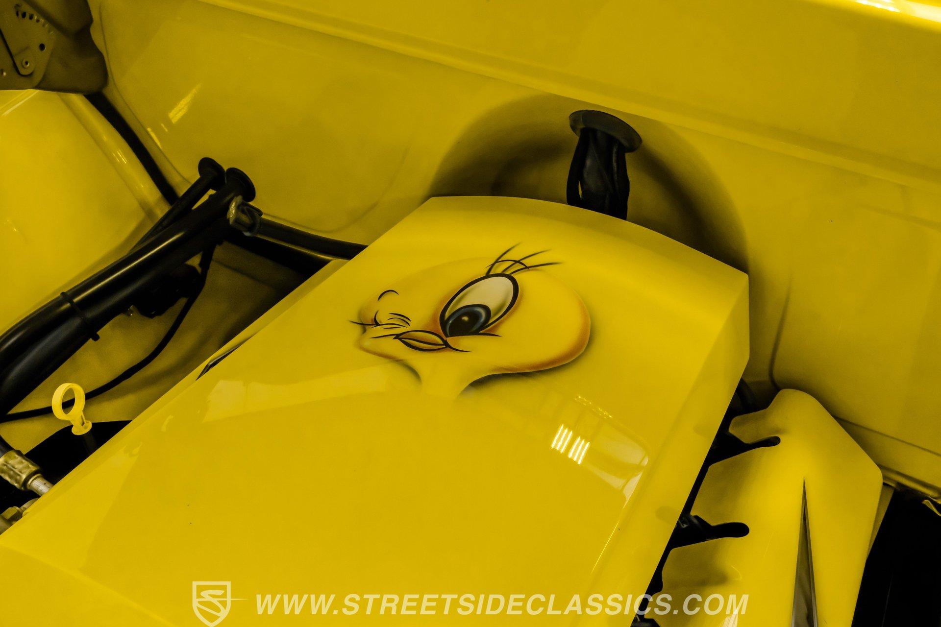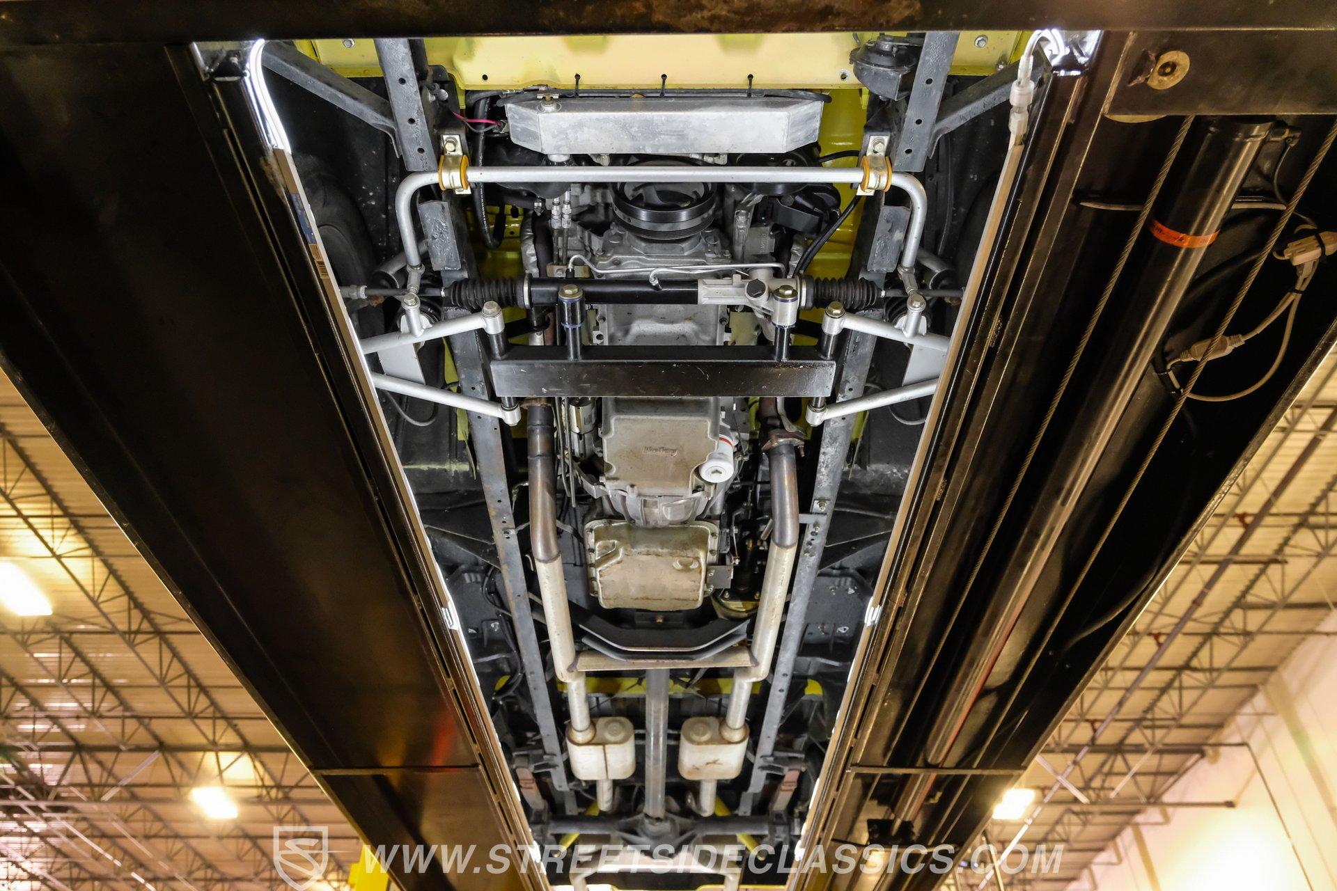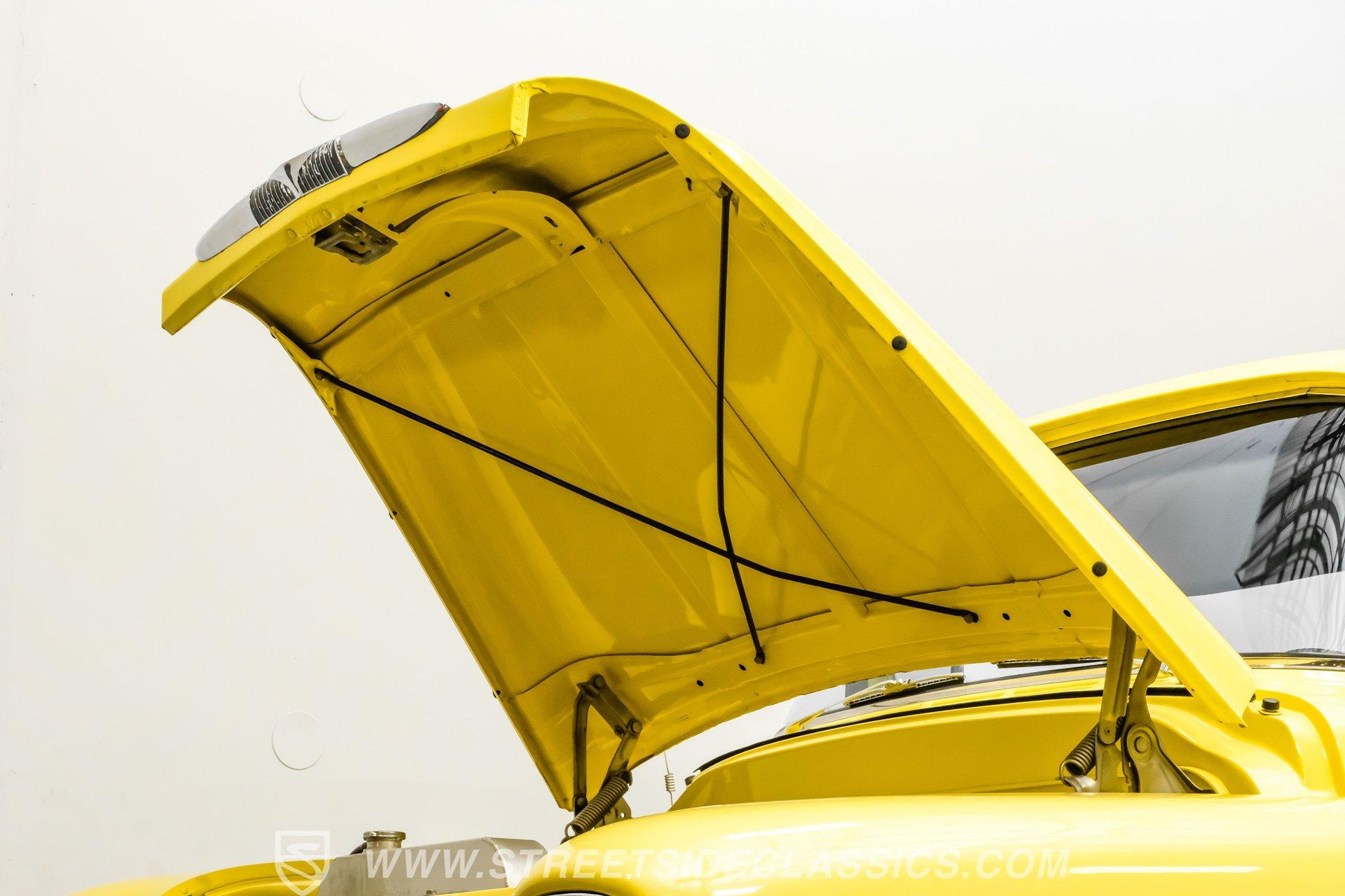 Step inside and you are greeted by a thoughtfully upgraded cabin where classic style meets modern comfort. The interior features custom gray and yellow accents, late-model gray leather bucket seats, and a custom center console with cup holders. Tweed door panels and headliner add a touch of bespoke luxury, while Dynamat insulation helps keep out the heat and noise. Dakota Digital gauges, a paint-matched tilt steering column with a billet wheel, and a Kenwood AM/FM/CD/Aux radio with Infinity speakers ensure that style and convenience are always at your fingertips. Vintage Air conditioning keeps you comfortable, making every drive enjoyable no matter the season.
