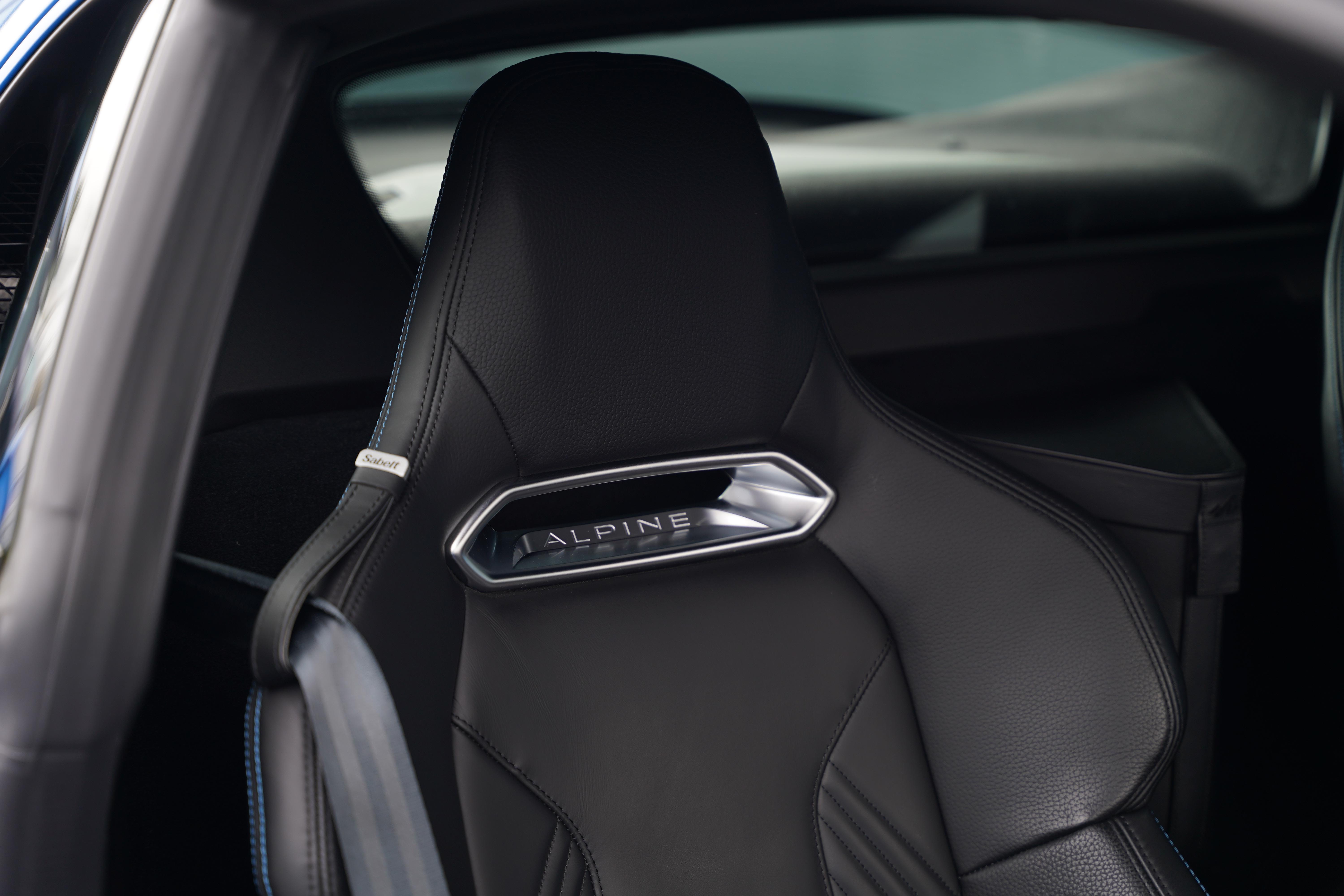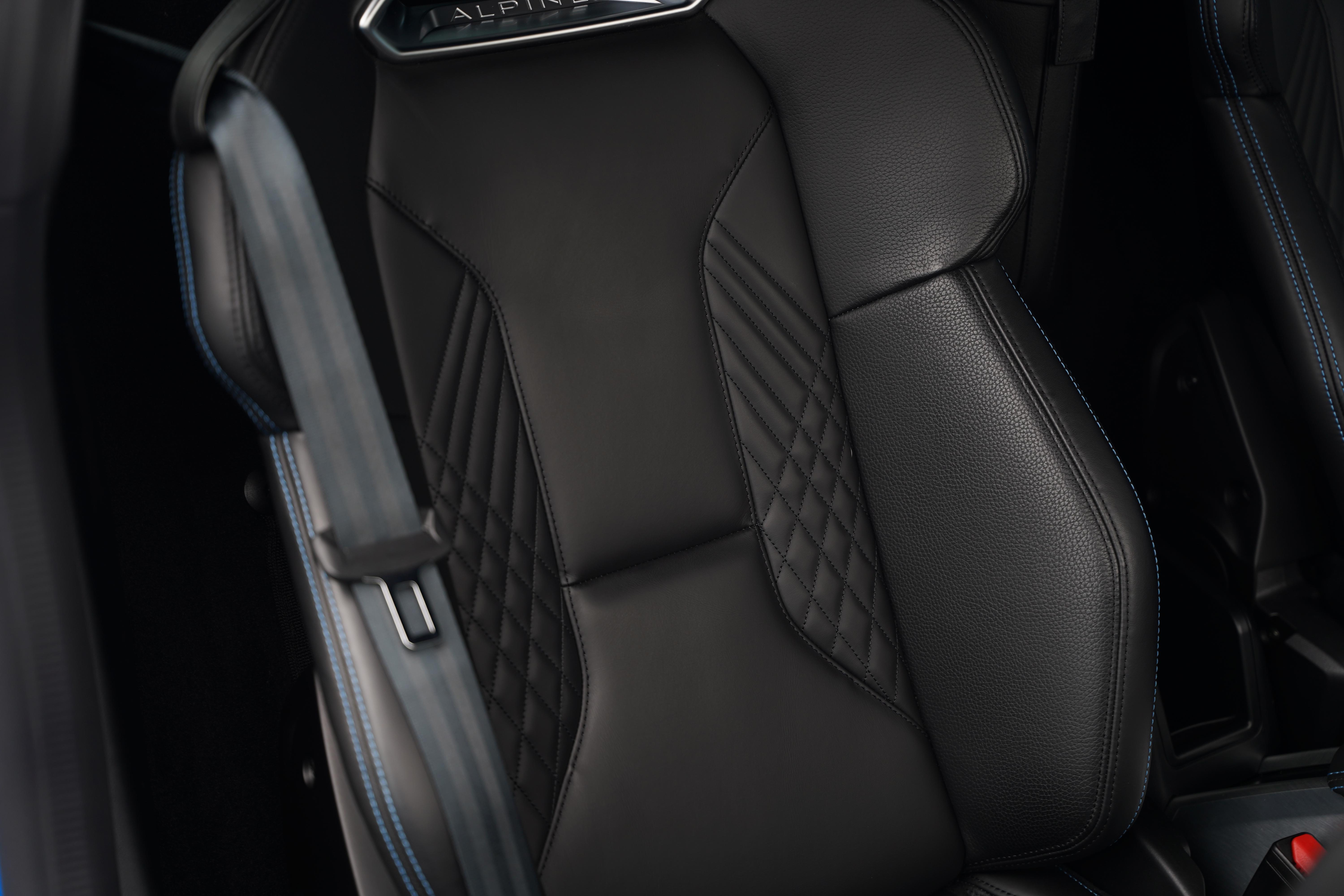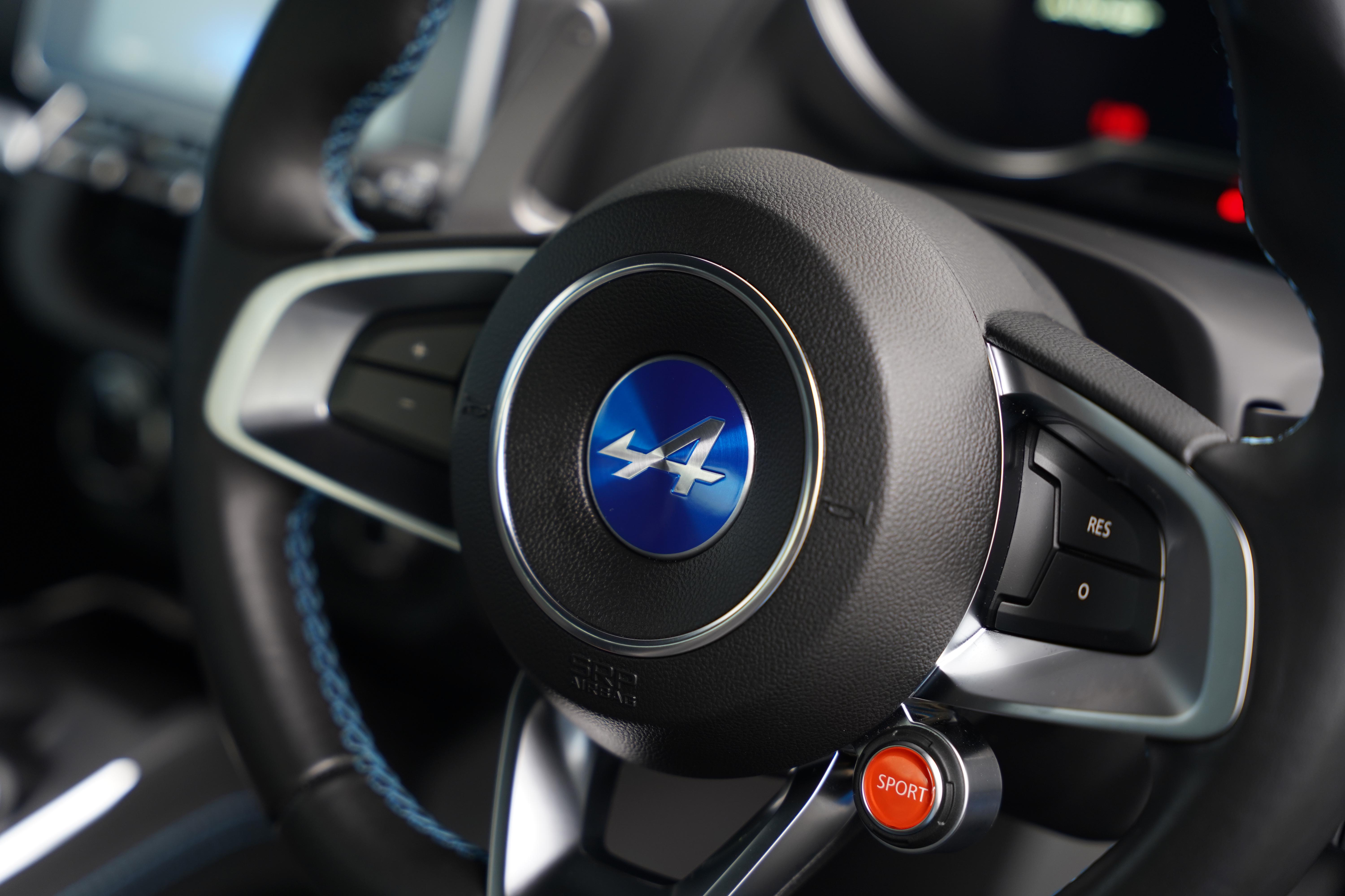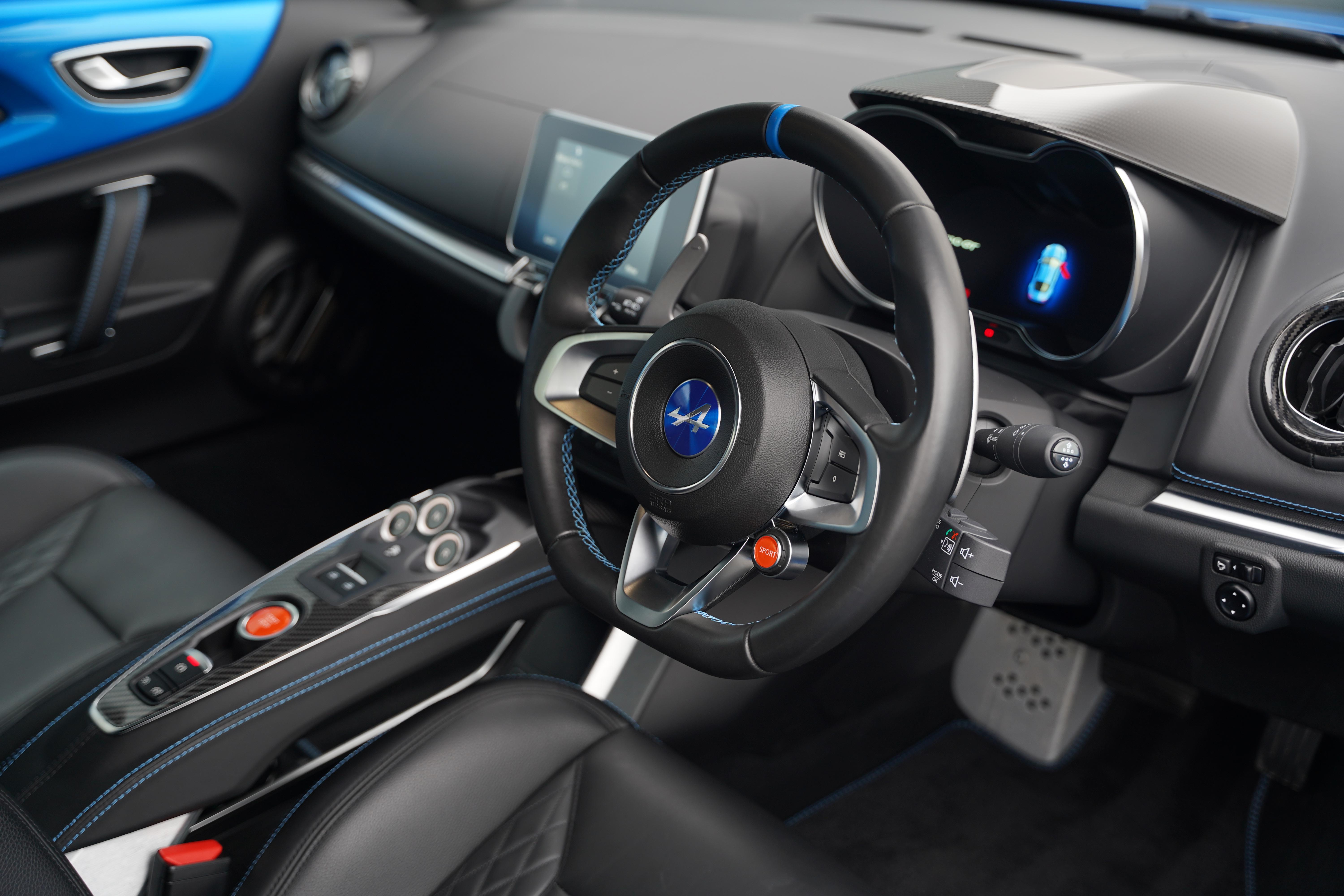 - Leather steering wheel with contrast stitch and Alpine Blue logo