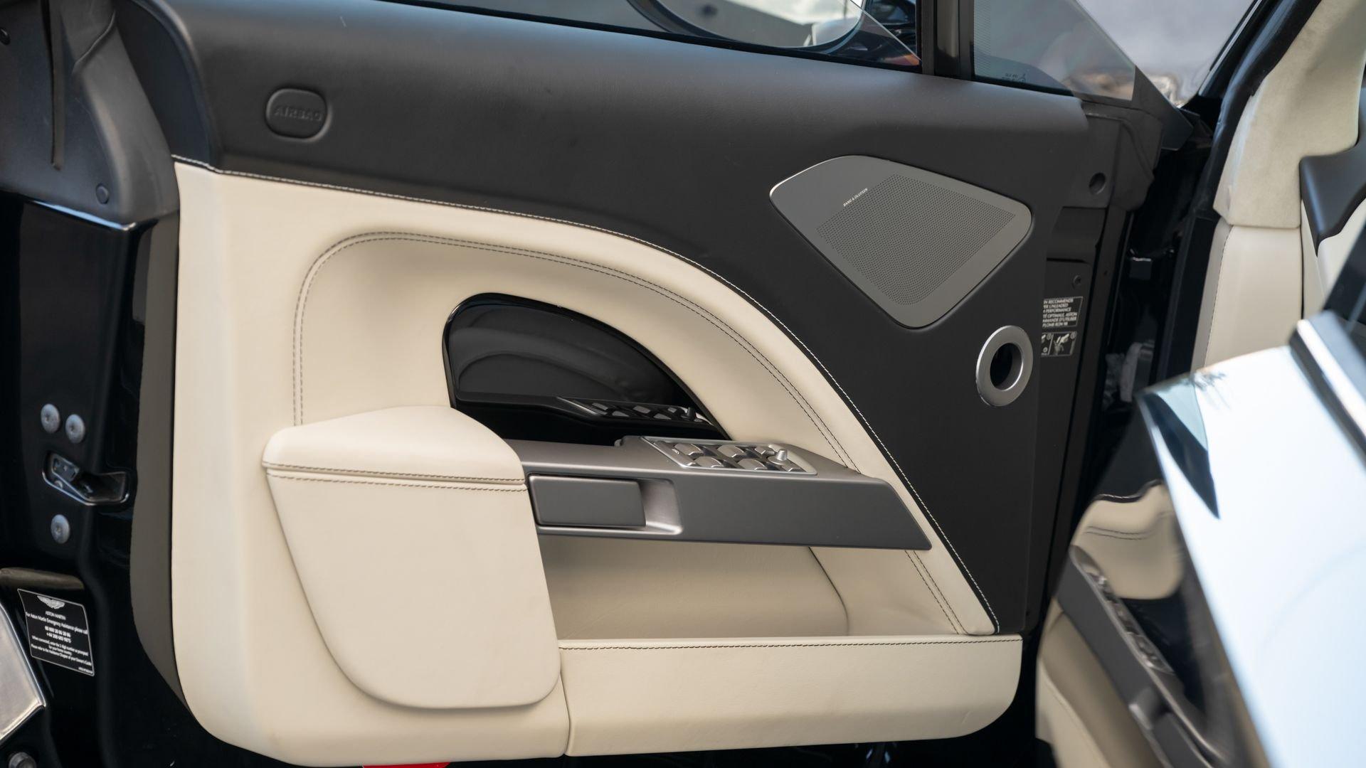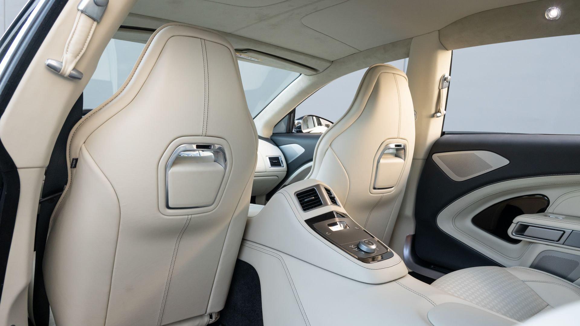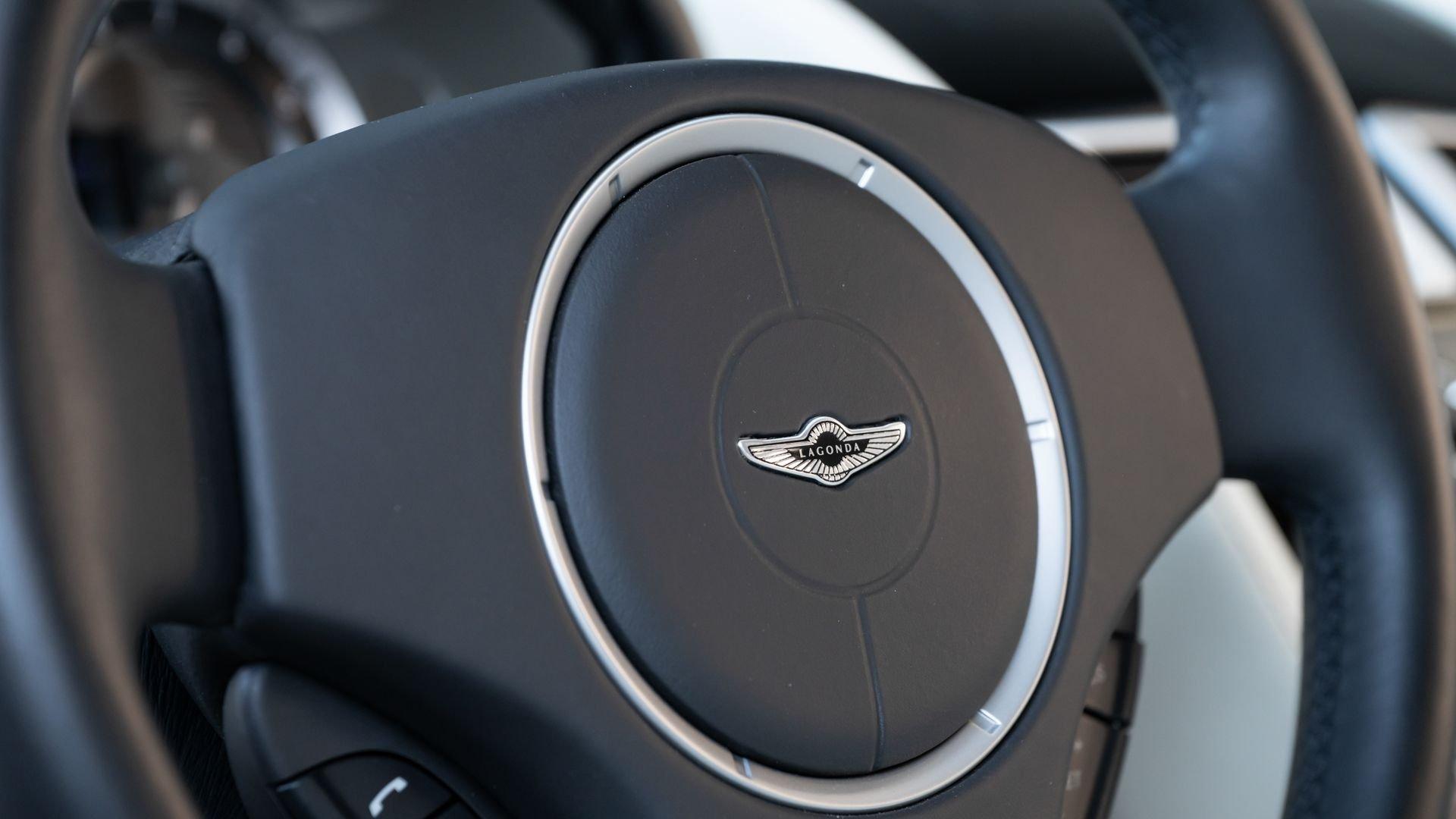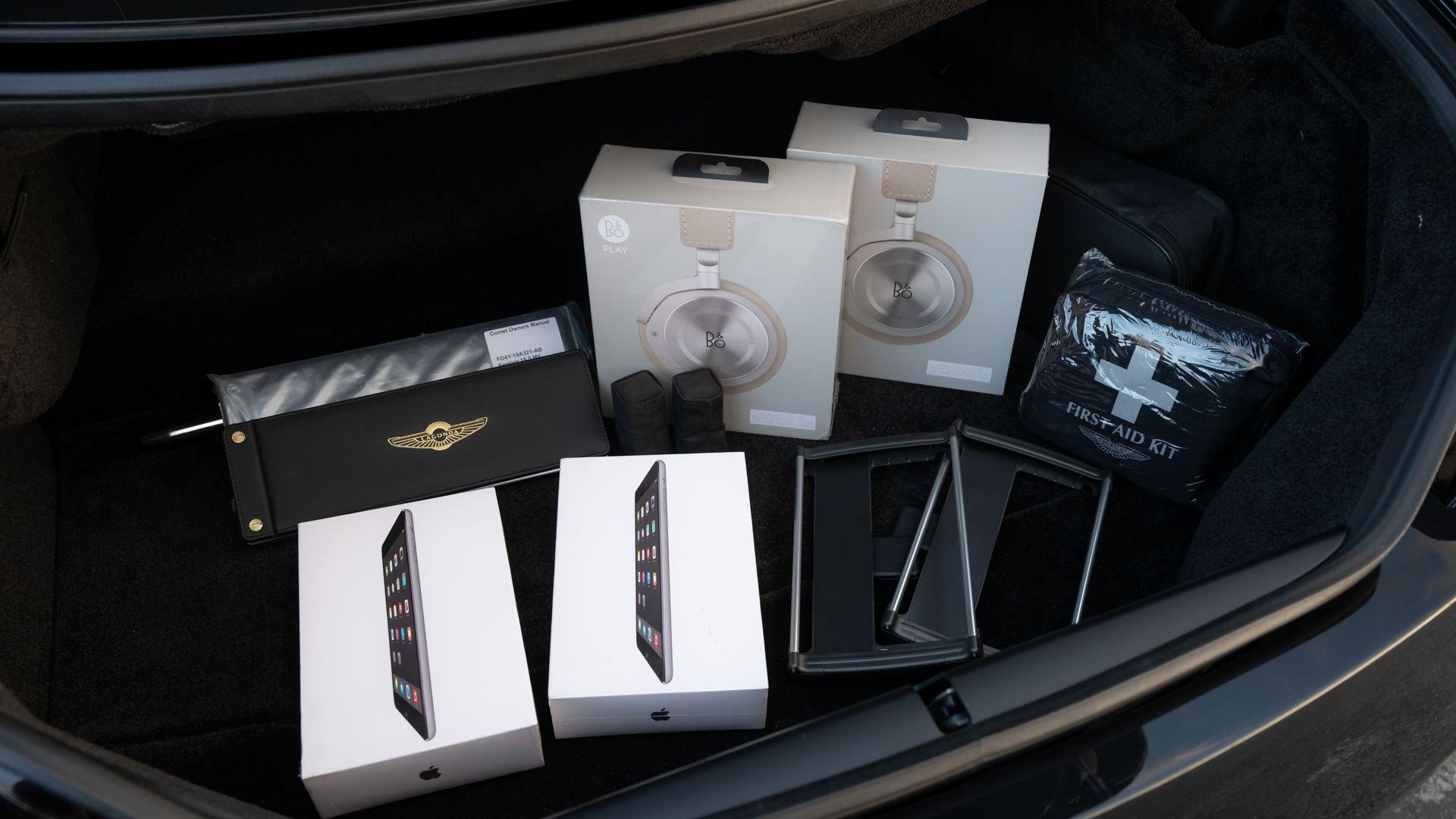 This exceptionally rare Aston now shows less than 500 miles at cataloging. It is furnished with its delivery items including iPad Minis with frame assemblies that attach to the front seatbacks, Bang & Olufsen headphones, owner's manual, Aston Martin-branded first aid kit, tire inflator, and Lagonda-badged umbrella.