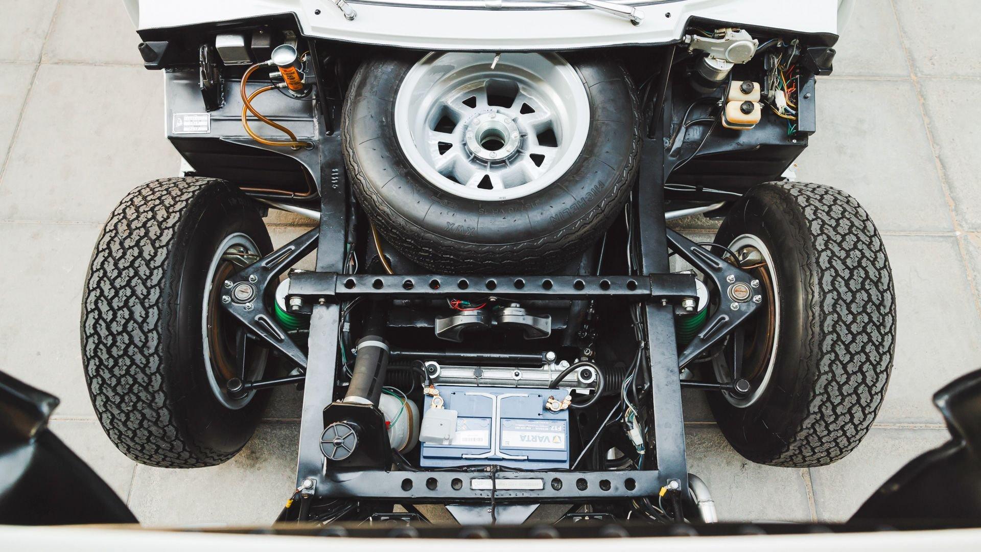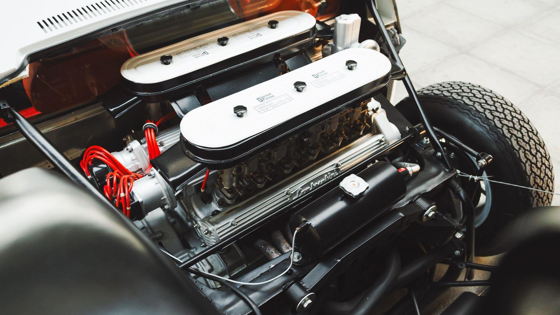 Under Bertone's sleek panels rested a somewhat conventional sports car architecture consisting of upper and lower A-arm suspension with coil springs over telescopic shock absorbers and anti-roll bars at each corner, ventilated disc brakes, and rack-and-pinion steering that granted exceptional handling. It was the Giotto Bizzarrini-designed 3.9-liter V12's transverse, mid-engine geometry that allowed the driver to exploit the engine's 350 horsepower in standard tune on winding roads and high-speed straights alike-reaching a production-car-record top speed of 174 mph.