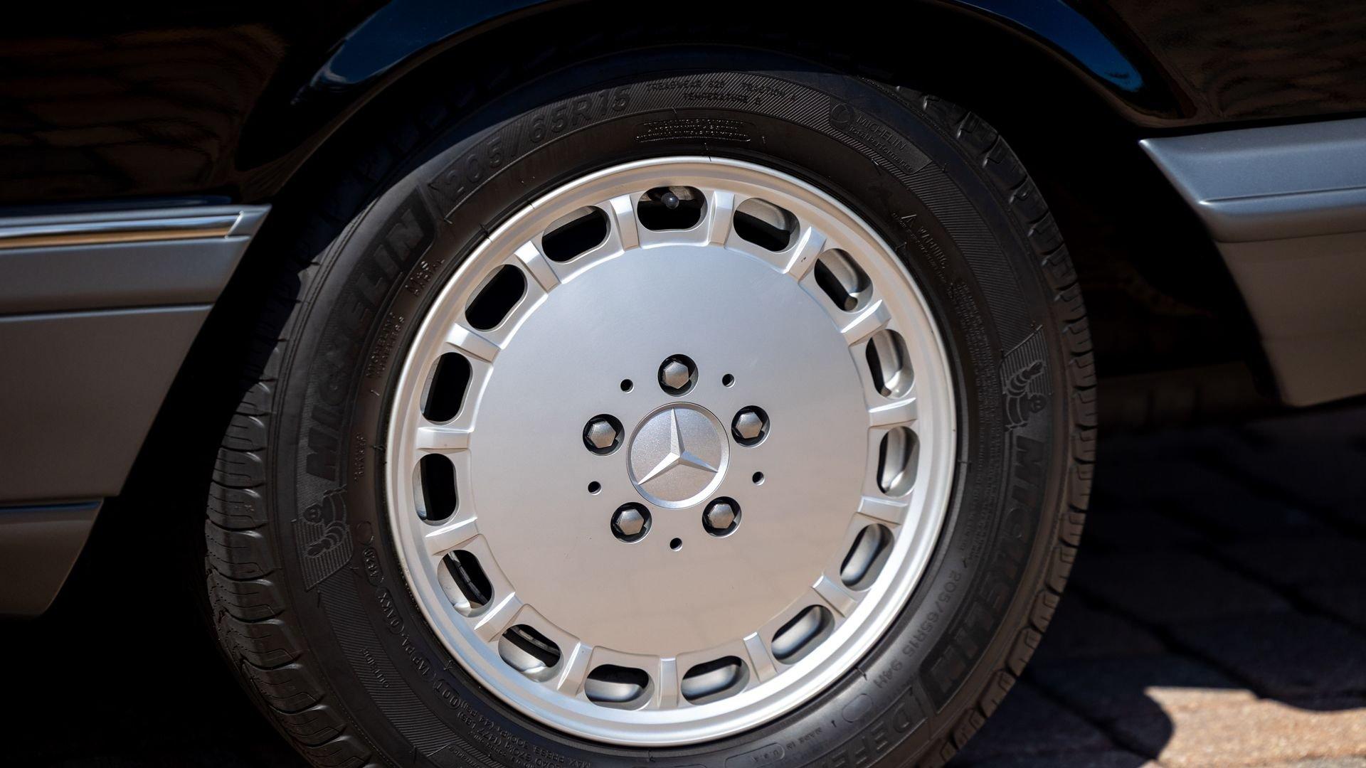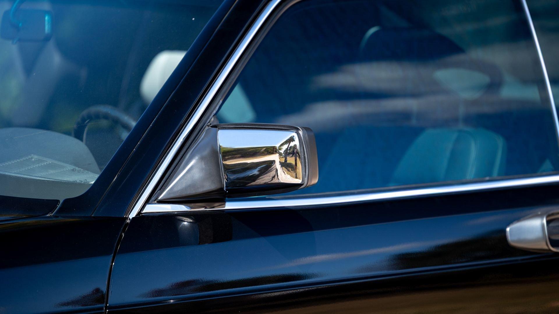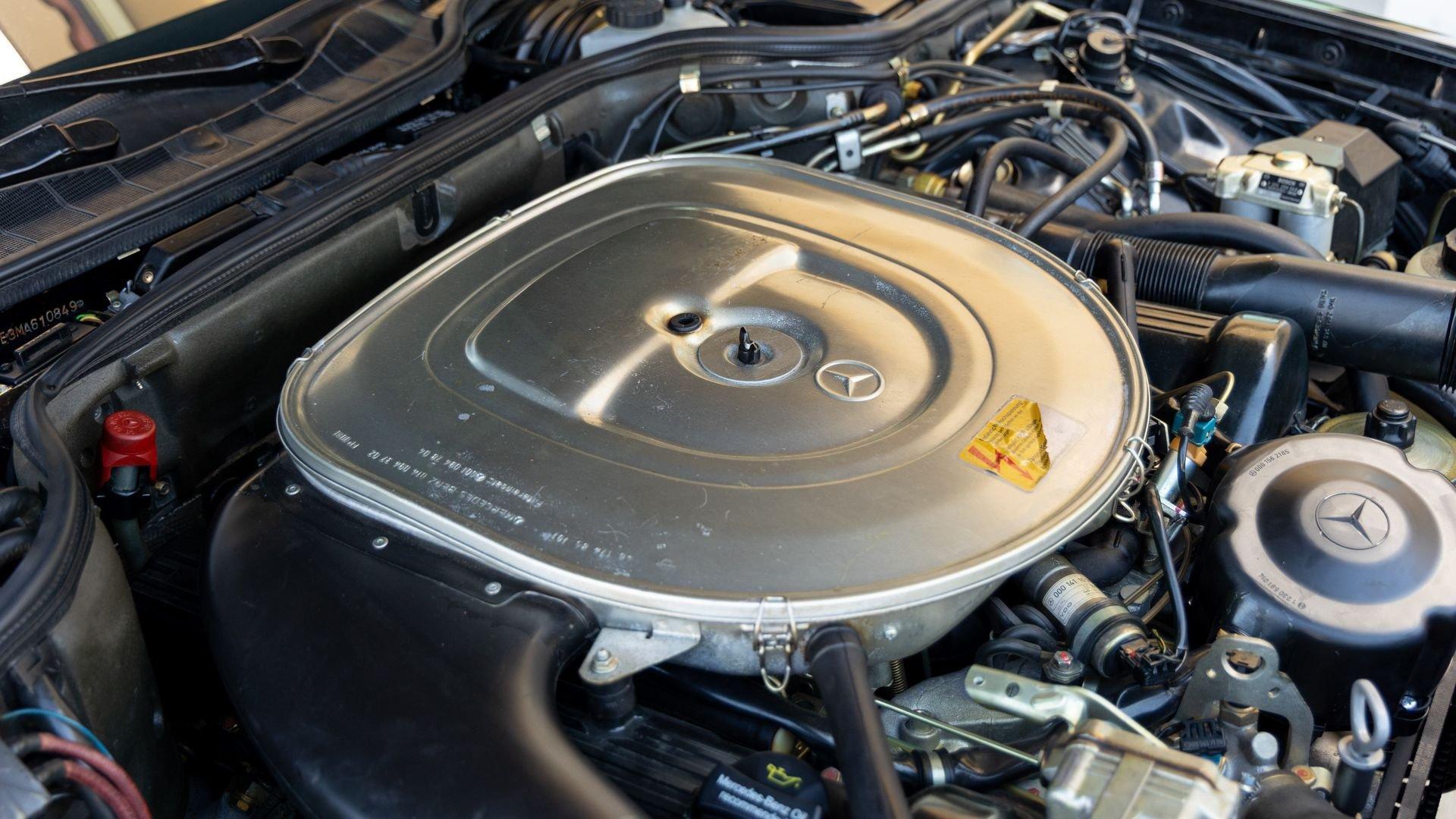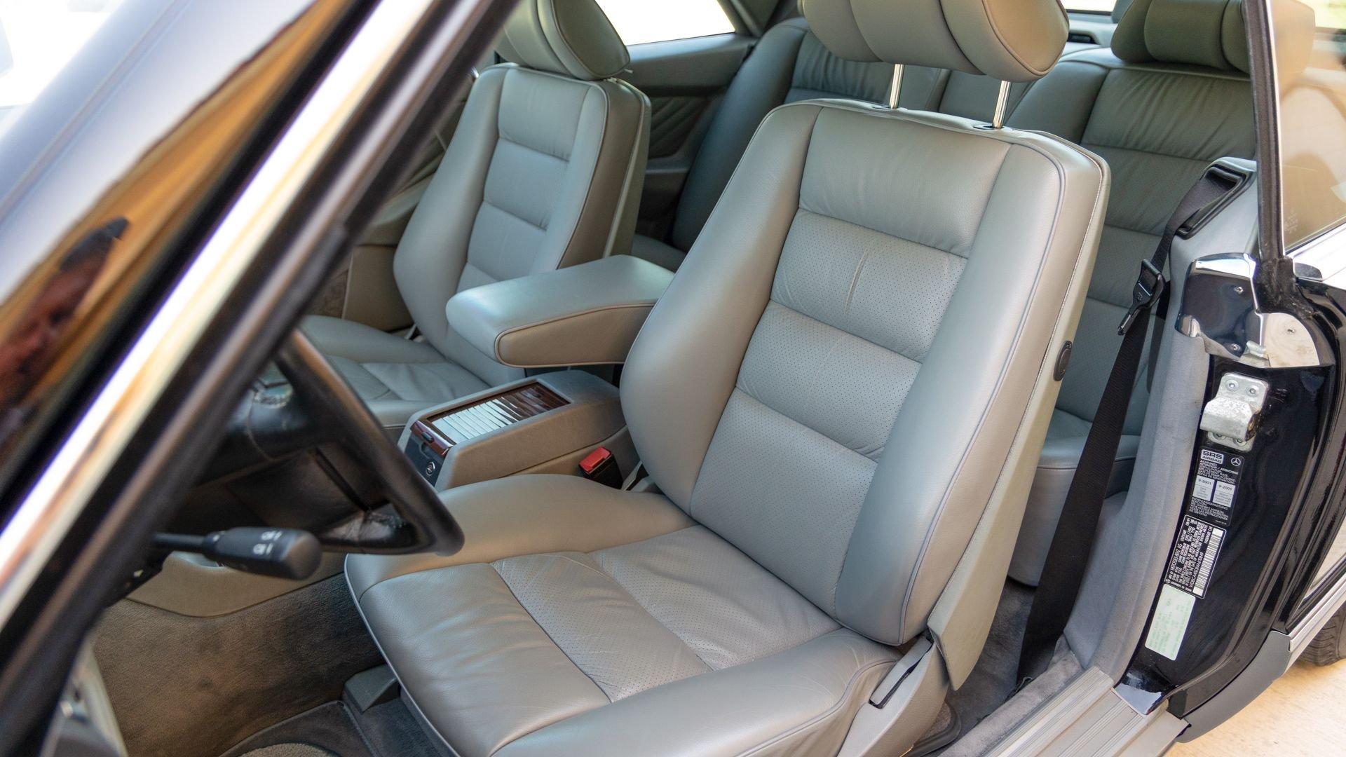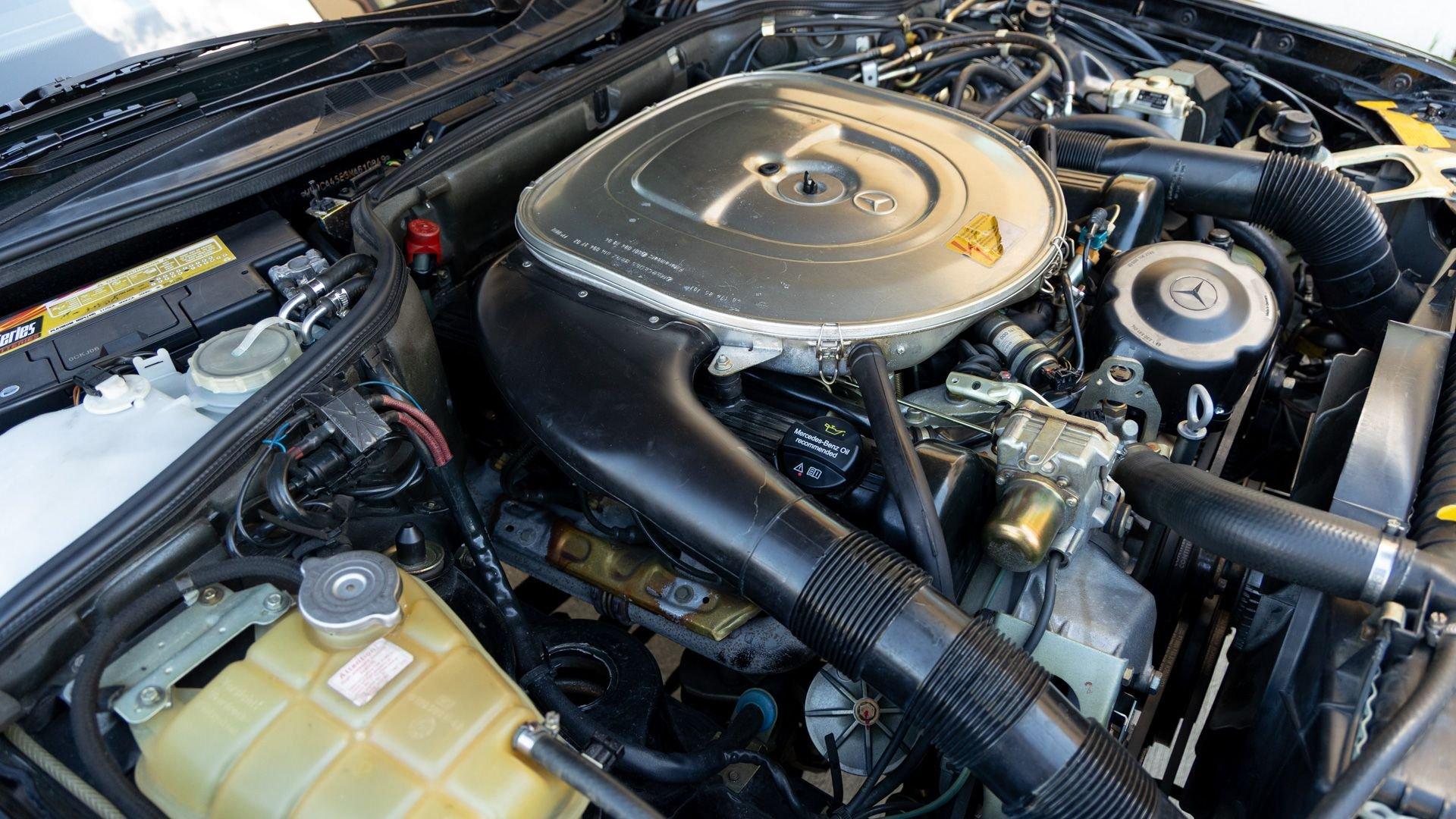 Power came from the refined 5.5-liter M117 V8, producing 238 horsepower and paired with a four-speed automatic transmission. The lengthy list of standard amenities included electric seat-belt presenters, power-adjustable front seats and steering column with two-position memory, a limited-slip differential, self-leveling rear suspension, headlamp wipers, dual front airbags, heated front seats, an electric sliding sunroof with rear pop-up function, town and country horns, and automatic climate control. All of it was housed within Bruno Sacco's restrained and elegant C126 coupe bodywork.