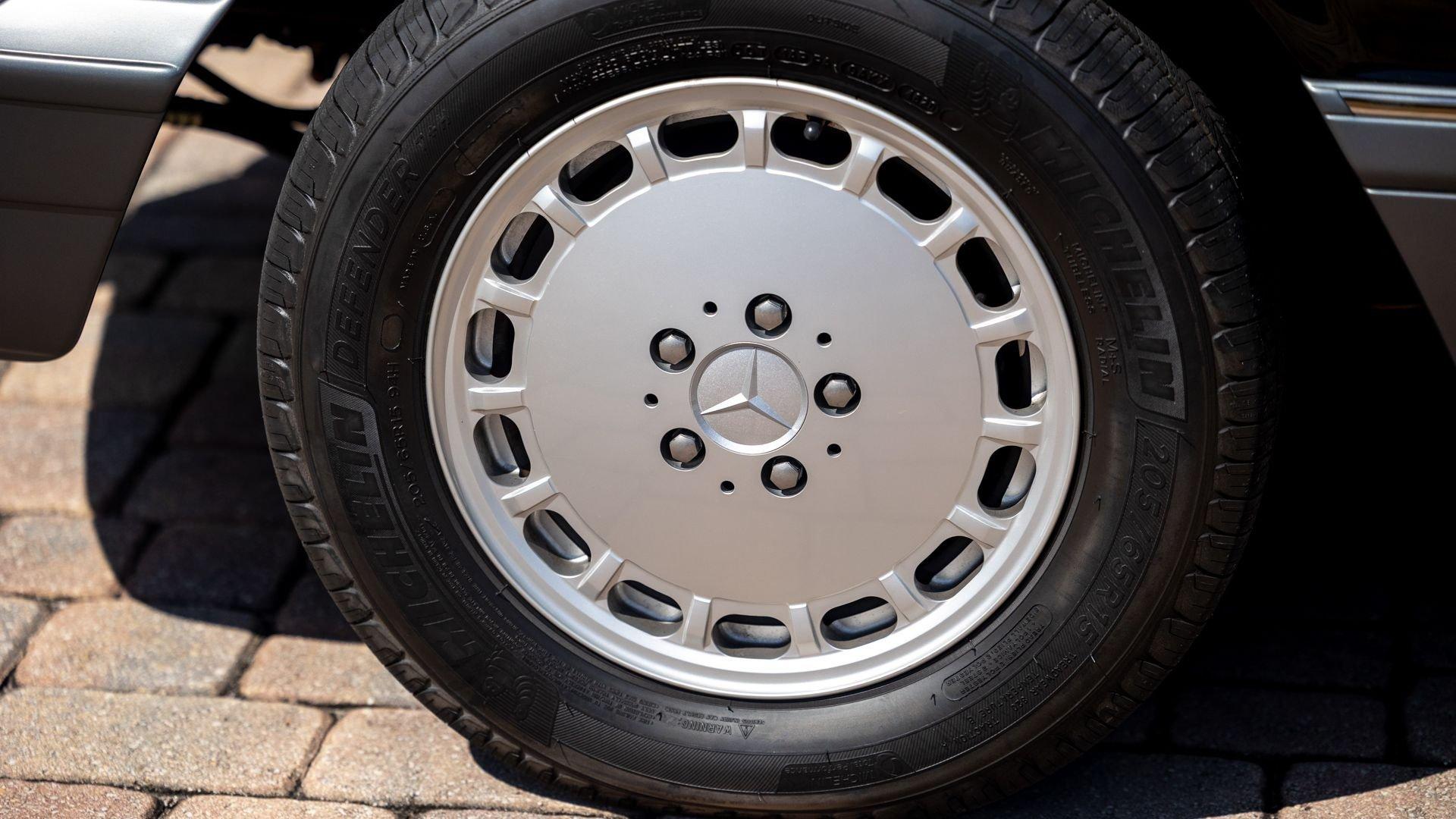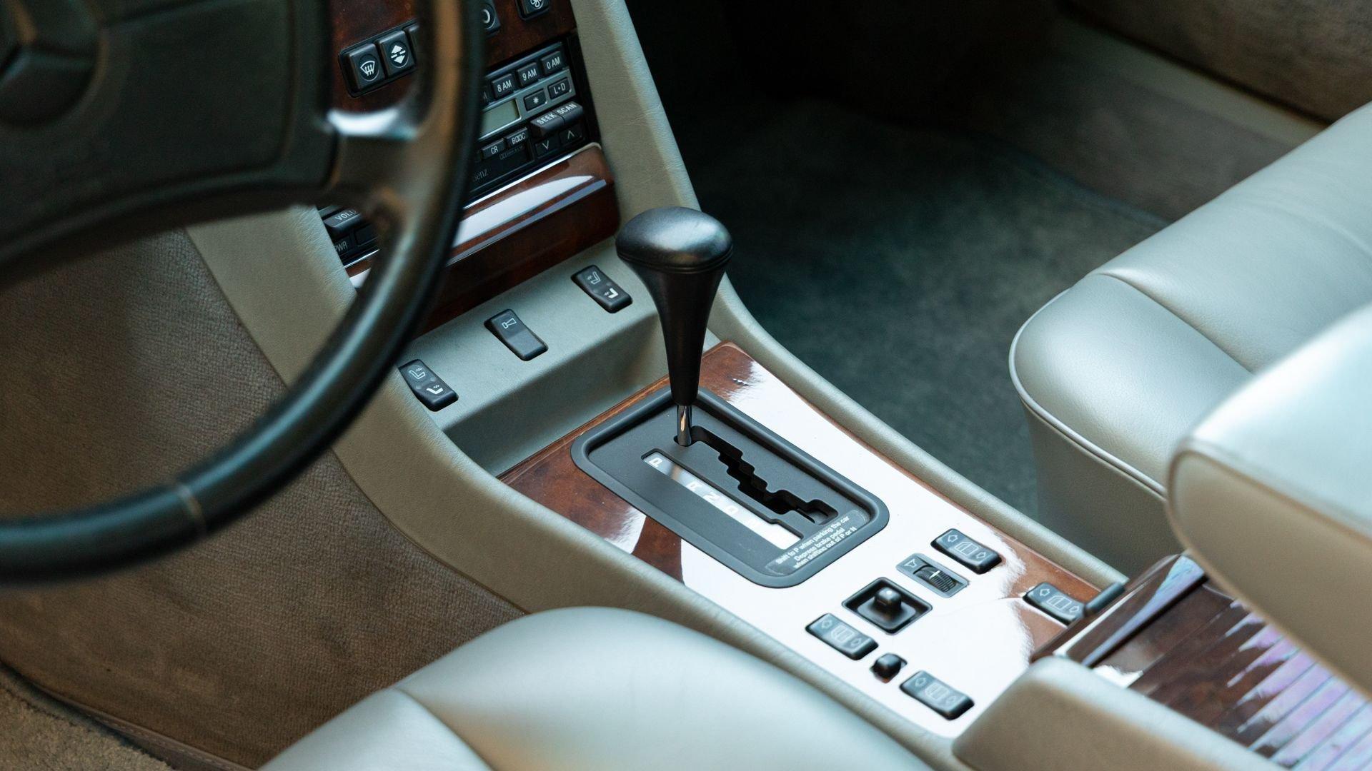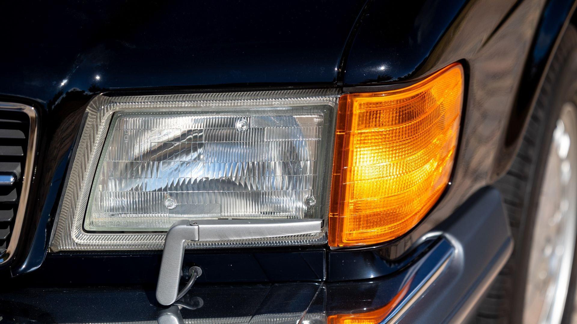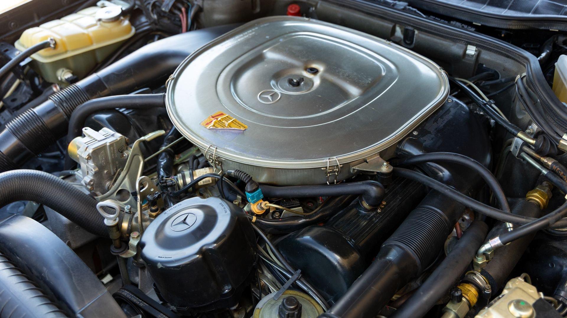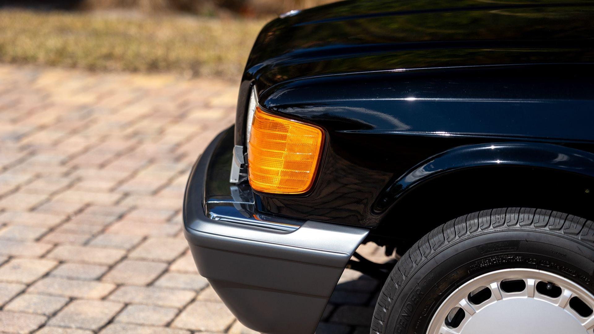Power came from the refined 5.5-liter M117 V8, producing 238 horsepower and paired with a four-speed automatic transmission. The lengthy list of standard amenities included electric seat-belt presenters, power-adjustable front seats and steering column with two-position memory, a limited-slip differential, self-leveling rear suspension, headlamp wipers, dual front airbags, heated front seats, an electric sliding sunroof with rear pop-up function, town and country horns, and automatic climate control. All of it was housed within Bruno Sacco's restrained and elegant C126 coupe bodywork.