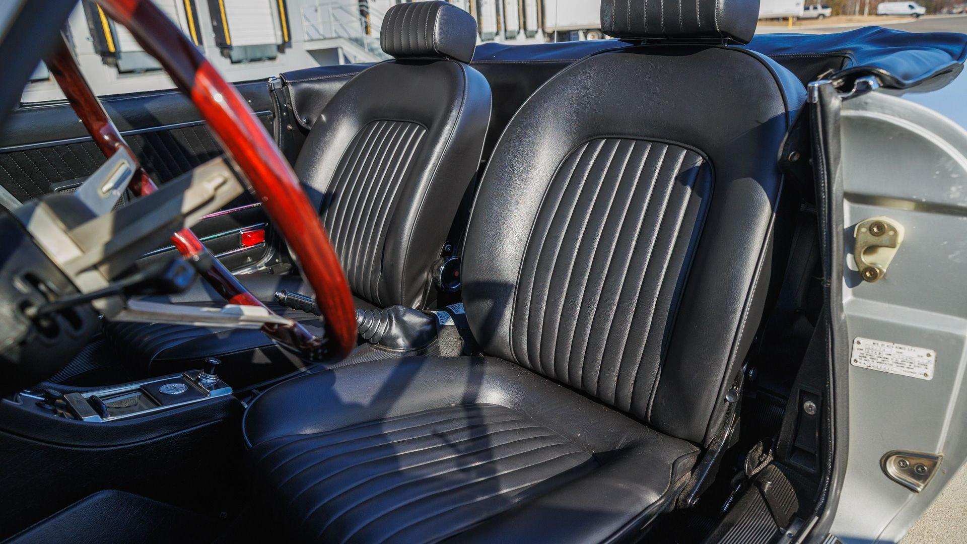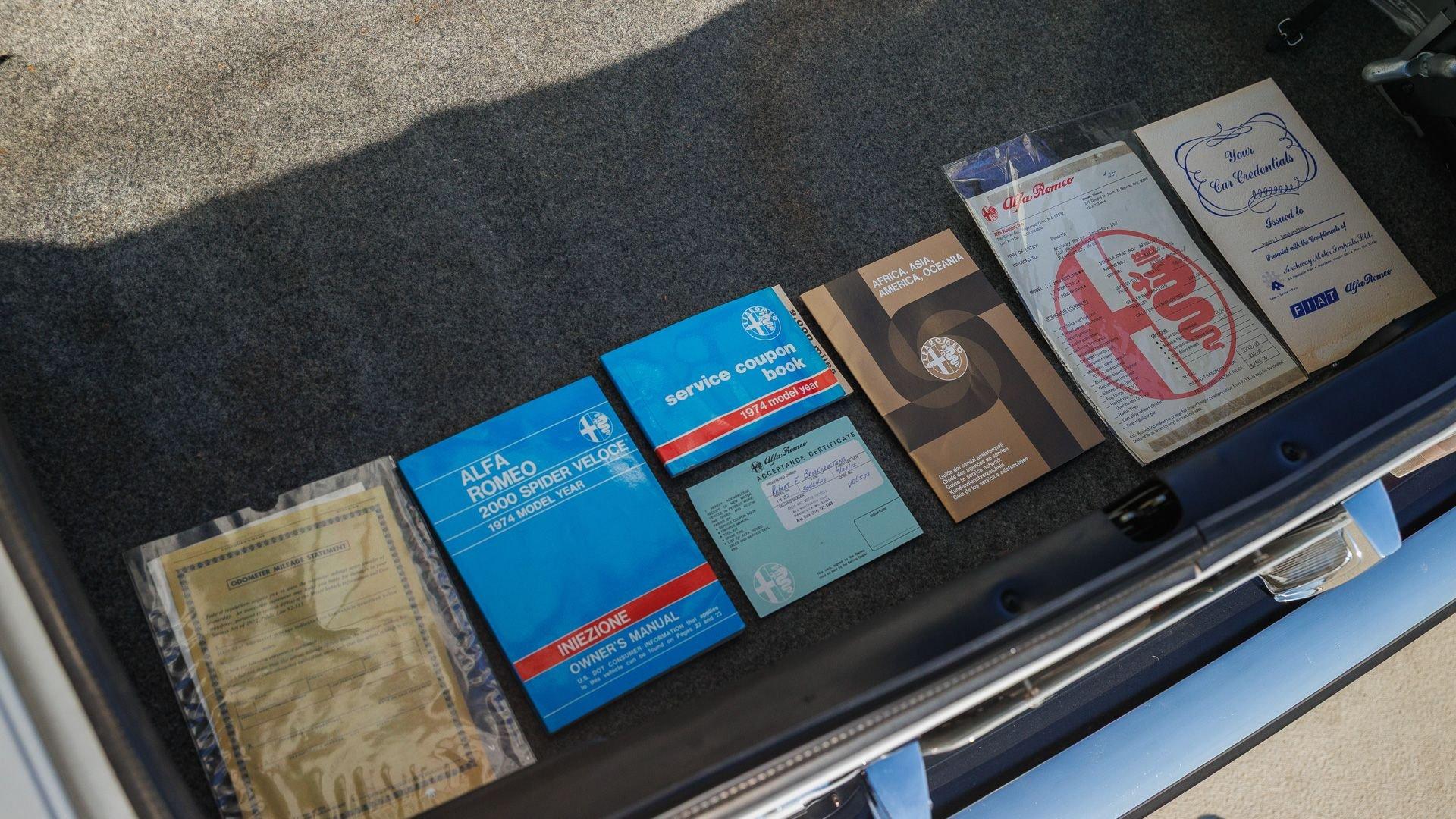 This Series 2 Spider Veloce was initially delivered new through Archway Motor Imports of Manchester, Missouri, with its window sticker listing a total suggested retail price of $7,425. Said to have spent roughly three decades in indoor storage, the Spider later surfaced showing approximately 11,000 miles and was acquired by a New Jersey-based caretaker in 2022. A mechanical refurbishment carried out within this ownership reportedly included resurfacing the cylinder head and installing a replacement head gasket, refinishing the exhaust system, resealing and repainting the fuel tank, and fitting a starter relay, along with replacement of the fuel pump, ignition points and condenser, thermostat, and clutch slave cylinder. The braking system was also refreshed with a replacement master cylinder, overhauled ATE calipers, and resurfaced rotors, while the 14-inch Campagnolo alloys were mounted with fresh 165-series Michelin XAS tires.