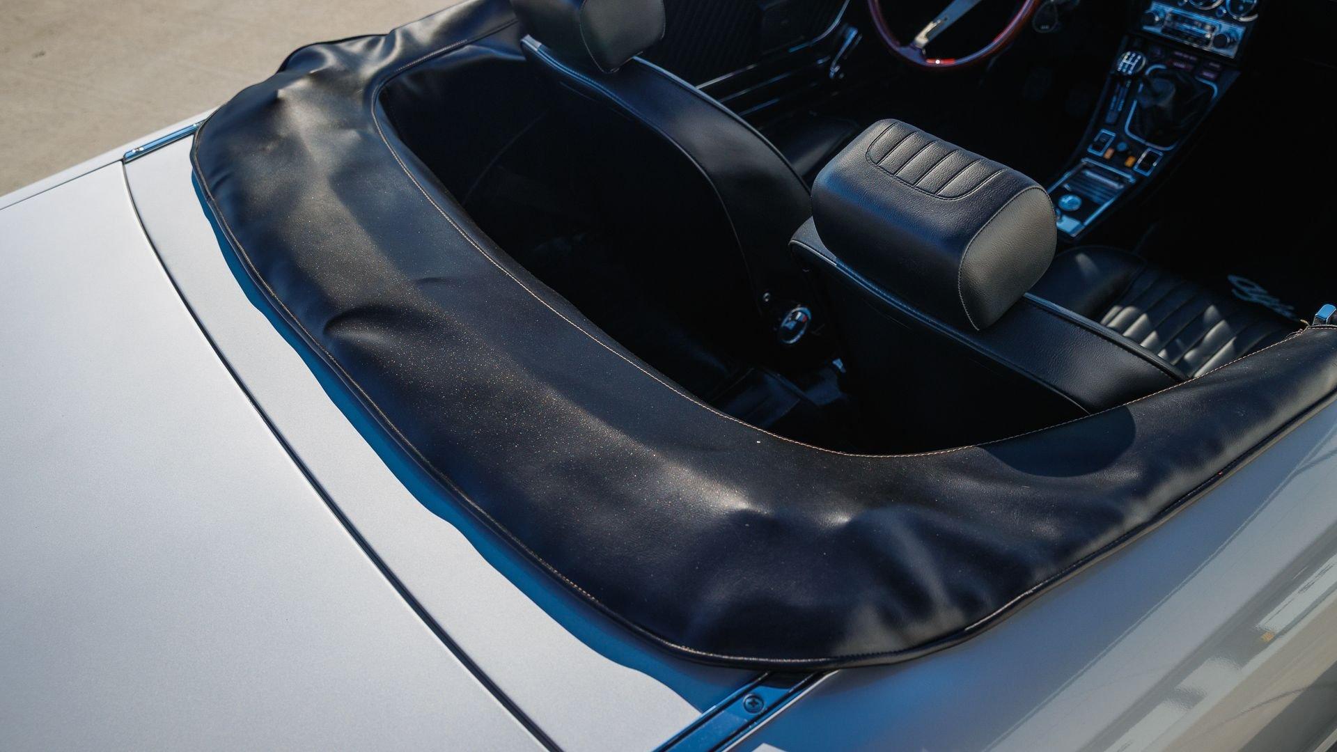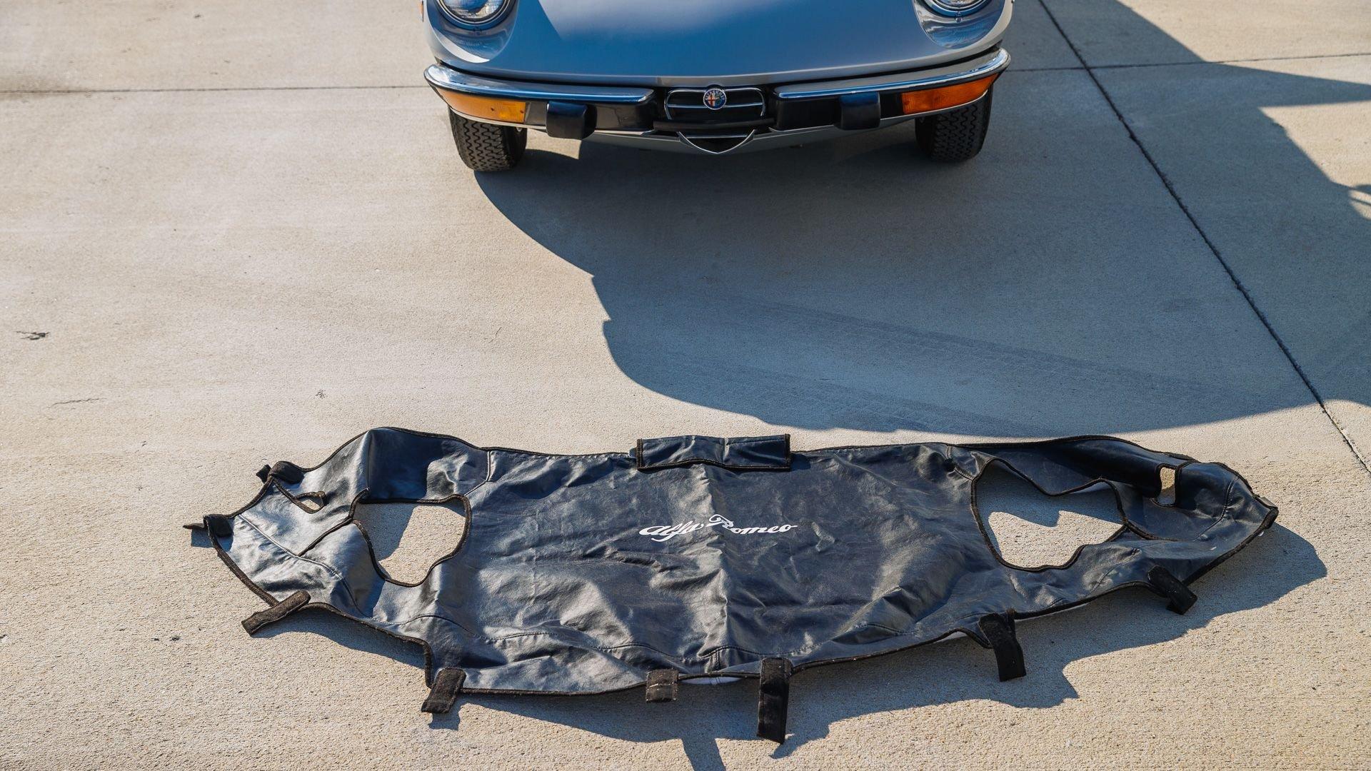 Now attractively presented in Grigio Metallizzato over black vinyl with a black canvas top, it shows 10,521 miles at the time of cataloging and is offered with its window sticker, factory literature, and an Alfa Romeo-branded hood bra-ideal for relaxed, top-down touring.