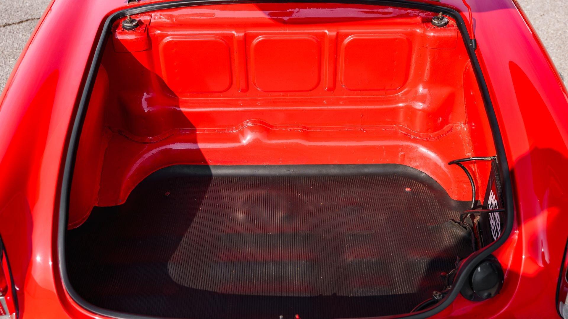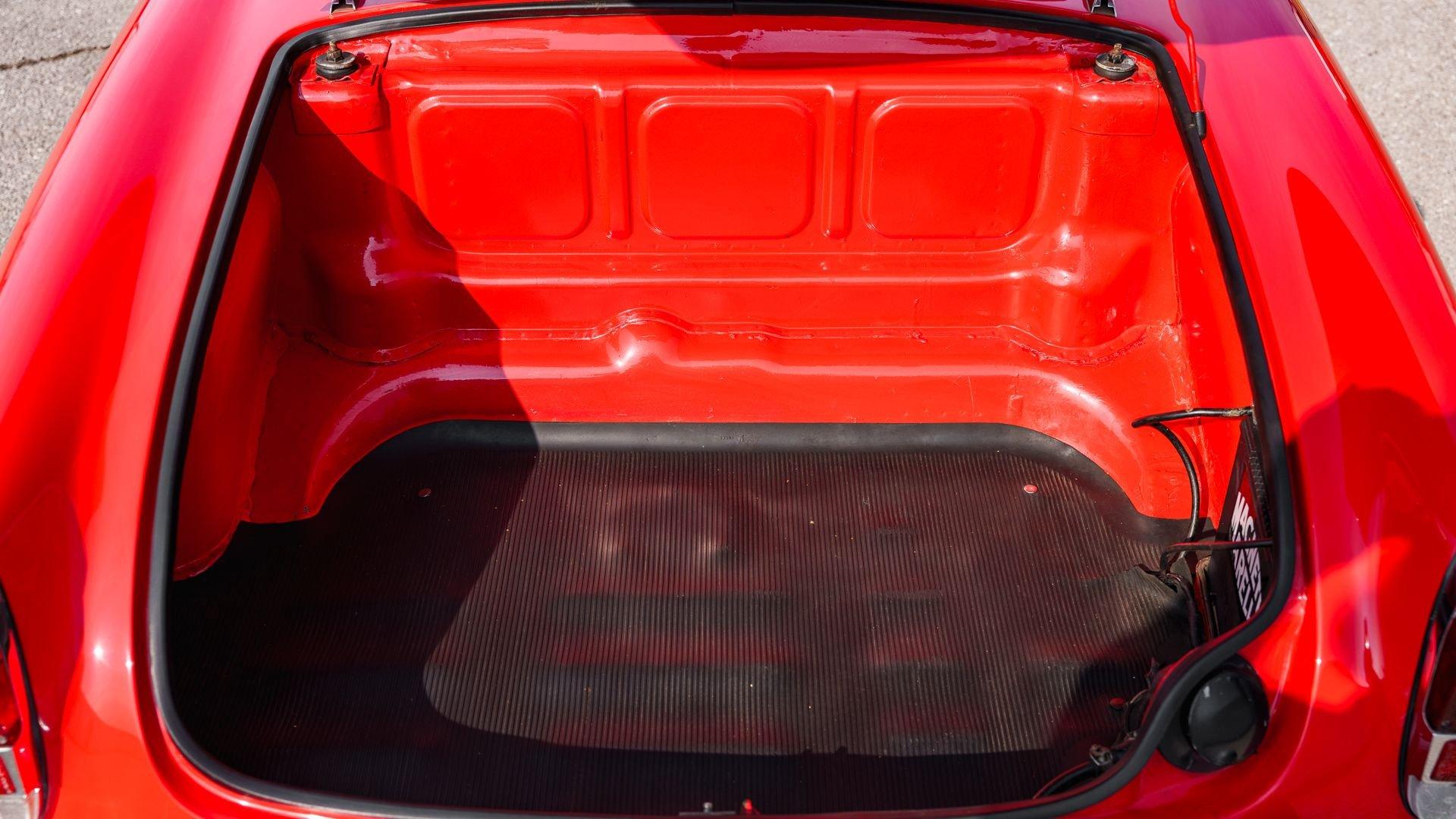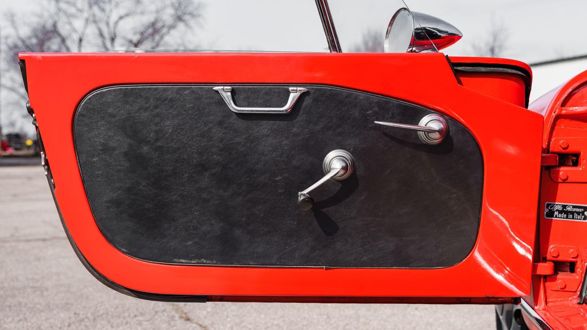 Research indicates that a restoration of this Giulietta Spider was completed by the early-2010s which included fresh paint in red and an interior in black with red carpeting. Simple rubber floor mats, roll-up windows, and lap belts feature in the interior. The dashboard is set with a Blaupunkt radio and Veglia gauges framed by a two-spoke Giulietta Special steering wheel. The engine compartment houses a correct-type aluminum block 1,290-cc twin-cam, which falls in the serial number range as original to the chassis, topped with Weber side-draft carburetors.