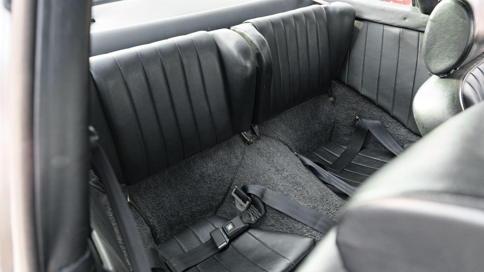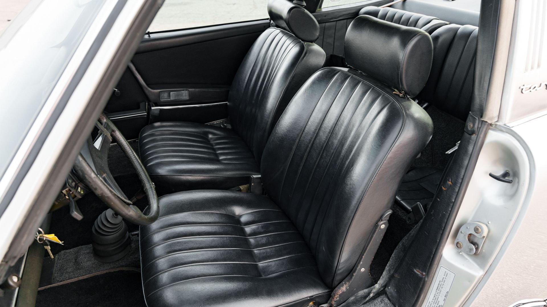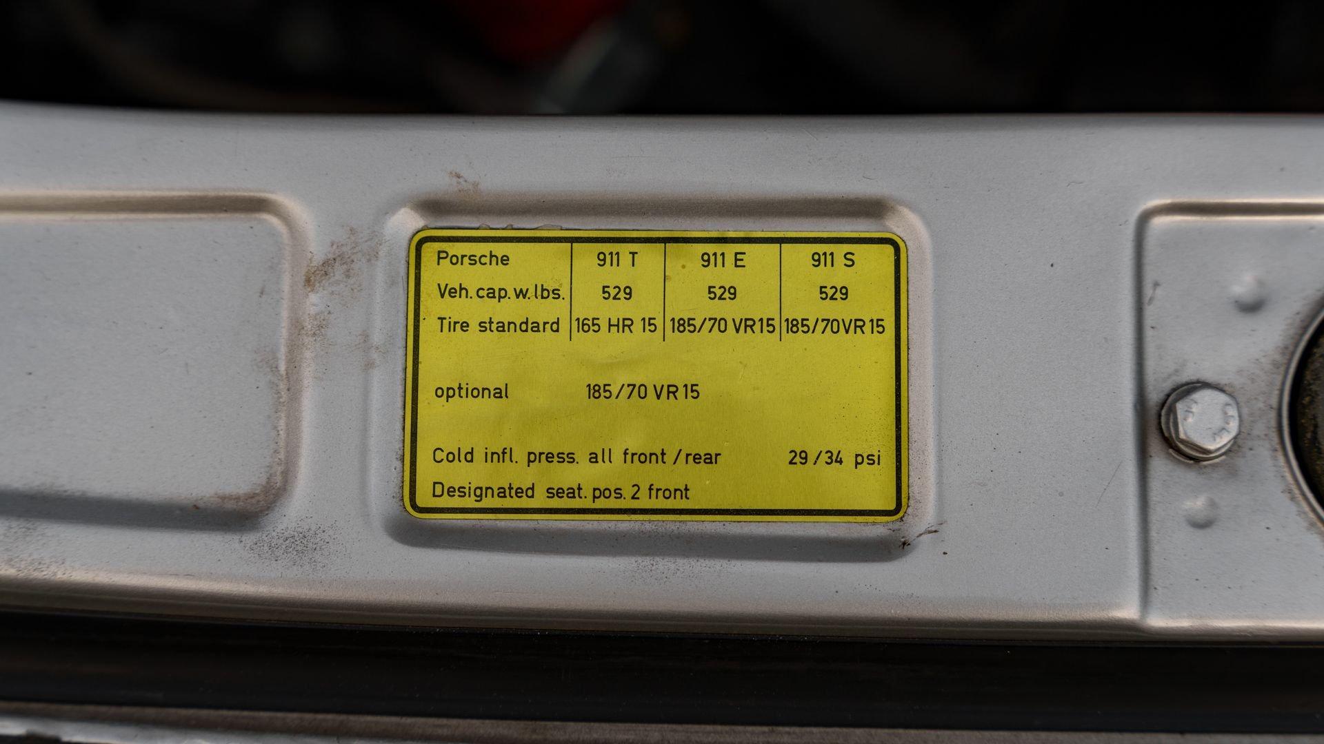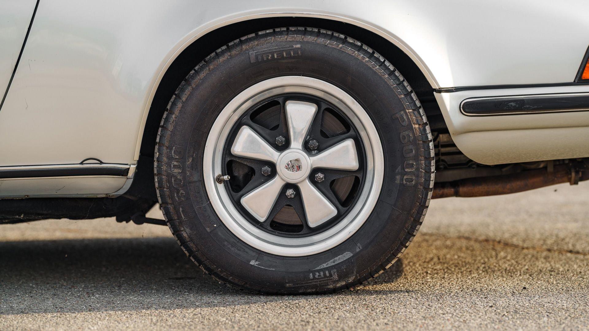 Inside, the cabin is presented with well-preserved black leatherette upholstery and an aftermarket 930S-style three-spoke leather steering wheel, along with familiar 911 appointments including VDO instrumentation, a locking glovebox, side vent windows, and a heater. Riding on 15-inch Fuchs alloy wheels mounted with Pirelli P6000 tires and factory ventilated disc brakes at all four corners, the 911 S Targa offered the hallmark lightness and directness that defined Porsche's final long-hood cars, showing 72,857 miles at the time of cataloging.