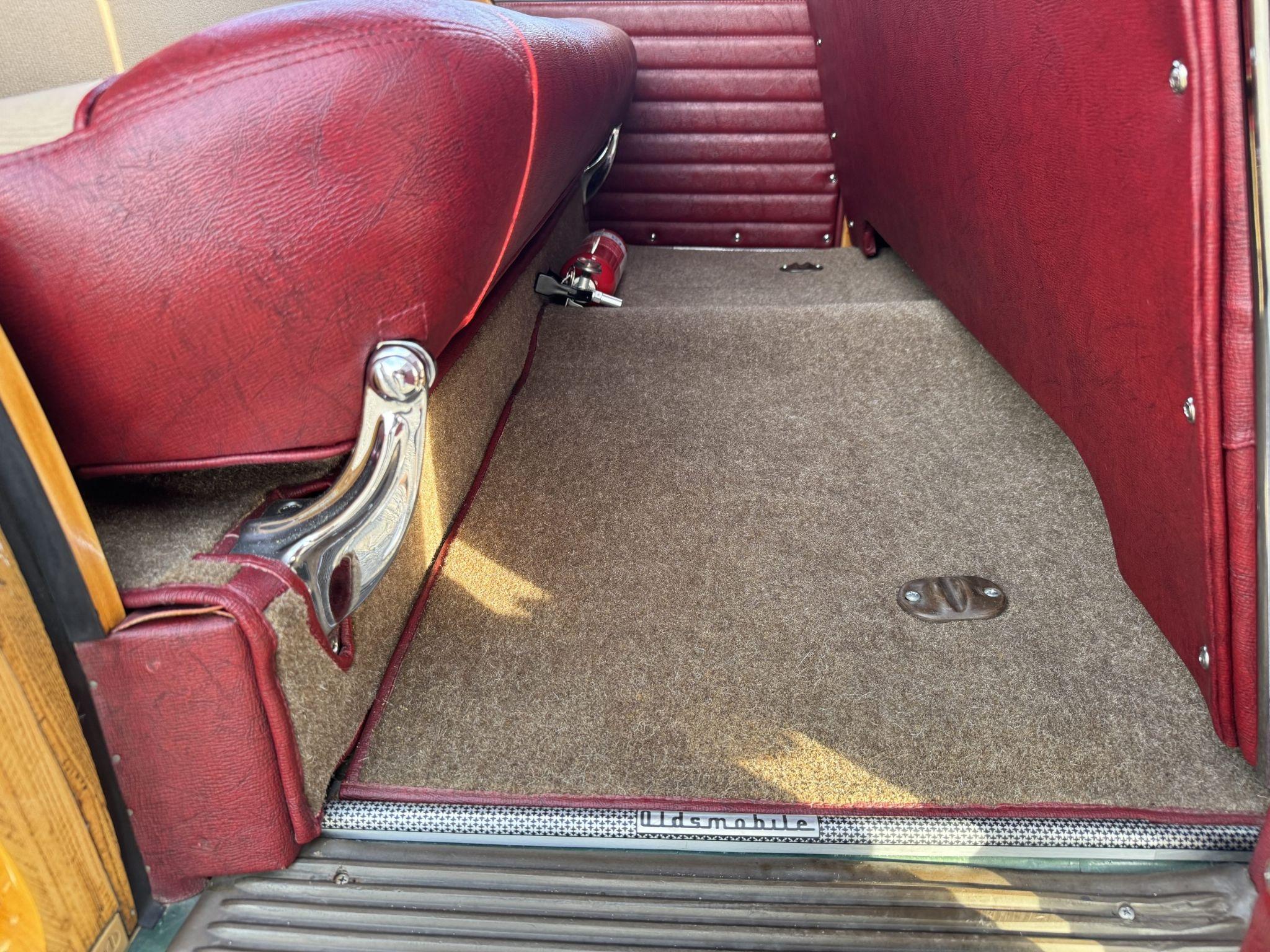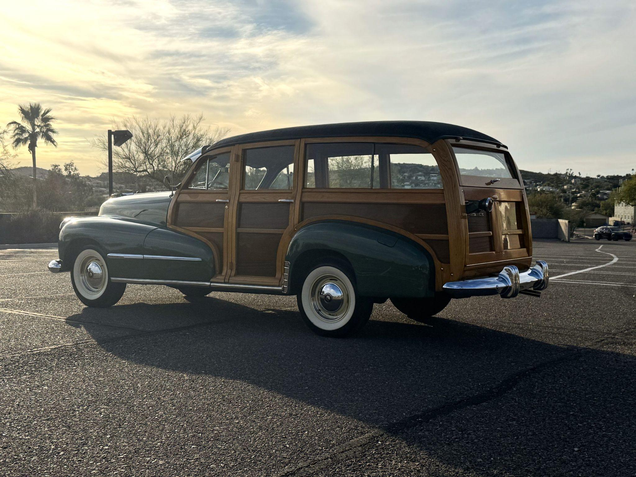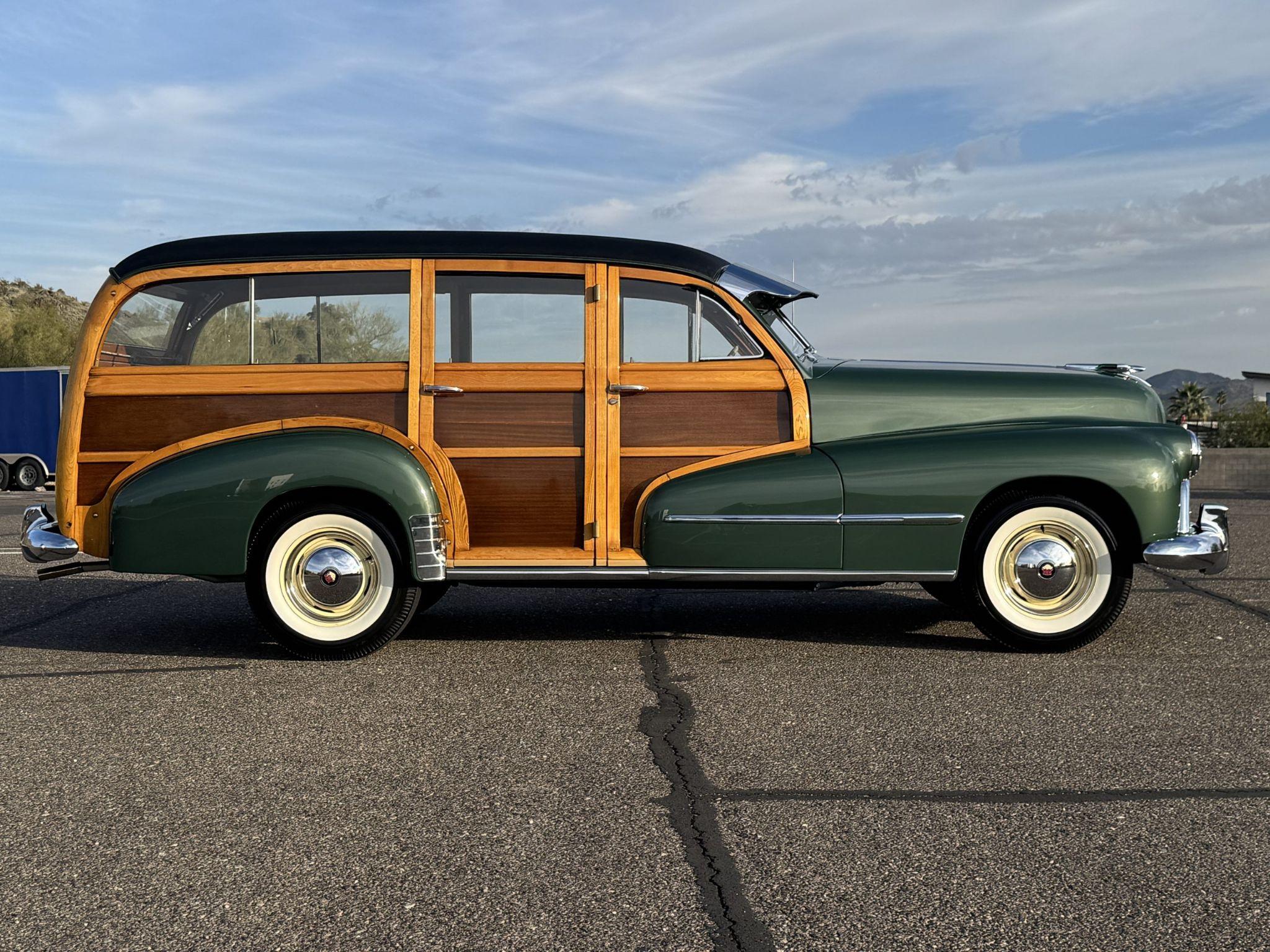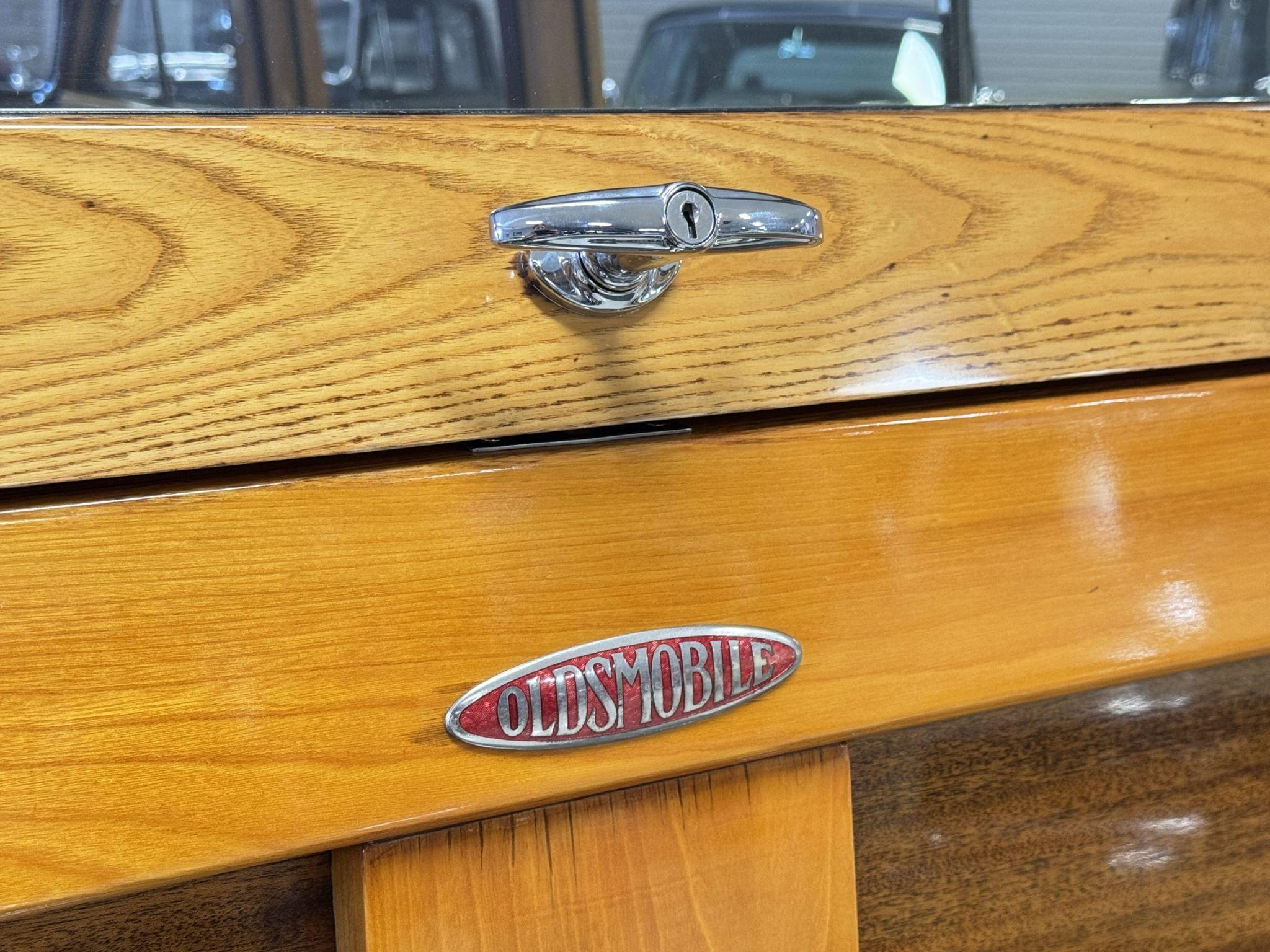 The 1948 Oldsmobile Series 66 Dynamic Deluxe Woodie Wagon represents one of the most refined postwar American family cars, blending craftsmanship, comfort, and restrained style. Powered by the original 238-cubic-inch inline six and equipped with a 4-speed Hydra-Matic automatic transmission, the Oldsmobile is believed to show 55,271 actual miles and presents as a high-quality restored example. With its steel body and Ionia-built ash and mahogany coachwork, the Series 66 is well suited for long-distance touring, regional shows, or inclusion in a distinctive postwar collection. Produced in limited numbers, with just 553 examples built for the 1948 model year, the Series 66 Dynamic Deluxe Woodie Wagon features wood construction by the Ionia Body Company of Michigan, long regarded as General Motors premier wood-body supplier. Originally finished in Nickel Gray, this example is believed to have undergone a frame-off restoration and has been carefully preserved since completion. The Oldsmobile reflects the periods tradition of wood-bodied wagons as upscale multipurpose vehicles, often used for beach outings, resort travel, and family touring, and today offers an authentic representation of that postwar lifestyle. The exterior presents in Ivy Green paint with deep, even luster, complemented by richly finished ash and mahogany side and rear panels that remain in excellent condition. The dark green textured vinyl roof is clean and well fitted, while the split front windshield, exterior sun shield, and brightwork all present strongly. The distinctive Oldsmobile grille and bomber style chrome and green hood handle remain crisp, and the headlamp glass is clear and fully functional. A two-piece tailgate with a tilting glass vent window adds practicality, while steel wheels with Oldsmobile-logo hubcaps and wide whitewall tires in very good condition complete the period-correct appearance. Inside, the Series 66 features dual bench seating trimmed in the original-style tan cloth and maroon vinyl, offering accommodation for six passengers in a warm, inviting cabin. The wood paneling and interior accents remain in excellent condition and reinforce the craftsmanship associated with Ionia-built wagons. The maroon and chrome dashboard appears fresh, housing a 0110 mph speedometer and full auxiliary gauges, all framed by an ivory deluxe steering wheel. The clock is operational, the AM radio powers on without sound output, and all interior lighting functions as designed. Manual windows and tilt features provide natural airflow, while the folding passenger bench expands rear cargo space in traditional station wagon fashion. Mechanical power is supplied by the original 238-cubic-inch inline six, paired with a column-shifted 4-speed Hydra-Matic automatic transmission. The Series 66 delivers modest, relaxed performance consistent with its touring-focused design, aided by power-assisted steering and responsive hydraulic drum brakes. The Oldsmobile does not feature turn signals, consistent with the era, and retains a straightforward mechanical layout that emphasizes smooth operation and reliability. Included with the sale are original manuals, a jack, trunk-mounted spare tire, fire extinguisher, recent inspection report and a clean title. For more information and details, please call or text Kendi Brown at 1.623.404.9042 or email us at sales@classicpromenade.com . This 1948 Oldsmobile Series 66 Dynamic Deluxe Woodie Wagon is available for inspection at our showroom in Phoenix. We are pleased to offer FaceTime or WhatsApp live video inspections, and we help coordinate shipping worldwide. We also have financing partners if you are interested in financing.