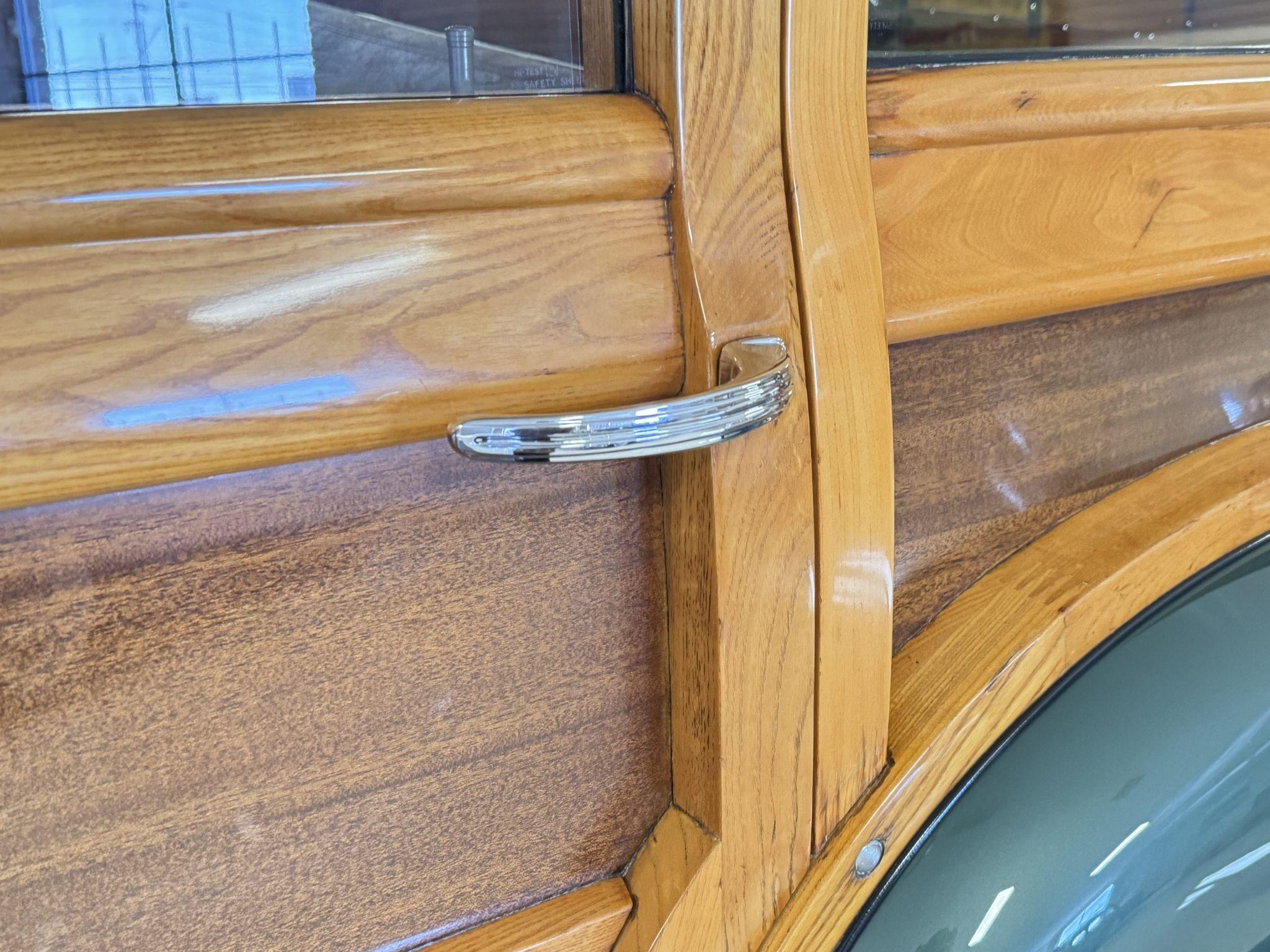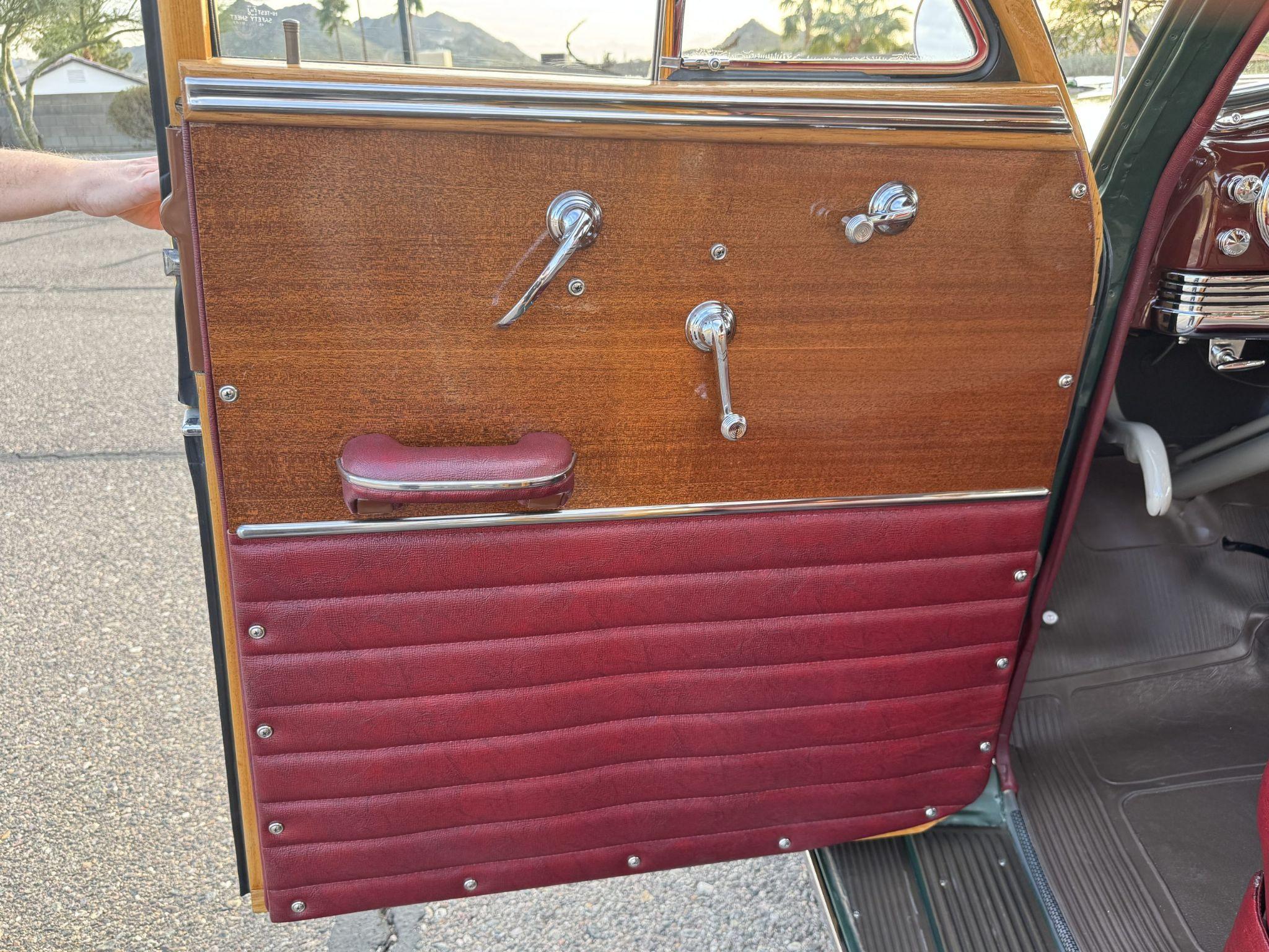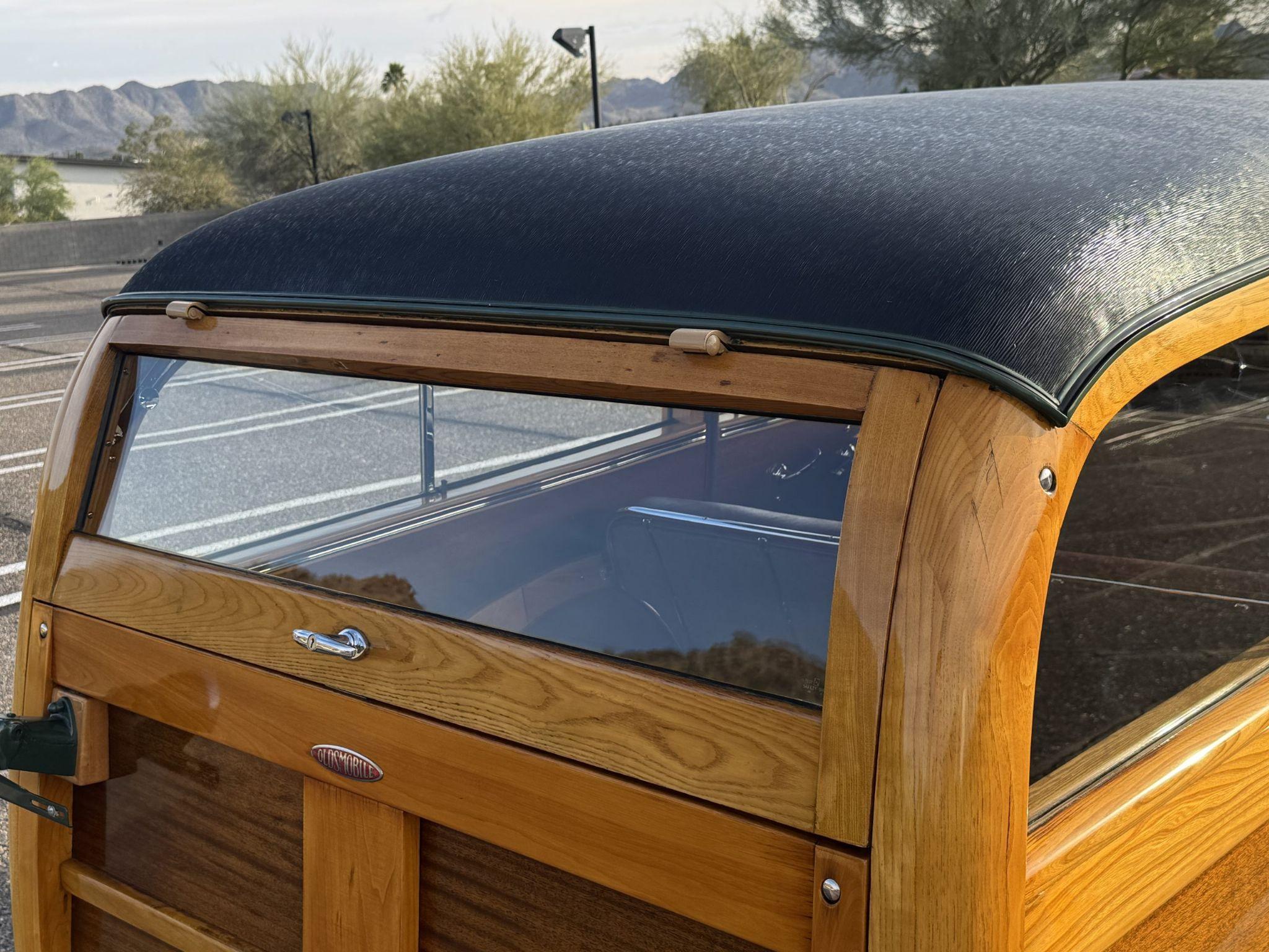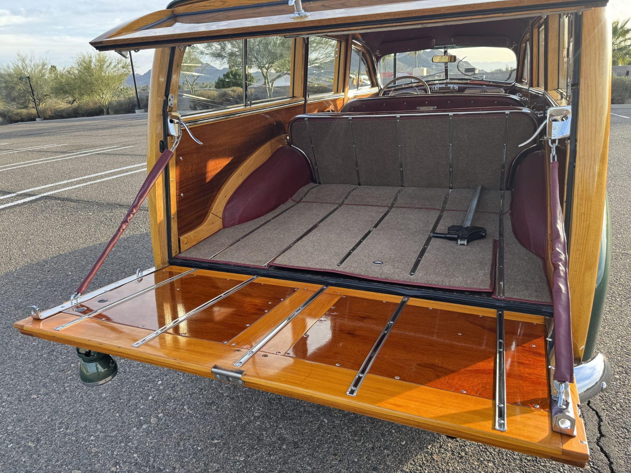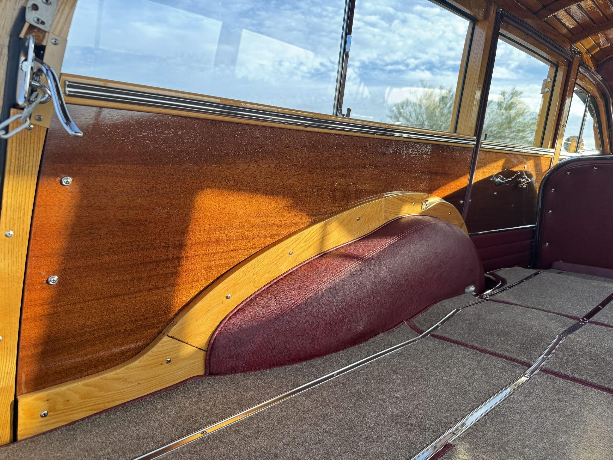 The 1948 Oldsmobile Series 66 Dynamic Deluxe Woodie Wagon represents one of the most refined postwar American family cars, blending craftsmanship, comfort, and restrained style. Powered by the original 238-cubic-inch inline six and equipped with a 4-speed Hydra-Matic automatic transmission, the Oldsmobile is believed to show 55,271 actual miles and presents as a high-quality restored example. With its steel body and Ionia-built ash and mahogany coachwork, the Series 66 is well suited for long-distance touring, regional shows, or inclusion in a distinctive postwar collection. Produced in limited numbers, with just 553 examples built for the 1948 model year, the Series 66 Dynamic Deluxe Woodie Wagon features wood construction by the Ionia Body Company of Michigan, long regarded as General Motors premier wood-body supplier. Originally finished in Nickel Gray, this example is believed to have undergone a frame-off restoration and has been carefully preserved since completion. The Oldsmobile reflects the periods tradition of wood-bodied wagons as upscale multipurpose vehicles, often used for beach outings, resort travel, and family touring, and today offers an authentic representation of that postwar lifestyle. The exterior presents in Ivy Green paint with deep, even luster, complemented by richly finished ash and mahogany side and rear panels that remain in excellent condition. The dark green textured vinyl roof is clean and well fitted, while the split front windshield, exterior sun shield, and brightwork all present strongly. The distinctive Oldsmobile grille and bomber style chrome and green hood handle remain crisp, and the headlamp glass is clear and fully functional. A two-piece tailgate with a tilting glass vent window adds practicality, while steel wheels with Oldsmobile-logo hubcaps and wide whitewall tires in very good condition complete the period-correct appearance. Inside, the Series 66 features dual bench seating trimmed in the original-style tan cloth and maroon vinyl, offering accommodation for six passengers in a warm, inviting cabin. The wood paneling and interior accents remain in excellent condition and reinforce the craftsmanship associated with Ionia-built wagons. The maroon and chrome dashboard appears fresh, housing a 0110 mph speedometer and full auxiliary gauges, all framed by an ivory deluxe steering wheel. The clock is operational, the AM radio powers on without sound output, and all interior lighting functions as designed. Manual windows and tilt features provide natural airflow, while the folding passenger bench expands rear cargo space in traditional station wagon fashion. Mechanical power is supplied by the original 238-cubic-inch inline six, paired with a column-shifted 4-speed Hydra-Matic automatic transmission. The Series 66 delivers modest, relaxed performance consistent with its touring-focused design, aided by power-assisted steering and responsive hydraulic drum brakes. The Oldsmobile does not feature turn signals, consistent with the era, and retains a straightforward mechanical layout that emphasizes smooth operation and reliability. Included with the sale are original manuals, a jack, trunk-mounted spare tire, fire extinguisher, recent inspection report and a clean title. For more information and details, please call or text Kendi Brown at 1.623.404.9042 or email us at sales@classicpromenade.com . This 1948 Oldsmobile Series 66 Dynamic Deluxe Woodie Wagon is available for inspection at our showroom in Phoenix. We are pleased to offer FaceTime or WhatsApp live video inspections, and we help coordinate shipping worldwide. We also have financing partners if you are interested in financing.