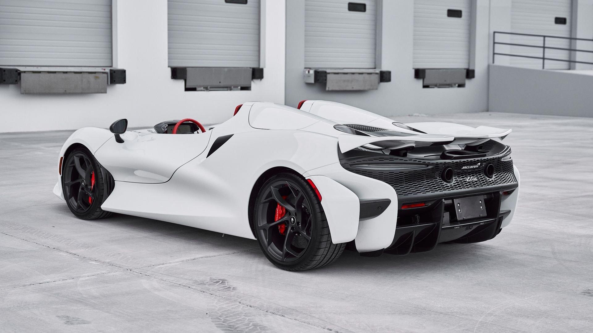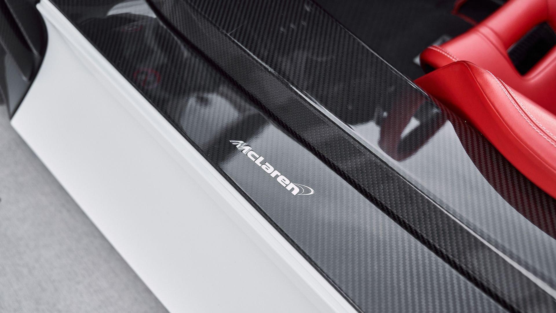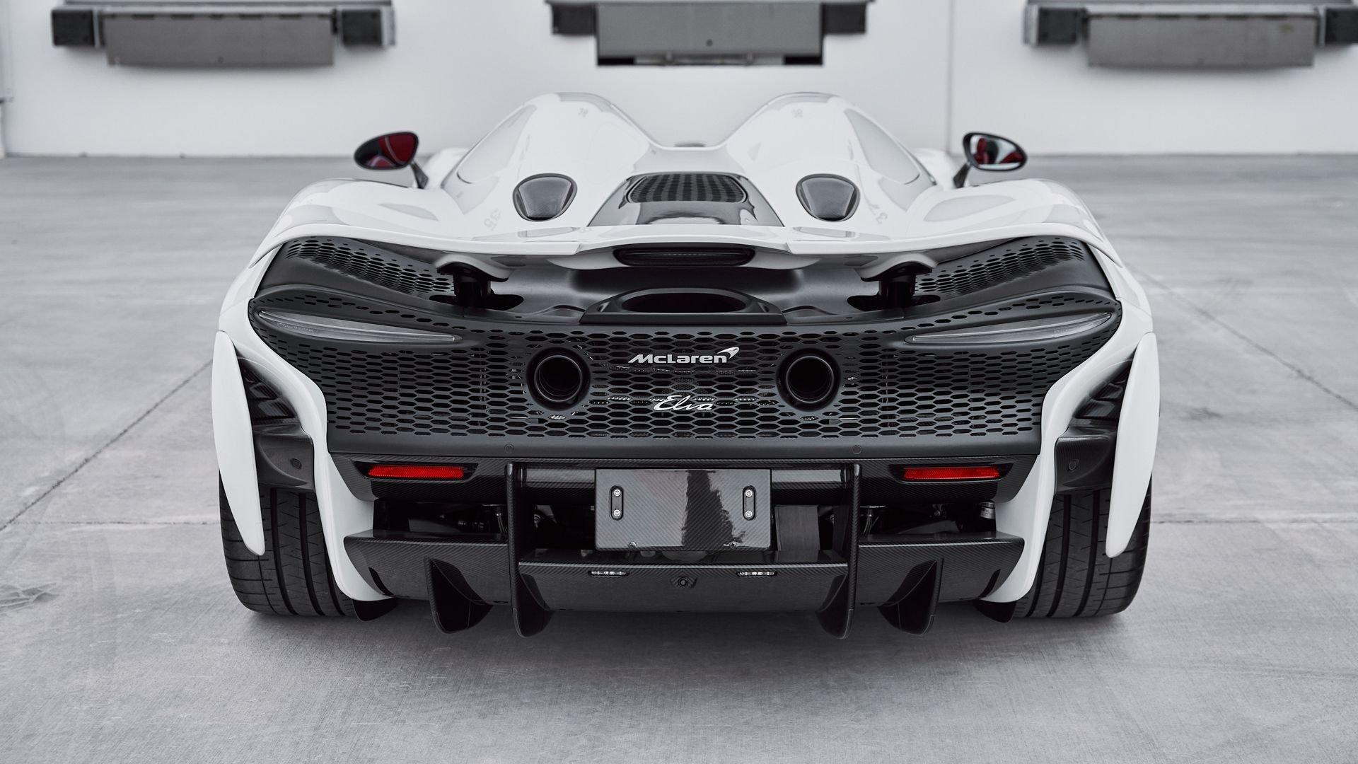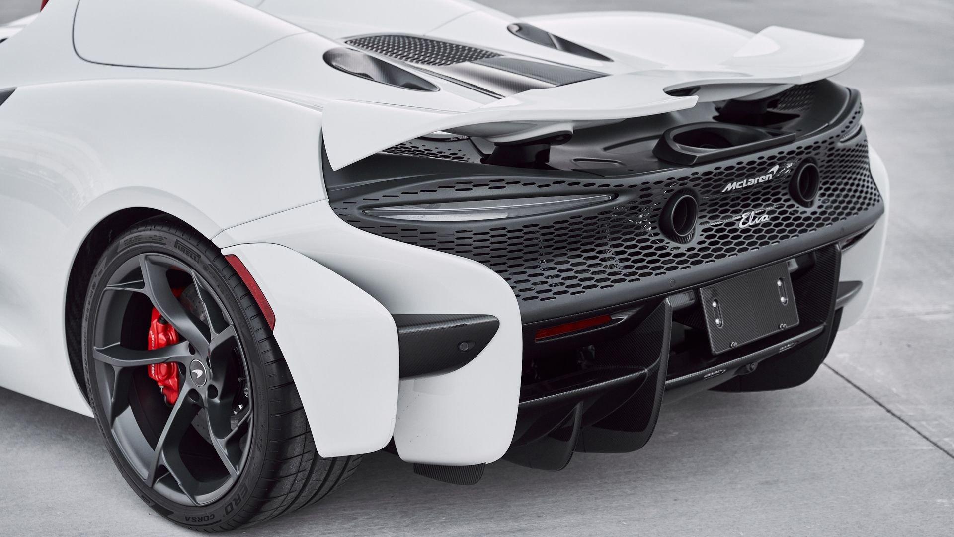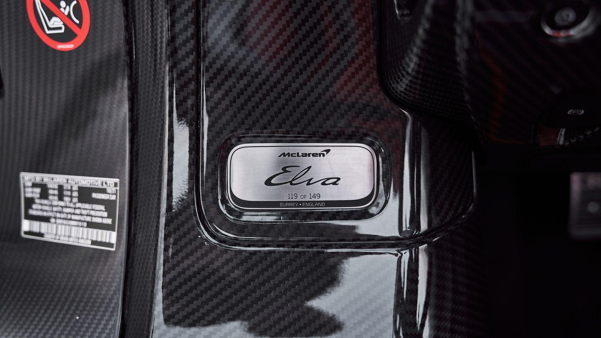 Composed of just three carbon fiber panels, the lightweight bodywork provides a clean, sculpted profile that is heavily inspired by Formula One and represents the next chapter in the McLaren design story. Embodying bold forms, clean lines, and fluid movement, the Elva features a seamless transition between the interior and exterior allowing for stunning proportions from every angle highlighted by machined solid metal and carbon fiber details.
