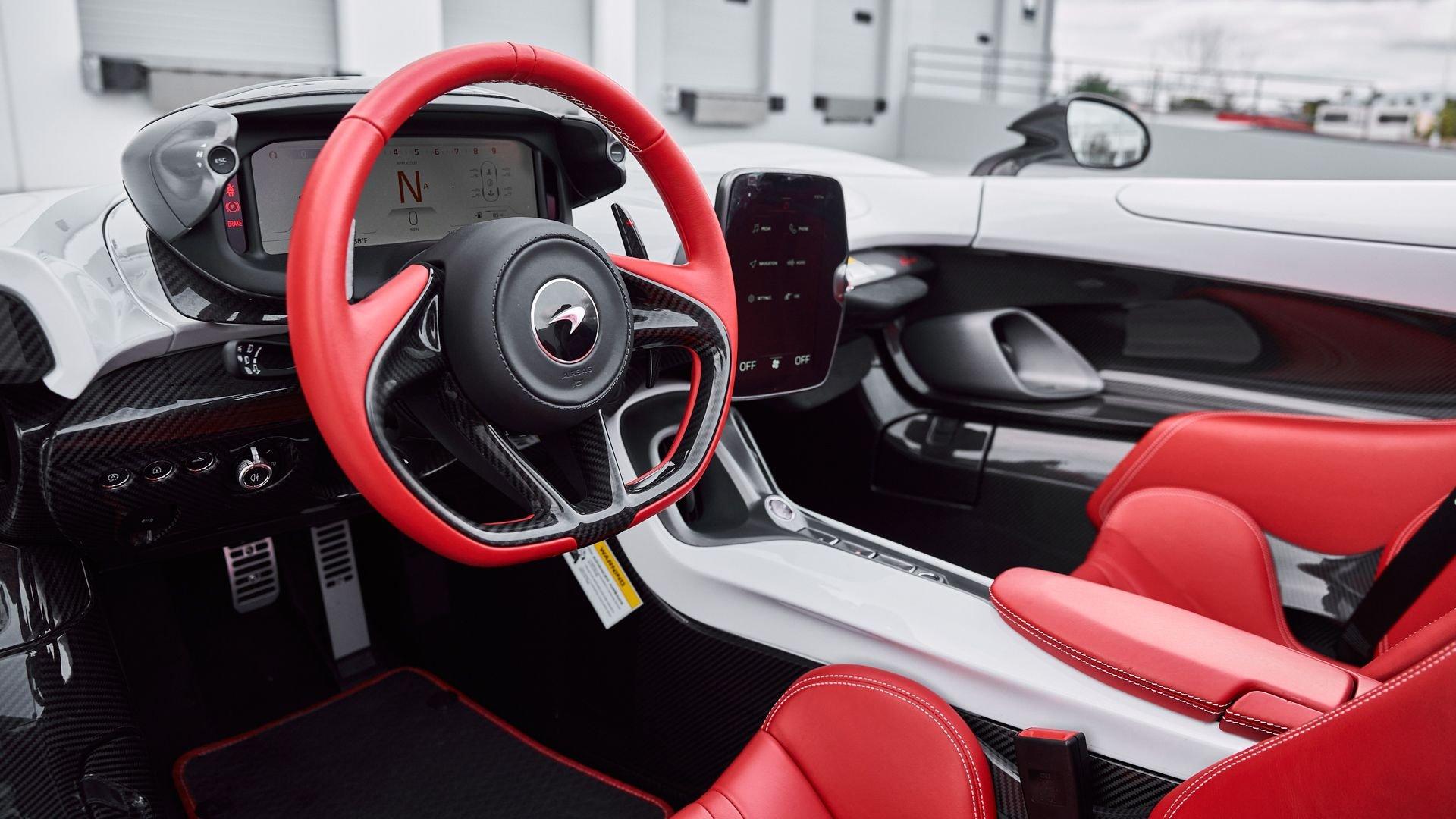 This 2021 McLaren Elva is number 119 of only 149 examples produced and is finished in Silica White. It has been heavily tailored with over $60,000 in bespoke options inside and out, notably featuring McLaren's 5-Spoke Super-Lightweight wheels shod in Pirelli P Zero Corsa tires, Red titanium brake calipers, and MSO mirror caps, mid-finisher, and Active Air Management System (AAMS). Without a windshield to block the view of the Elva's cockpit, many of the bespoke appointments of the Elva's interior are easy to spot even without raising the signature McLaren dihedral doors. Its MSO Red leather interior is thoughtfully contrasted with white MSO stitching that seamlessly mirrors the exterior paint, along with Galvanic Gray front and rear brightwork plus many bespoke touches including MSO headrests, steering wheel center marker, binnacle, shift paddles, and floor mats. The interior is further trimmed in Gloss Carbon Fiber; a sophisticated reminder of the Elva's track-focused philosophy and the carbon fiber MonoCage that has underpinned all McLarens since the MP4-12C.