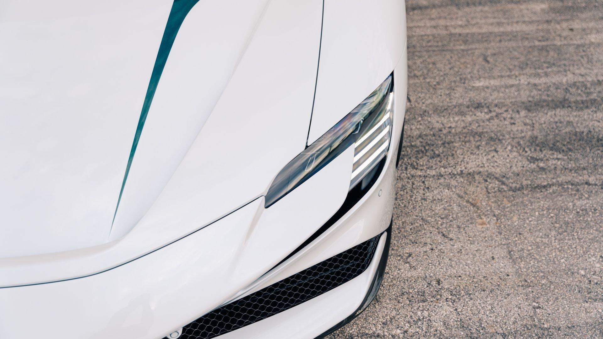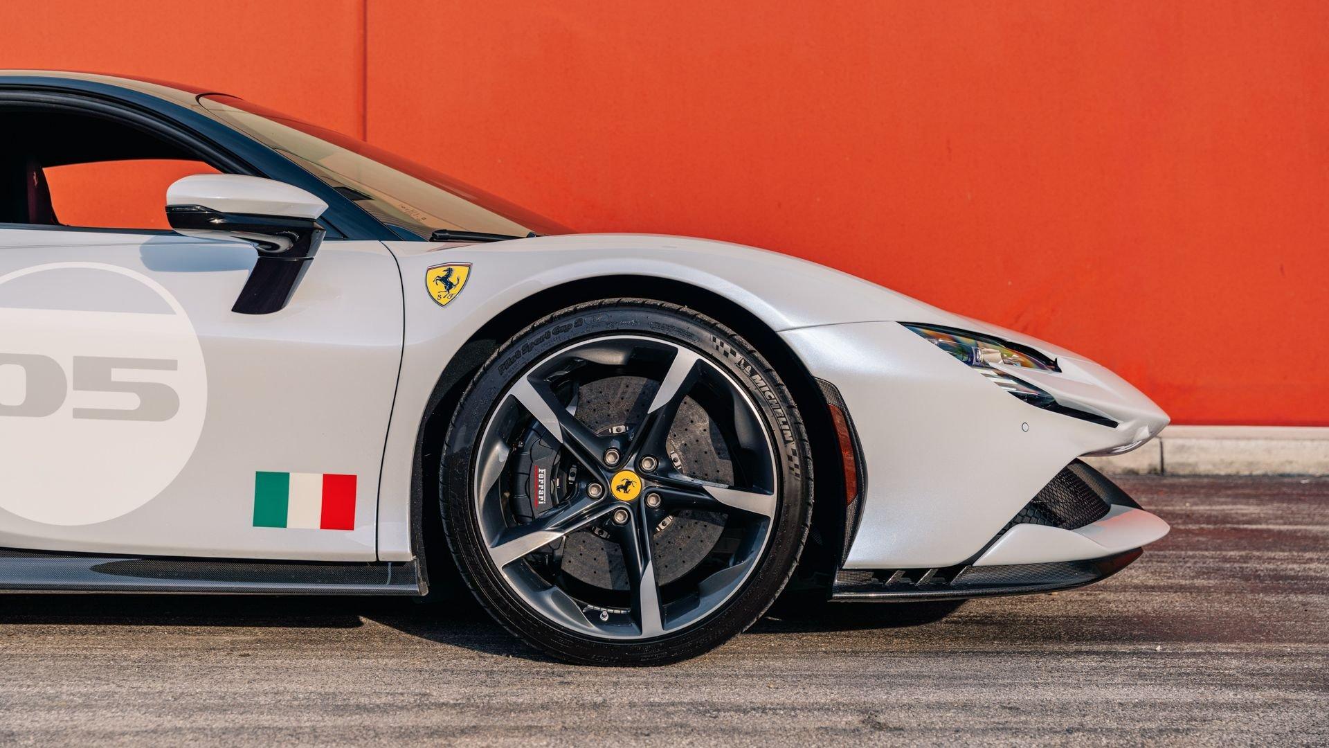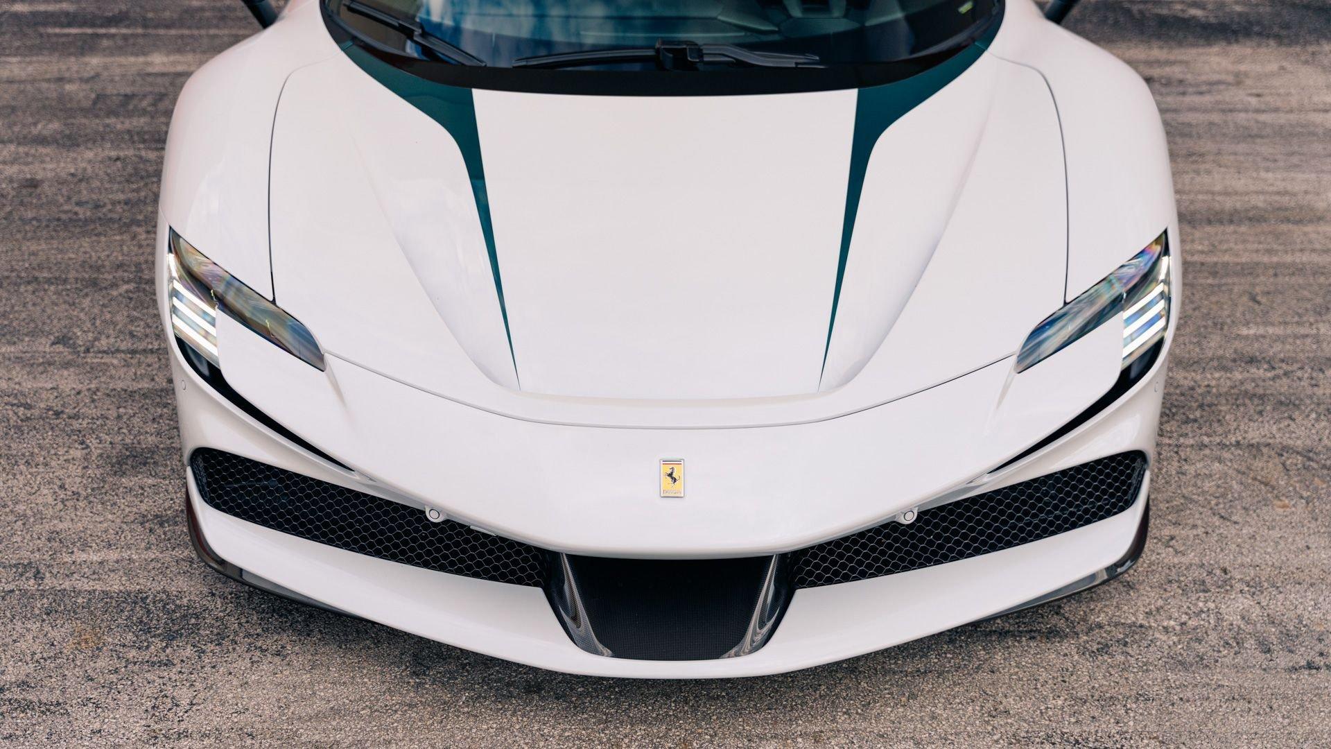 This 2022 SF90 Stradale was specified through Ferrari Tailor Made as part of the 10th Anniversary Cavalcade Collection, an invitation-only program reserved for clients who have participated in at least one Cavalcade. Ferrari framed the collection as a “thank you” to repeat participants, offering five Tailor Made liveries on the firm's five contemporary models, inspired by prior Cavalcade locations. Among them was Bianco Courmayeur, inspired by the Monte Bianco route and described by Ferrari as an alpine, glacial-themed shade, blending white with cool tonal flashes.