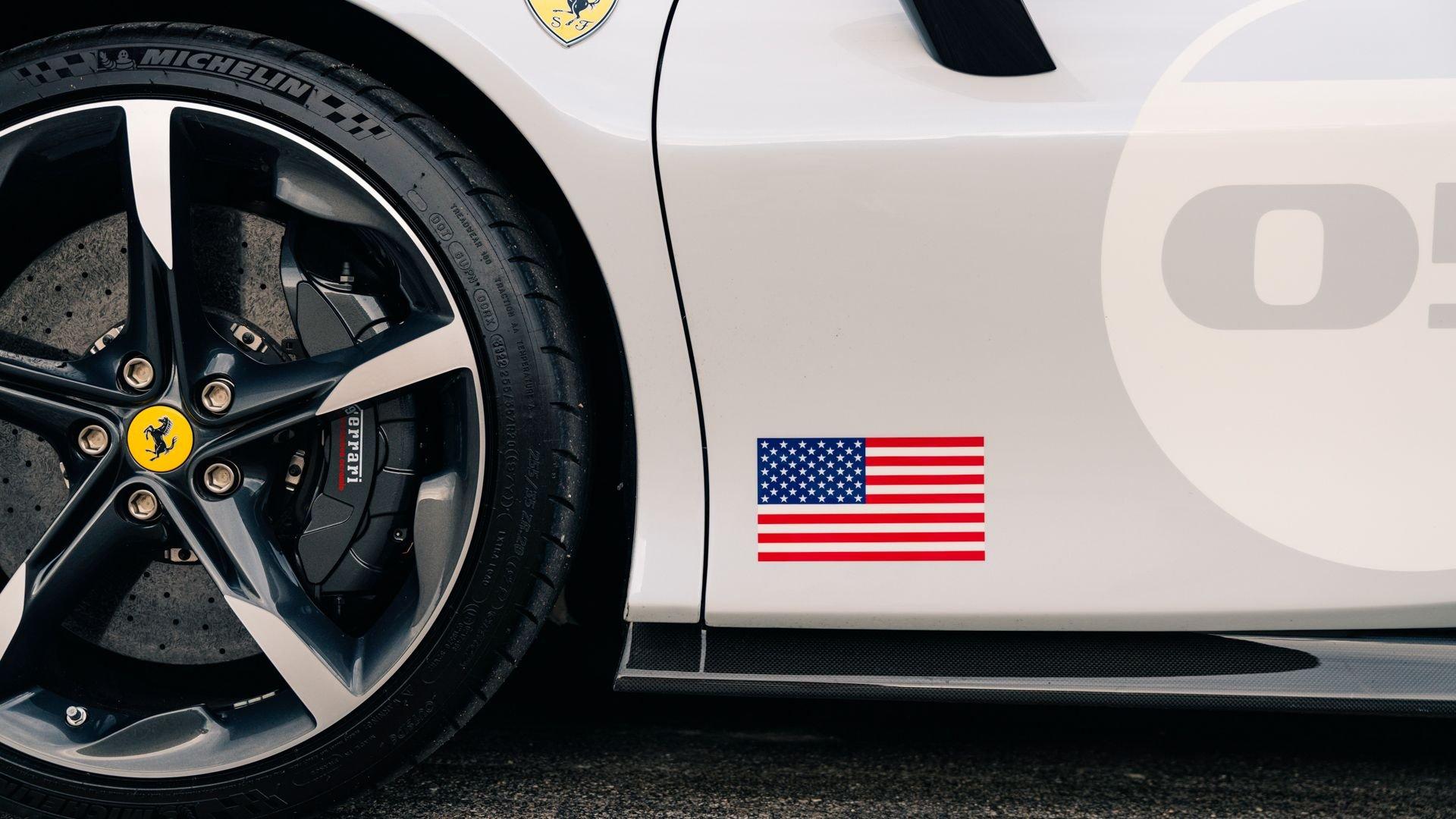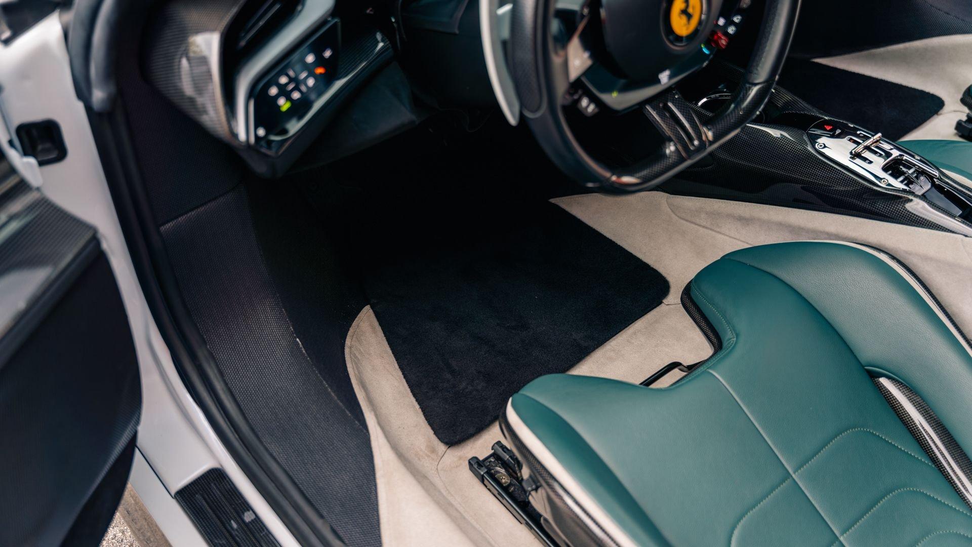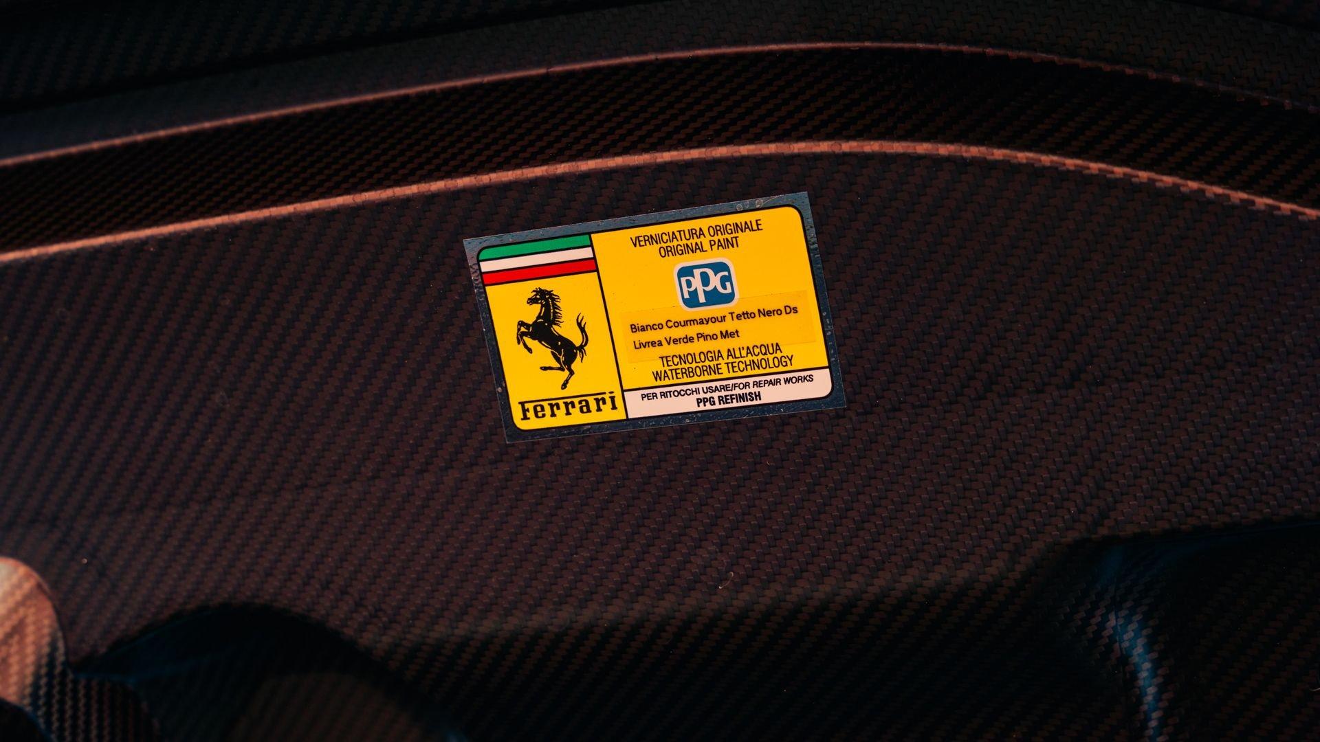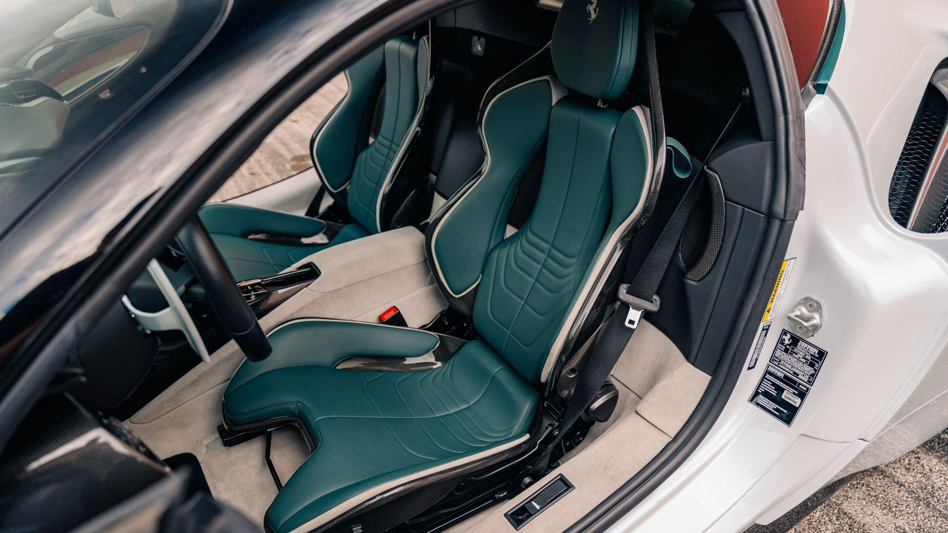The personalization plaque of this example lists the extensive bespoke features of the special edition, highlighted by the two-tone Extracampionario (special order) Bianco Courmayeur and Nero finish with Bianco King historic roundel door graphics carrying race number 05. The plaque further specifies flag motifs-an Italian flag on the passenger-side door and American flag on the driver-side door-and a complementary Verde Pino Metallic accent livery applied to the front lid, around the lid lip, along the upper door edges, and at the rear spoiler edge. Beyond this already impressive exterior specification, further optional extras include exposed gloss carbon fiber on the front spoiler, side air splitter, exterior sill kicks, rear diffuser, and rear spoiler. Diamond-polished forged wheels, Silverstone Grey calipers, “Scuderia Ferrari” fender shields, and black tailpipe tips round out the striking package.