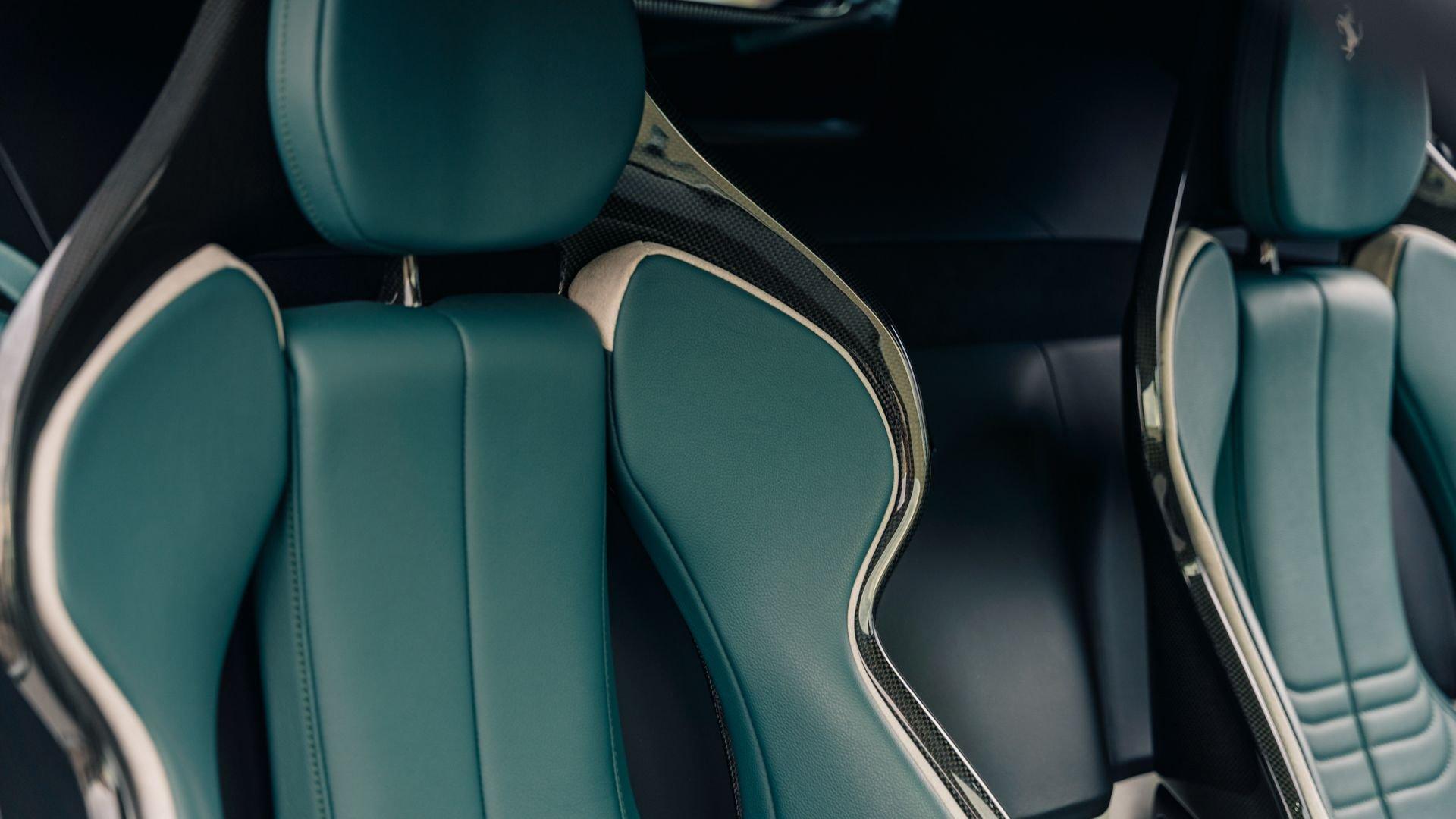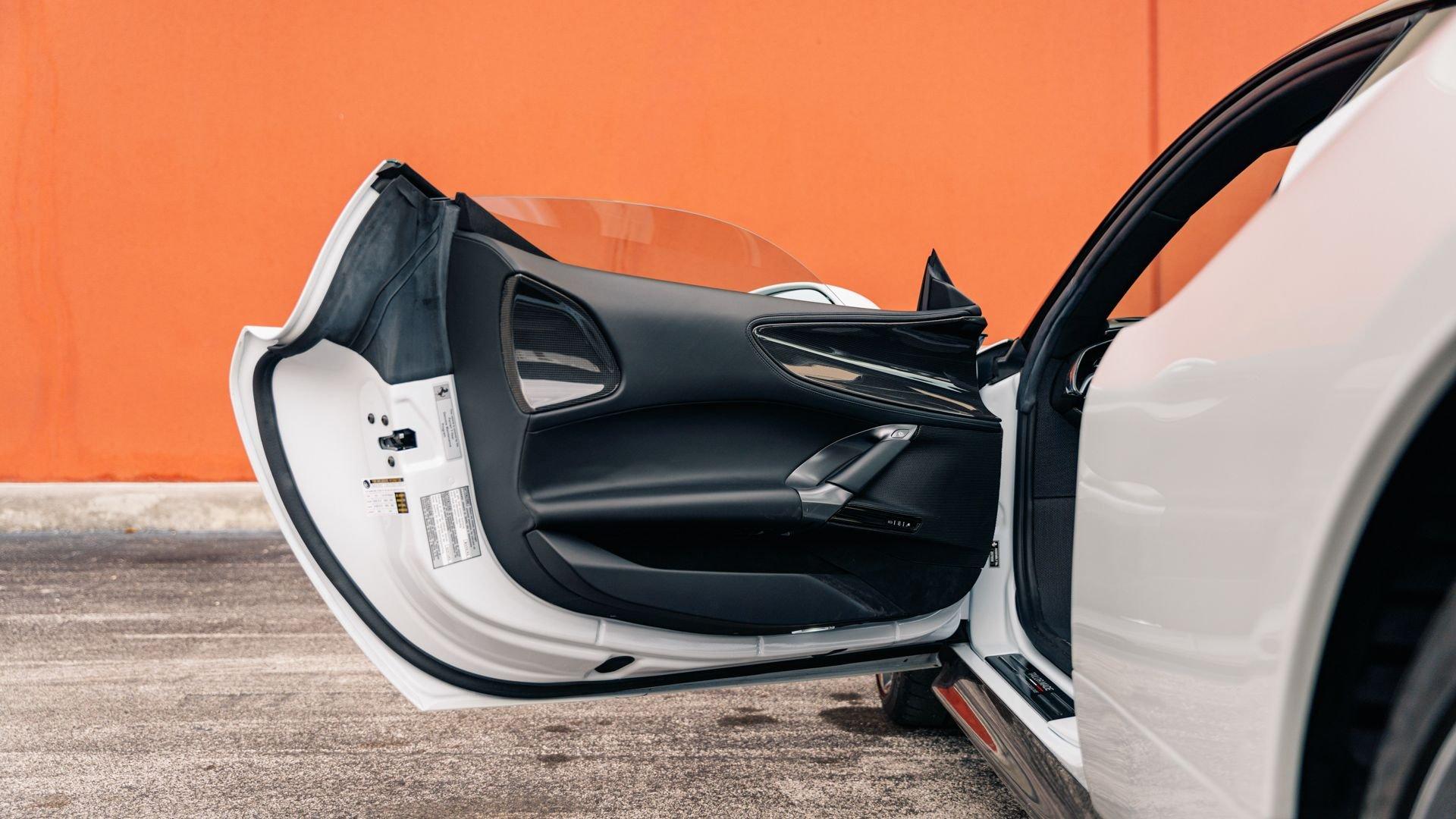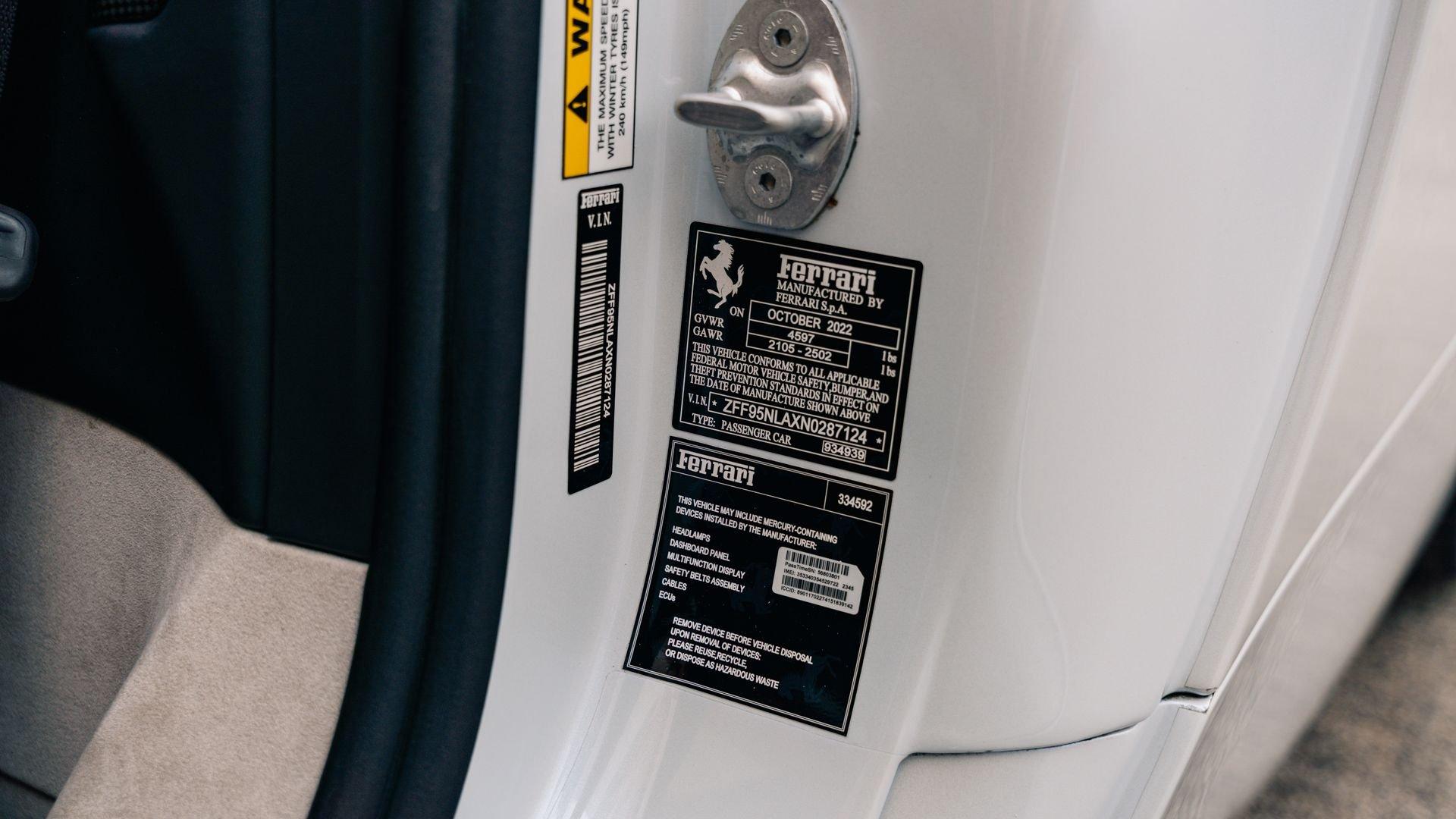 The personalization plaque of this example lists the extensive bespoke features of the special edition, highlighted by the two-tone Extracampionario (special order) Bianco Courmayeur and Nero finish with Bianco King historic roundel door graphics carrying race number 05. The plaque further specifies flag motifs-an Italian flag on the passenger-side door and American flag on the driver-side door-and a complementary Verde Pino Metallic accent livery applied to the front lid, around the lid lip, along the upper door edges, and at the rear spoiler edge. Beyond this already impressive exterior specification, further optional extras include exposed gloss carbon fiber on the front spoiler, side air splitter, exterior sill kicks, rear diffuser, and rear spoiler. Diamond-polished forged wheels, Silverstone Grey calipers, “Scuderia Ferrari” fender shields, and black tailpipe tips round out the striking package.