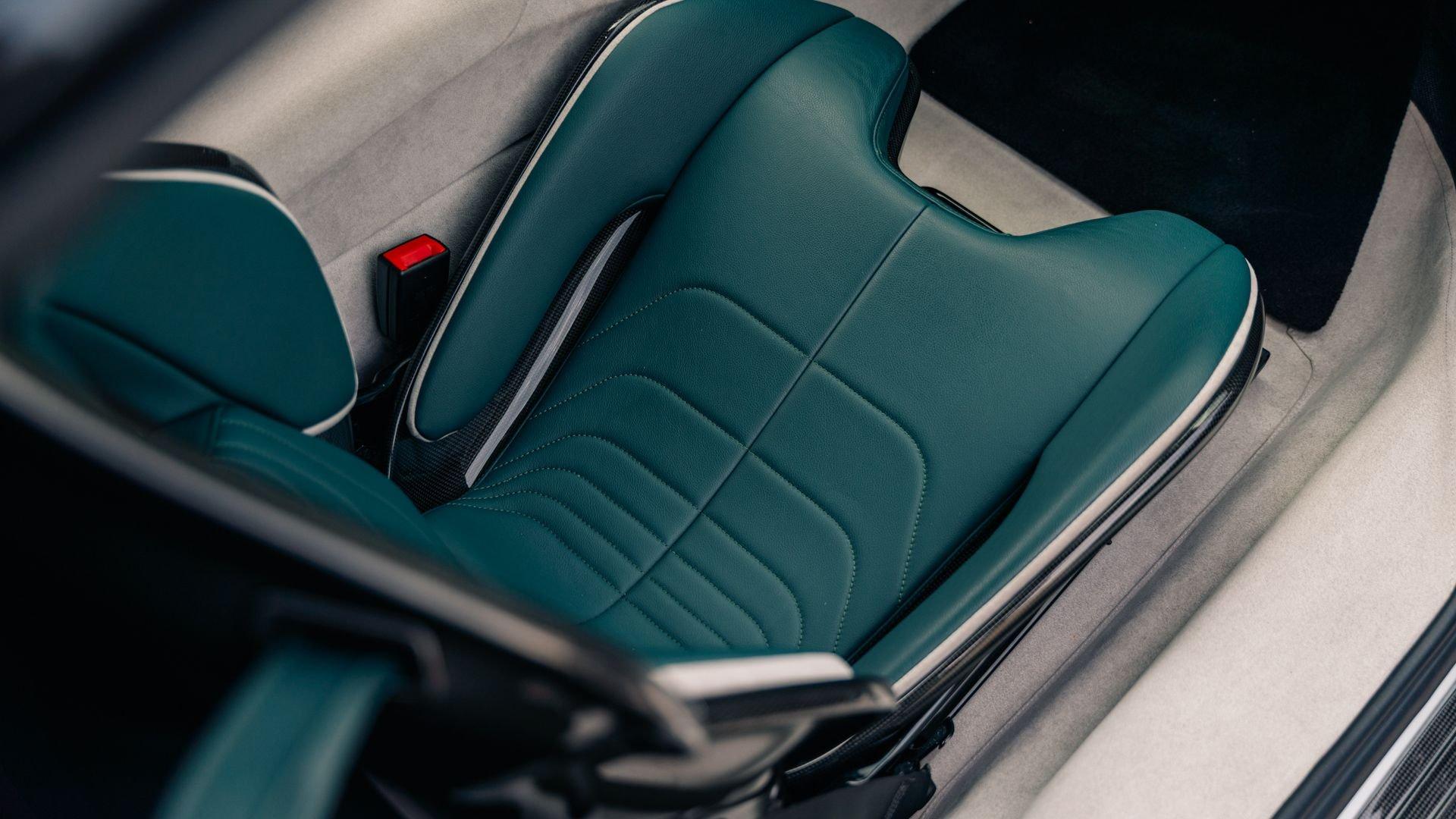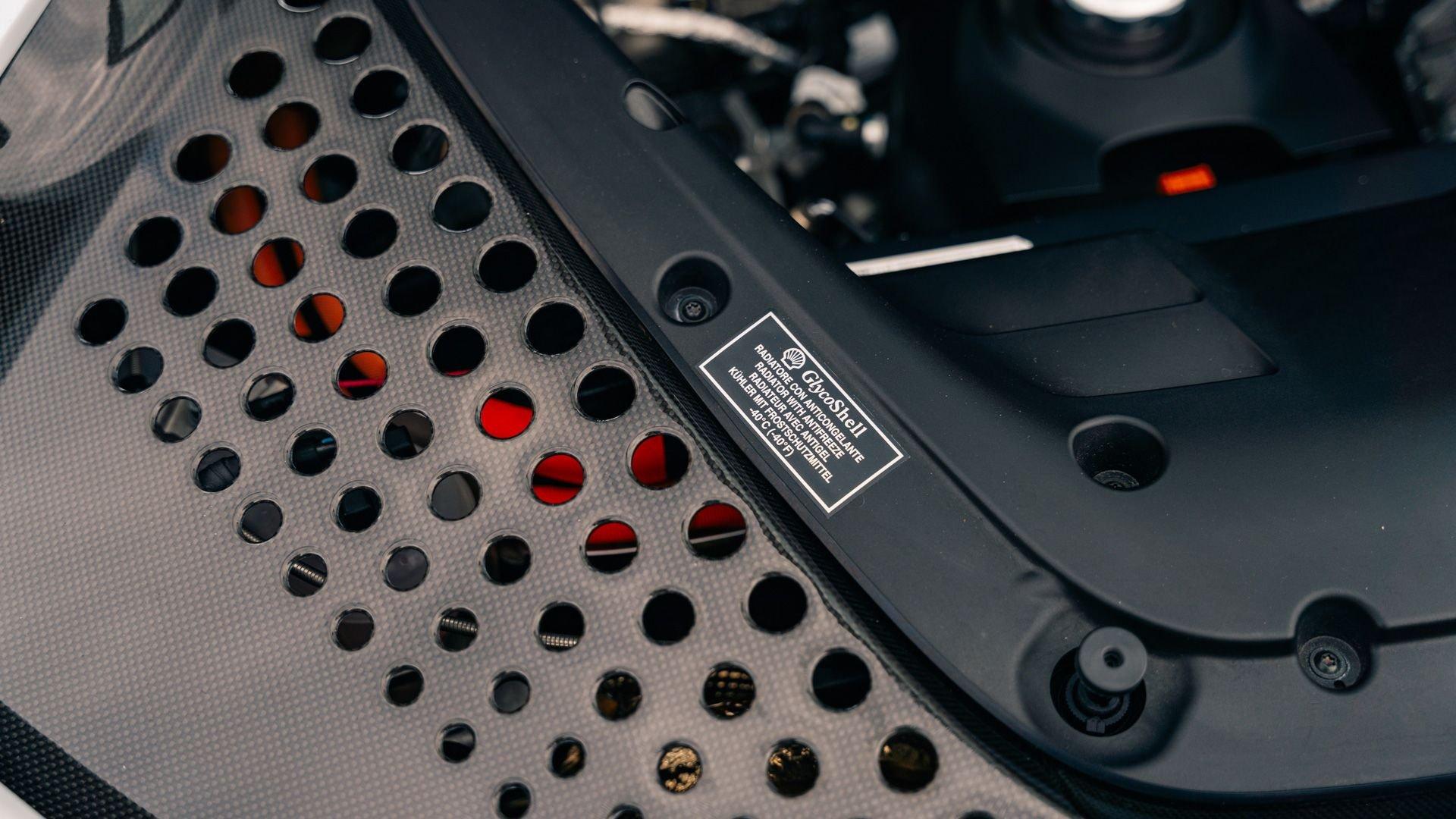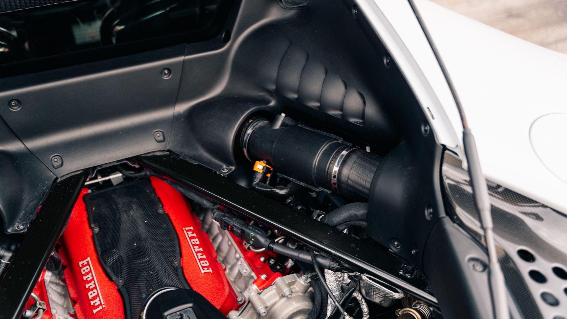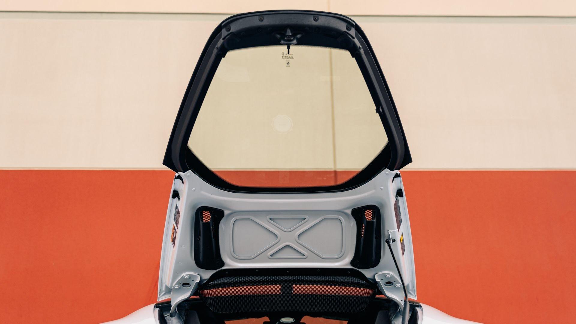 The personalization plaque of this example lists the extensive bespoke features of the special edition, highlighted by the two-tone Extracampionario (special order) Bianco Courmayeur and Nero finish with Bianco King historic roundel door graphics carrying race number 05. The plaque further specifies flag motifs-an Italian flag on the passenger-side door and American flag on the driver-side door-and a complementary Verde Pino Metallic accent livery applied to the front lid, around the lid lip, along the upper door edges, and at the rear spoiler edge. Beyond this already impressive exterior specification, further optional extras include exposed gloss carbon fiber on the front spoiler, side air splitter, exterior sill kicks, rear diffuser, and rear spoiler. Diamond-polished forged wheels, Silverstone Grey calipers, “Scuderia Ferrari” fender shields, and black tailpipe tips round out the striking package.
