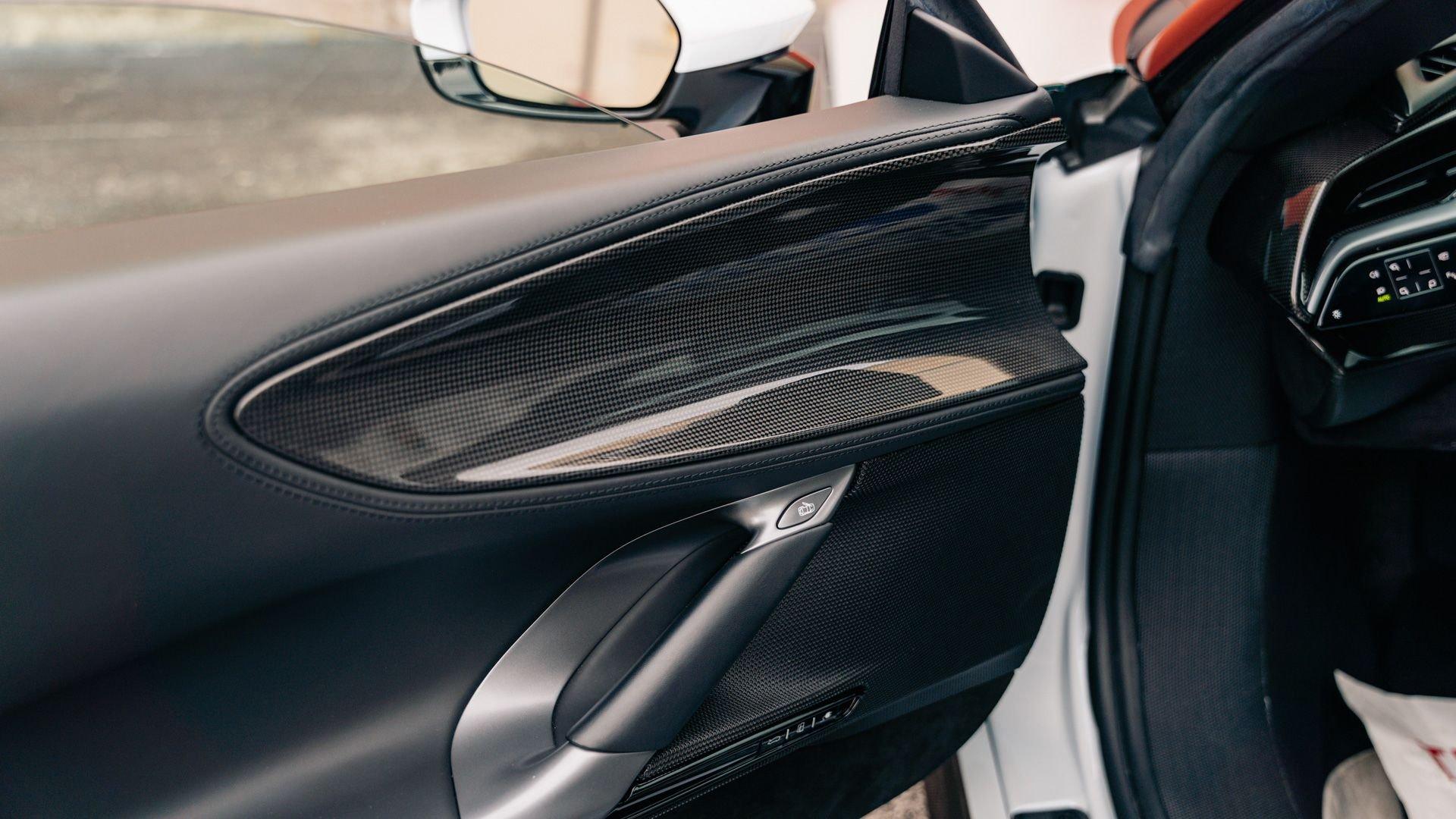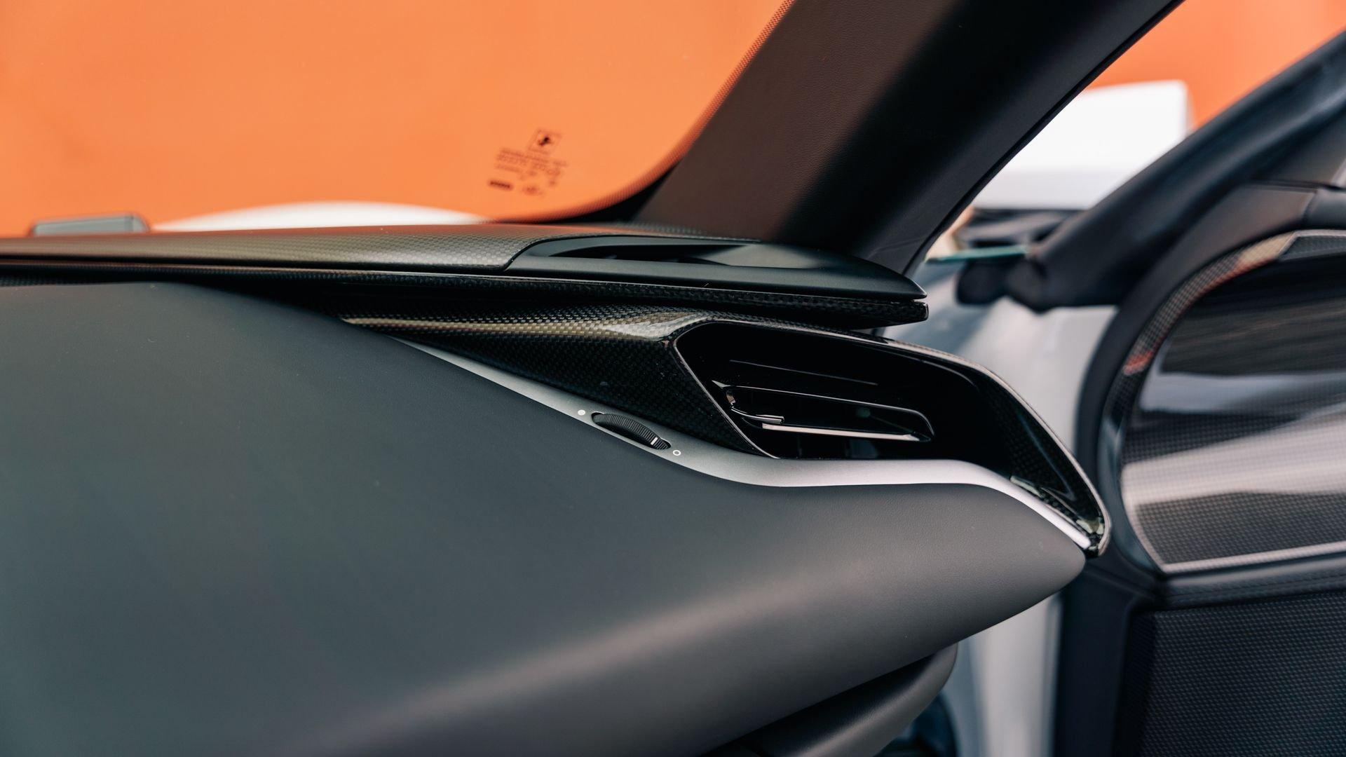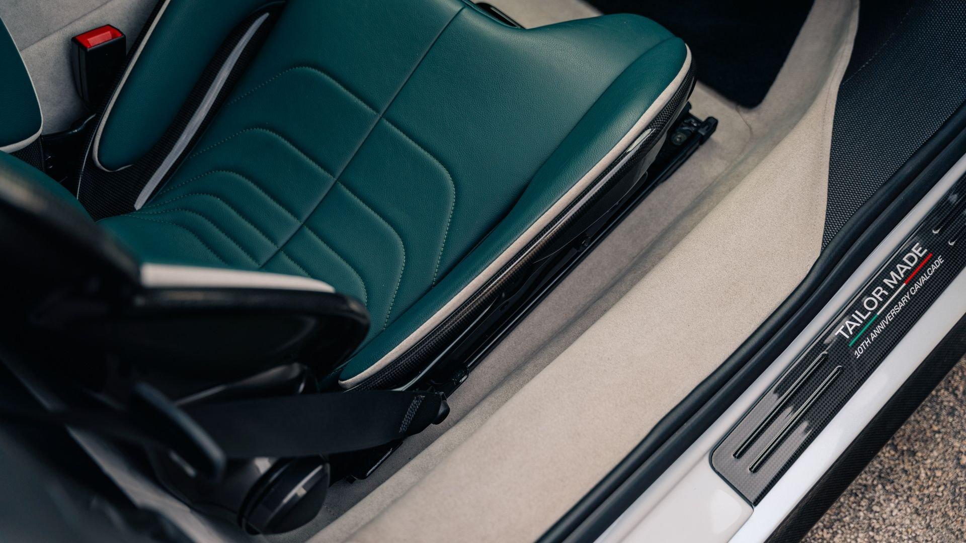 Inside, the Tailor Made appointments continue with “special design” carbon fiber racing seats in Selva leather with external inserts in Silver Alcantara and tone-on-tone stitching. The plaque also calls out Bianco Courmayeur-finished F1 paddles, a lower dashboard in Nero leather, and extensive gloss carbon fiber adorning the dashboard inserts, driver zone+LEDs, instrument cluster, and door panels. Commemorative detailing is extensive, including a glossy carbon-fiber kickplate with Tailor Made logo and “10th Anniversary Cavalcade” with Italian tricolor striping, and the XL carbon-fiber dedication plate between the seats naming first owner Joseph Vitagliano and “Cavalcade 2019 Capri.”