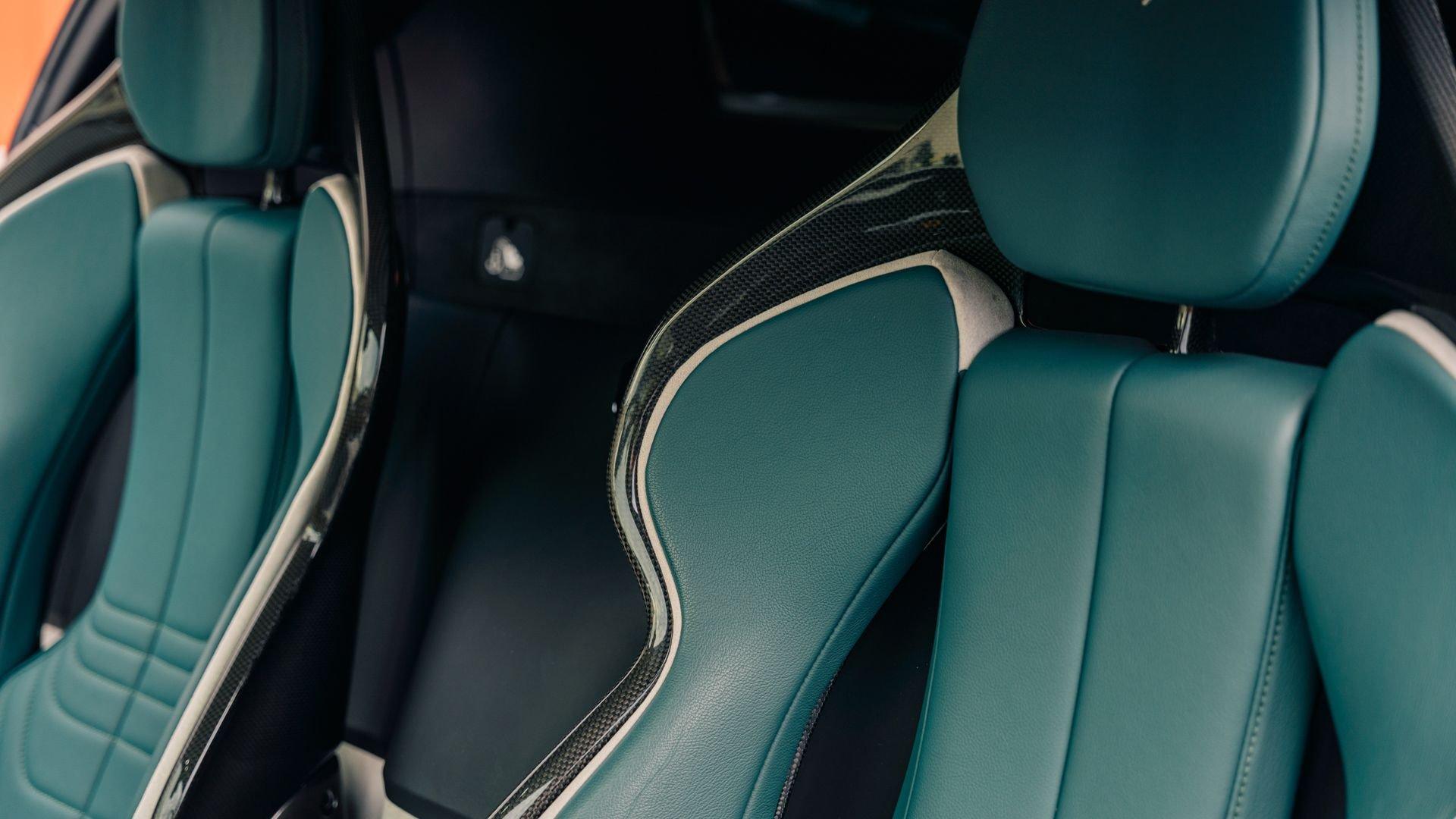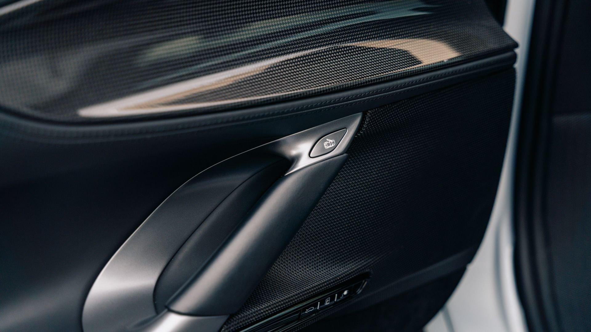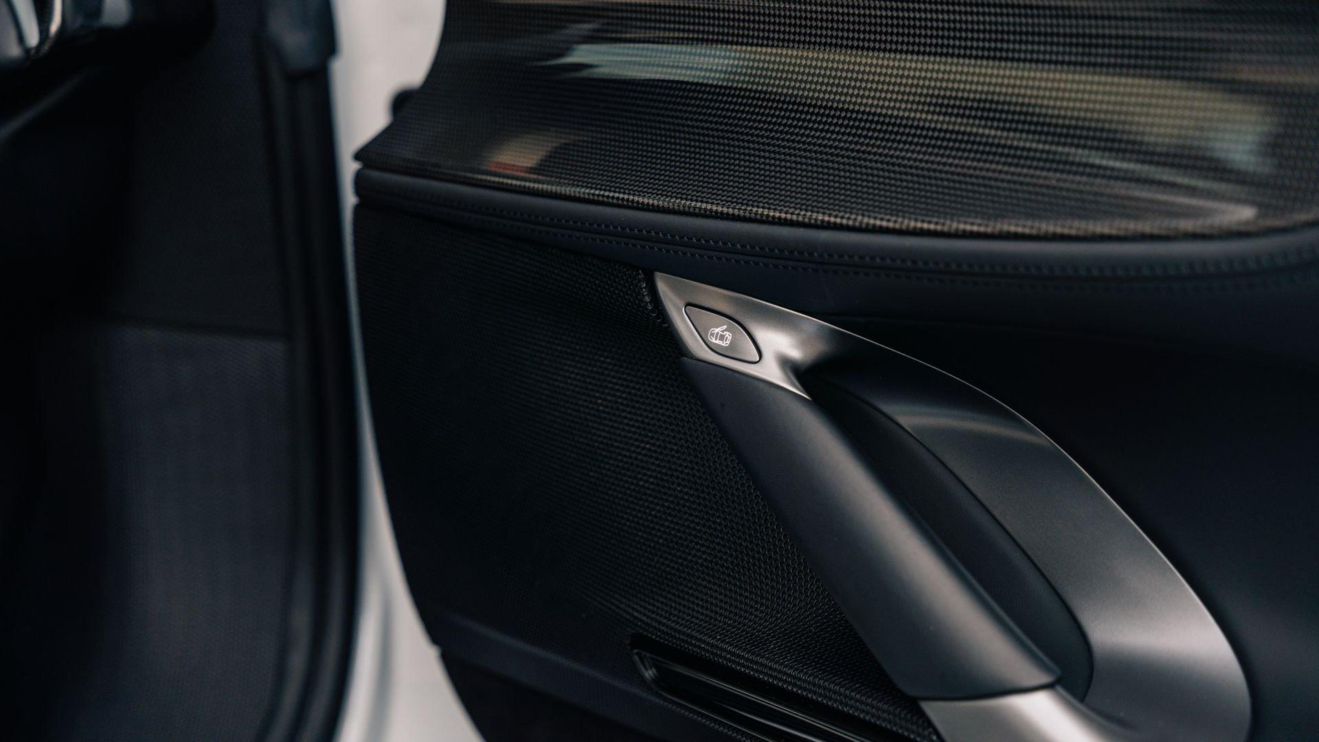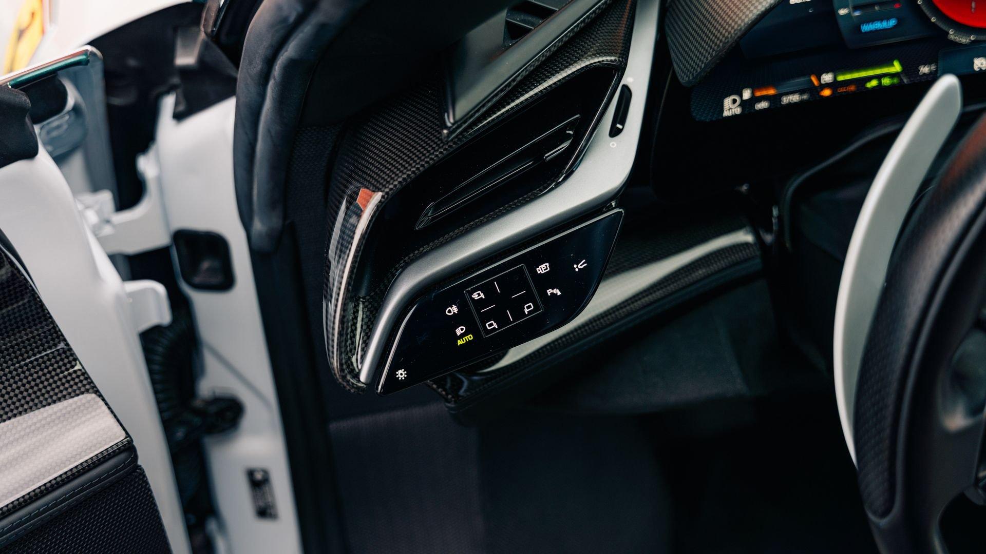 Inside, the Tailor Made appointments continue with “special design” carbon fiber racing seats in Selva leather with external inserts in Silver Alcantara and tone-on-tone stitching. The plaque also calls out Bianco Courmayeur-finished F1 paddles, a lower dashboard in Nero leather, and extensive gloss carbon fiber adorning the dashboard inserts, driver zone+LEDs, instrument cluster, and door panels. Commemorative detailing is extensive, including a glossy carbon-fiber kickplate with Tailor Made logo and “10th Anniversary Cavalcade” with Italian tricolor striping, and the XL carbon-fiber dedication plate between the seats naming first owner Joseph Vitagliano and “Cavalcade 2019 Capri.”