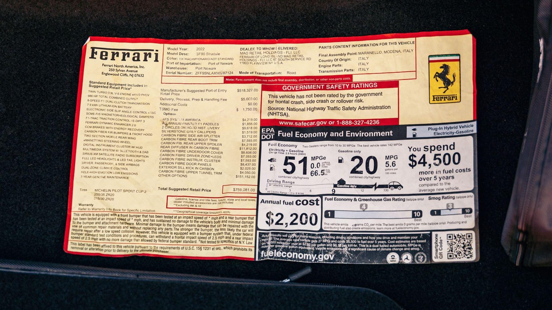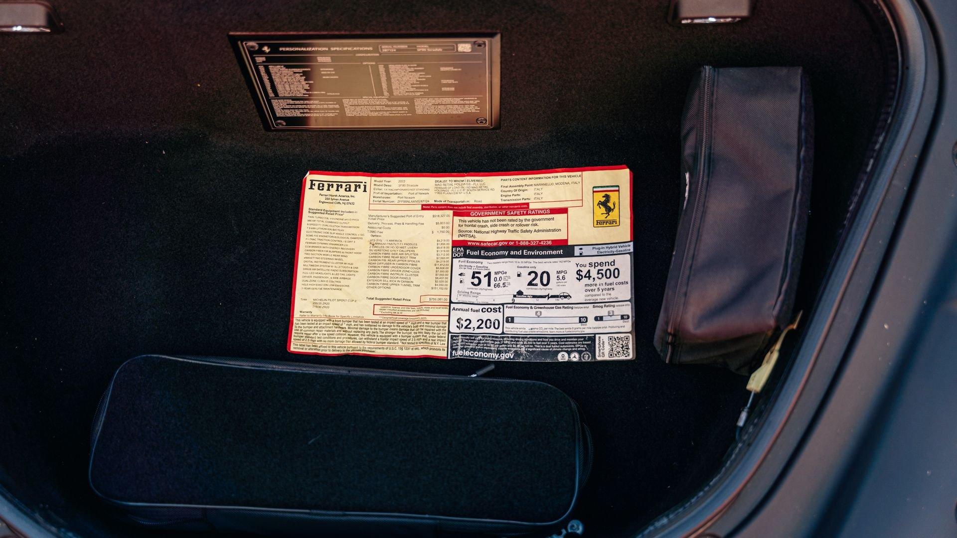 Delivered new to Ferrari of Long Island in Plainview, New York, the original window sticker records a substantial $234,004 in optional equipment and a total MSRP of $759,081. The accompanying CARFAX Vehicle History Report indicates that by mid-2024 the SF90 was offered through Ferrari of Fort Lauderdale showing 1,438 miles and continued to receive routine attention through the dealer in recent years, most recently in January 2026 at 3,741 miles. Now presenting in like-new condition with just 3,755 miles at the time of cataloging, it represents an investment-grade, highly collectible Tailor Made Ferrari, originally reserved exclusively for Cavalcade participants.