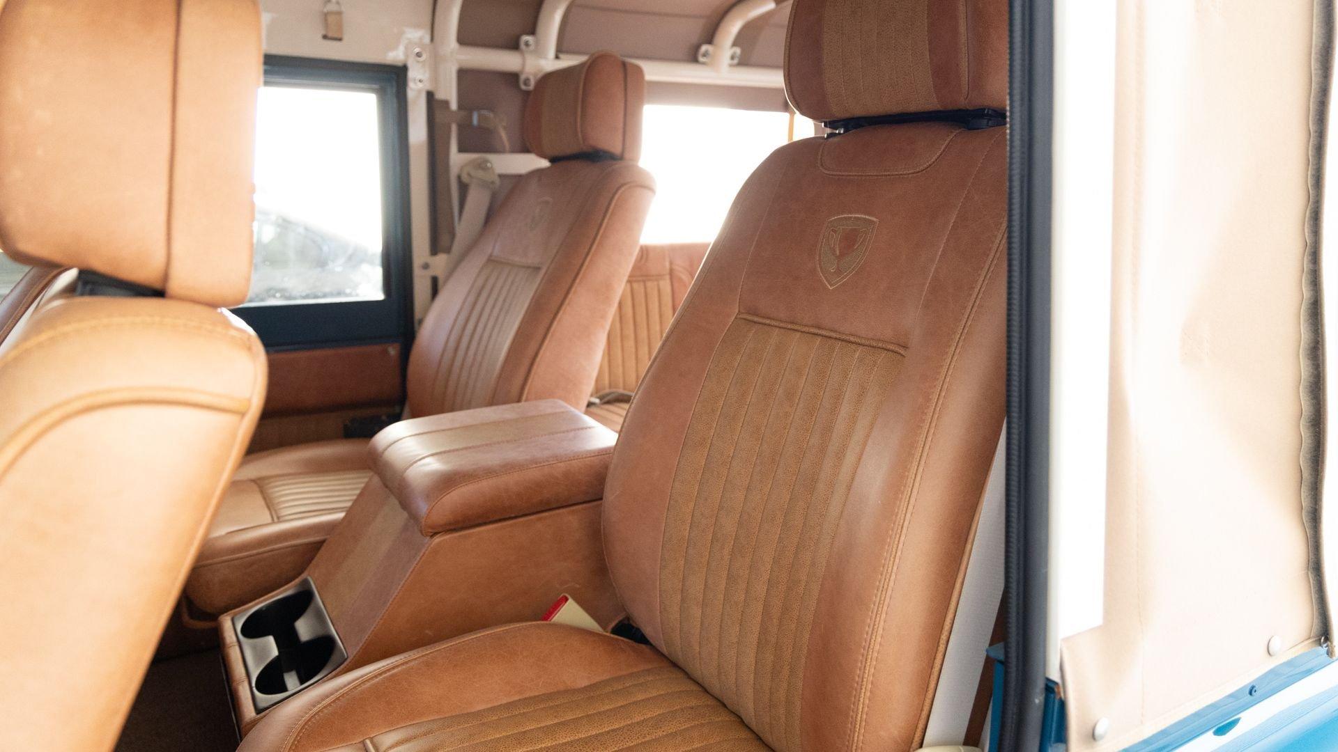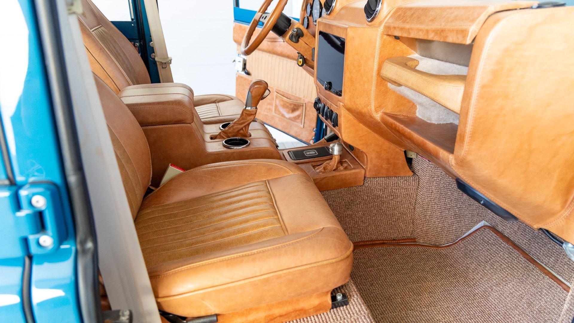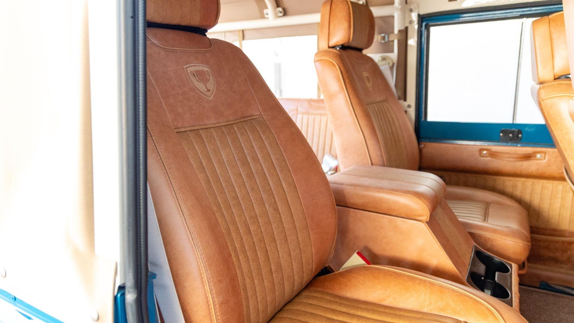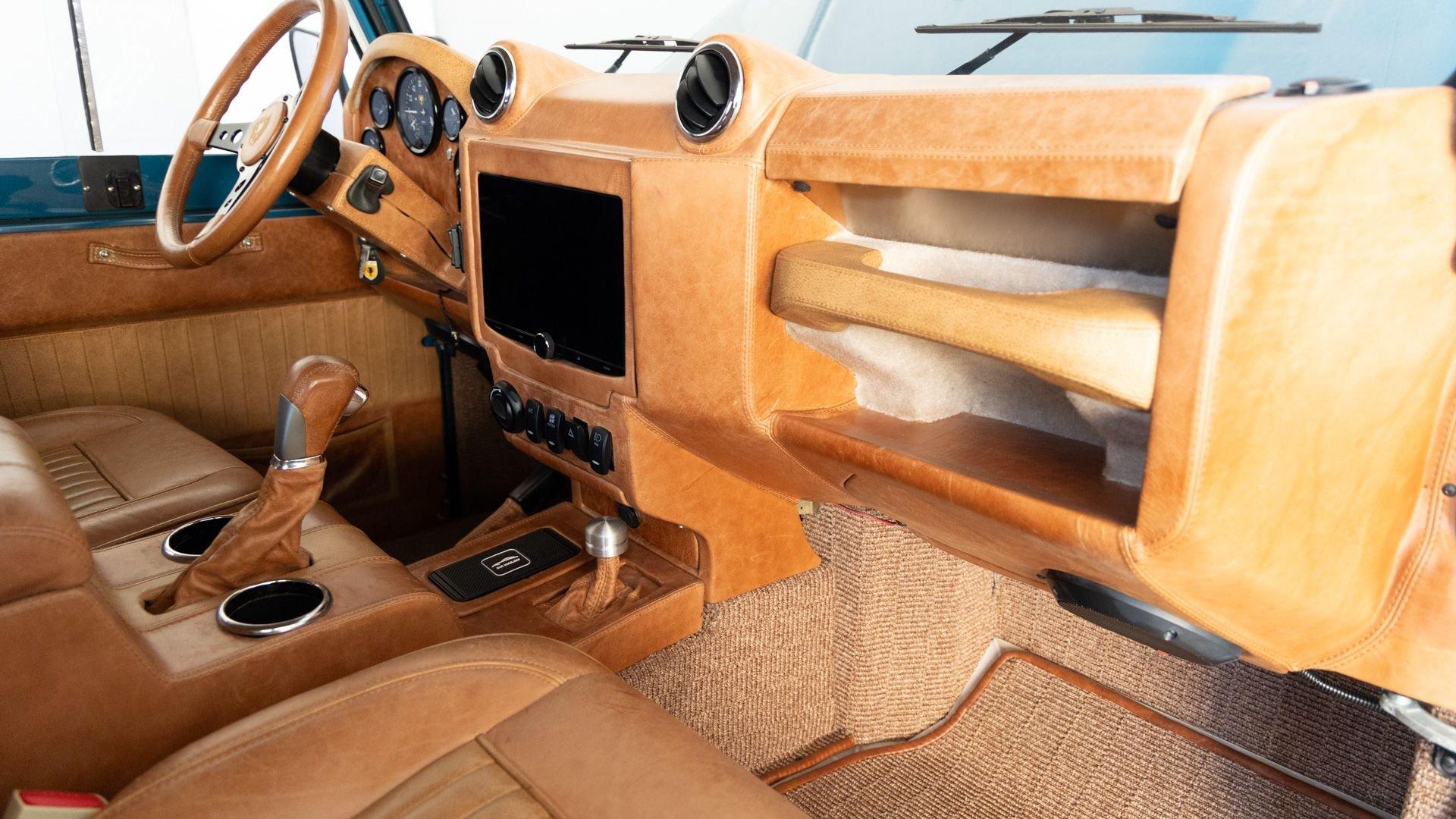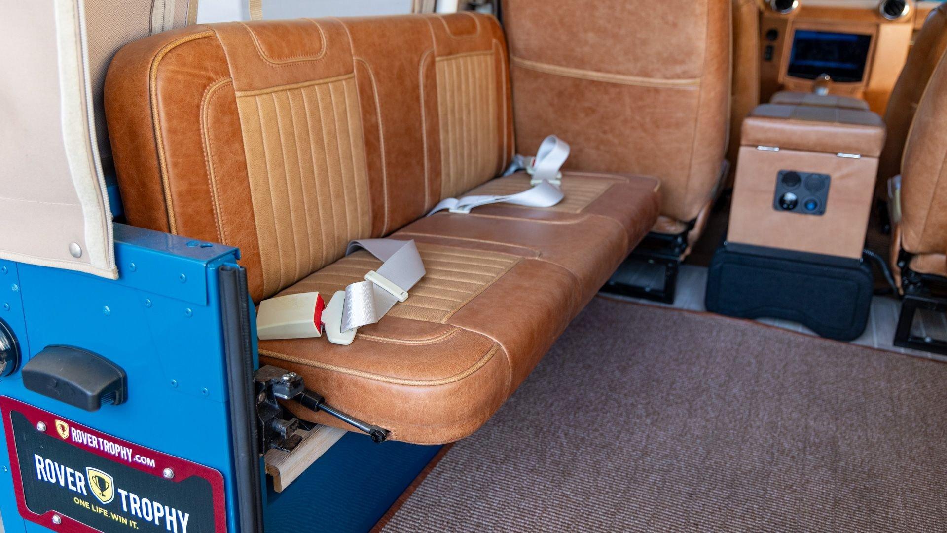 The Rover Trophy's bespoke interior is trimmed in hand-sewn Saddle Bag Brown leather and optioned with custom teak interior flooring and a larger entertainment system. Standard amenities are plentiful and include Ministry of Defender air conditioning, Speed Hut custom gauges, and a Kenwood entertainment center with Apple CarPlay with eight-speaker surround sound for the fortunate forward-facing occupants seated in custom-designed captain seats again in Saddle Bag Brown leather. A full accounting of the impressive standard features list is accounted on the Rover Trophy window sticker produced by the company that totals an impressive $245,000.