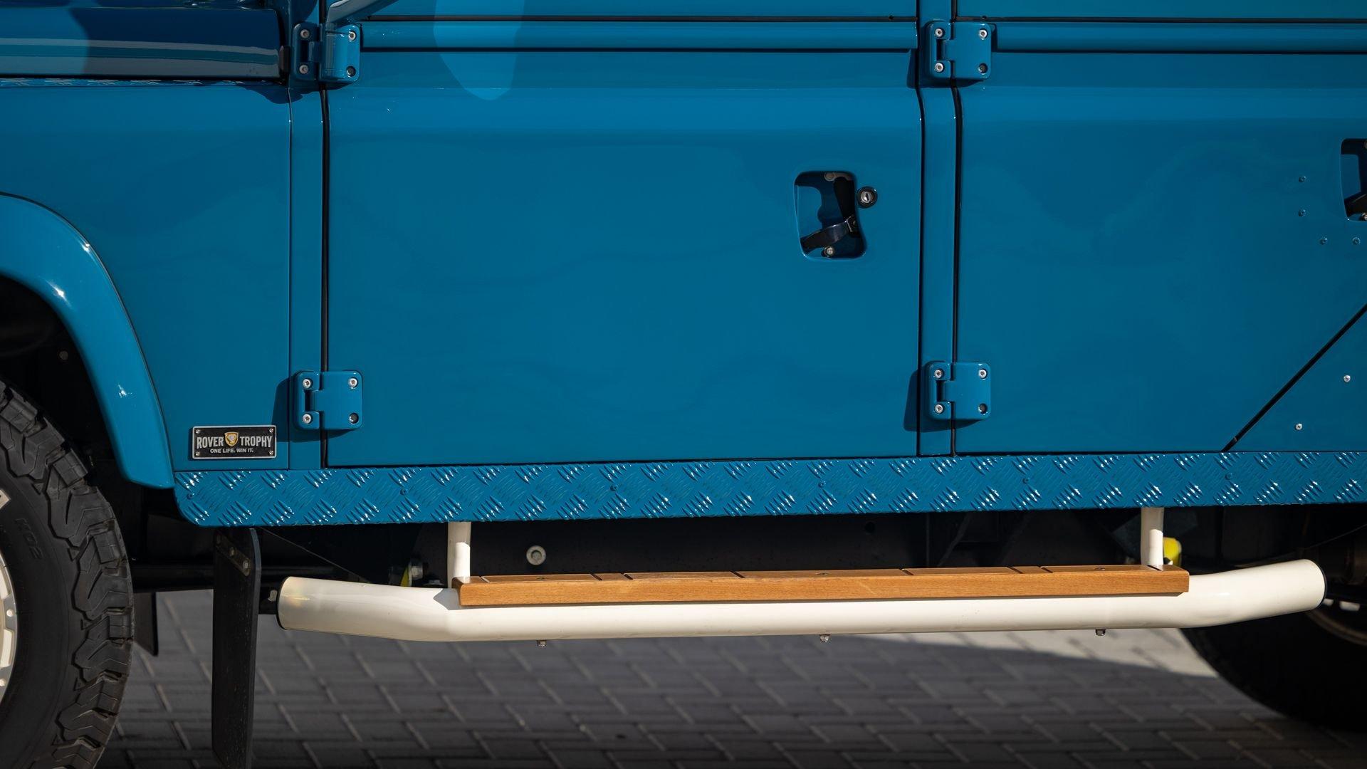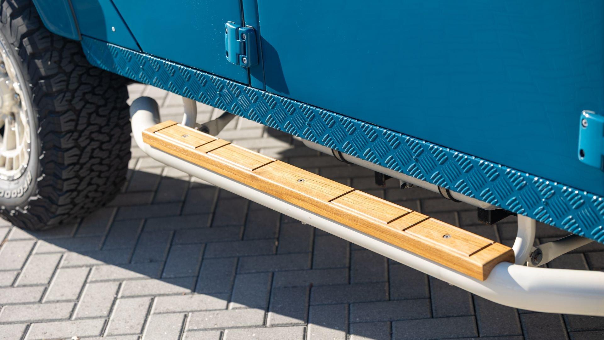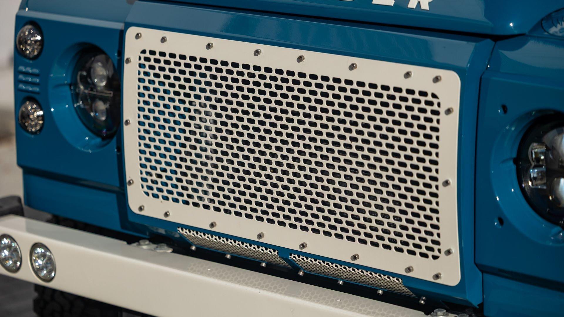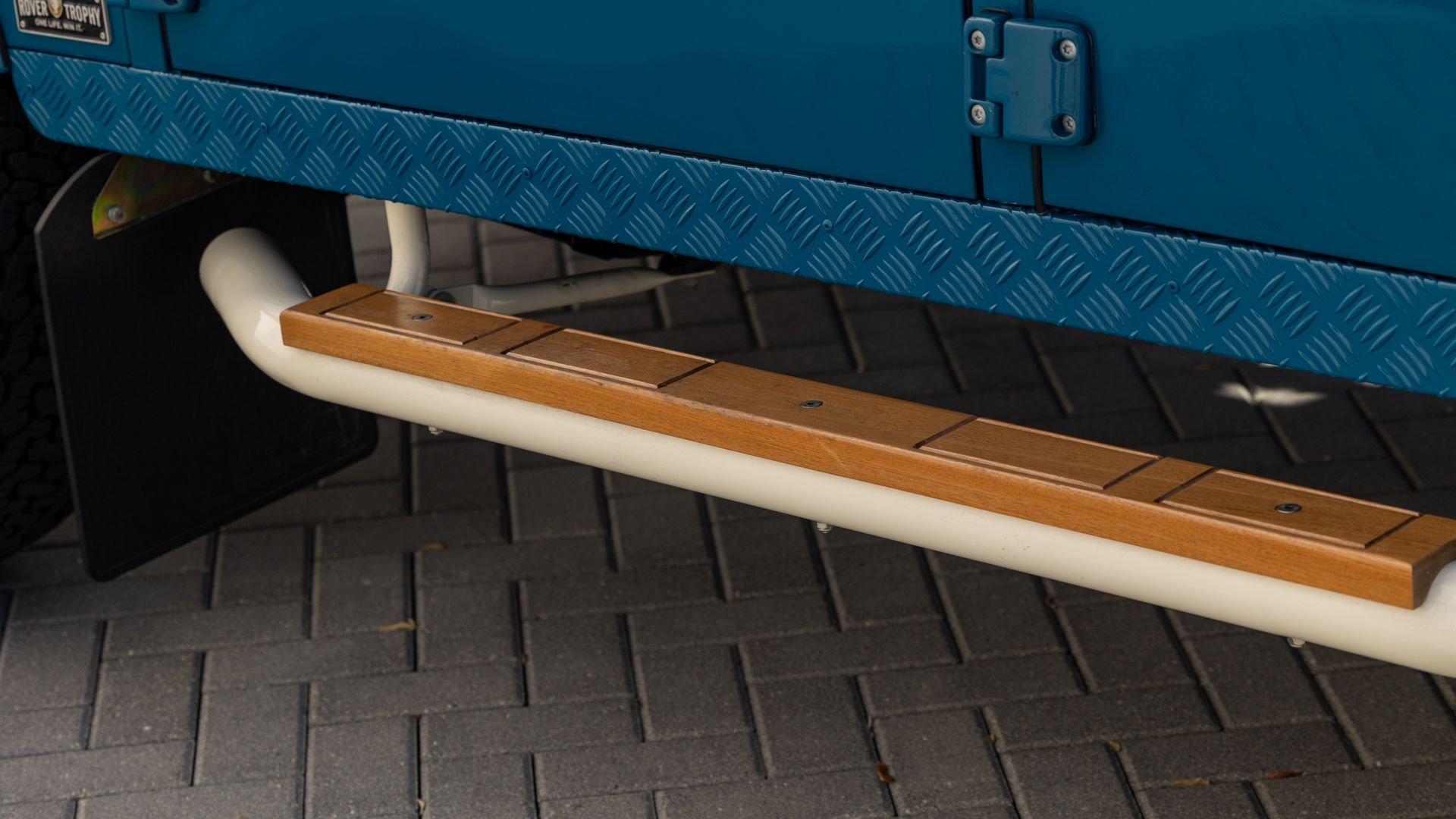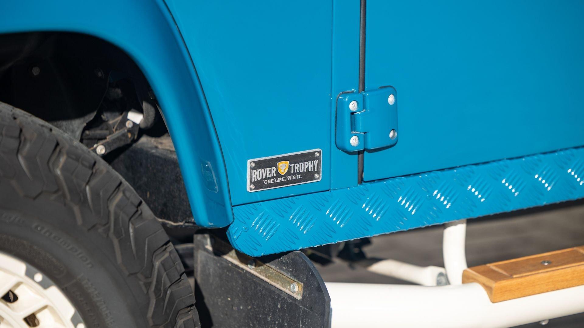 This particular D110 Rover Trophy Soft Top, noted as 002, is perhaps the epitome of the company's ethos. Built from a sandblasted and powder-coated chassis, the body, with numerous new components including its doors, hood, fenders, and bulkhead, is finished in Oslo Blue. The exterior is trimmed in Wimbledon White with matched 18-inch Custom Trophy Honeycomb white powder coated rims shod with BFGoodrich All-Terrain T/A KO2 Baja Champion tires. White Fire and Ice side steps clad with honey-colored wood tie into the freshly fitted mohair canvas soft top with zip-up windows.