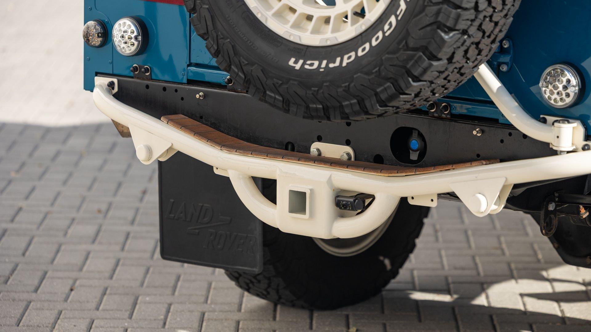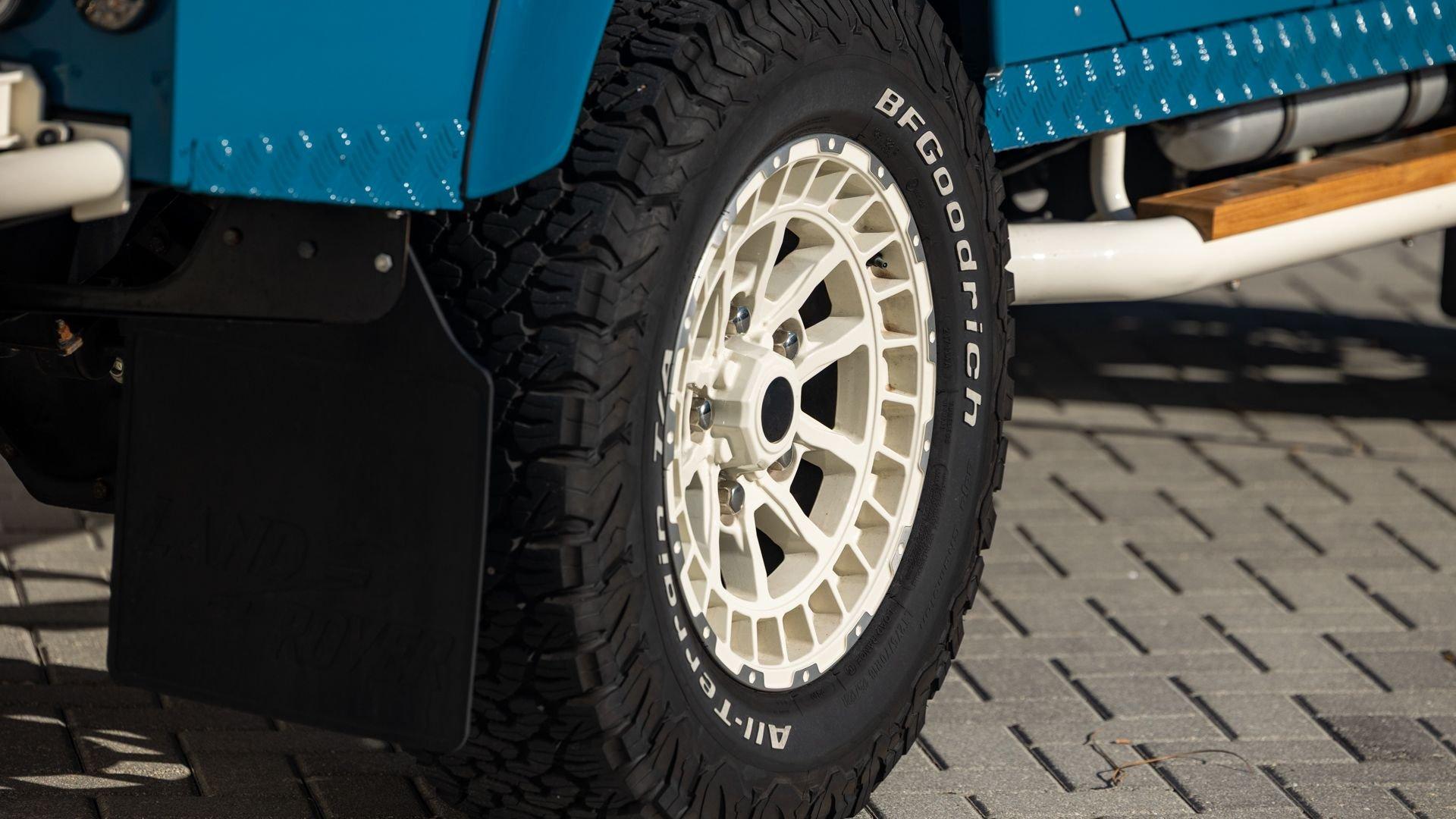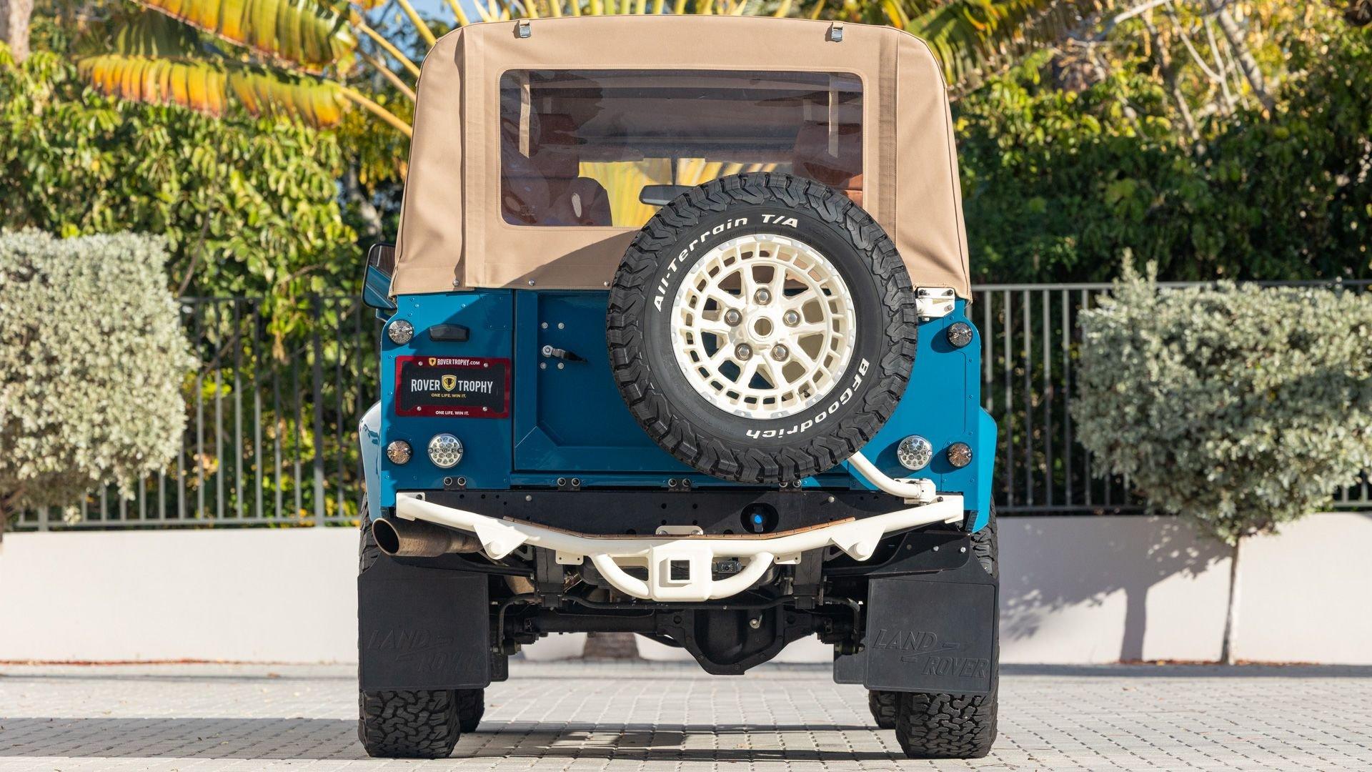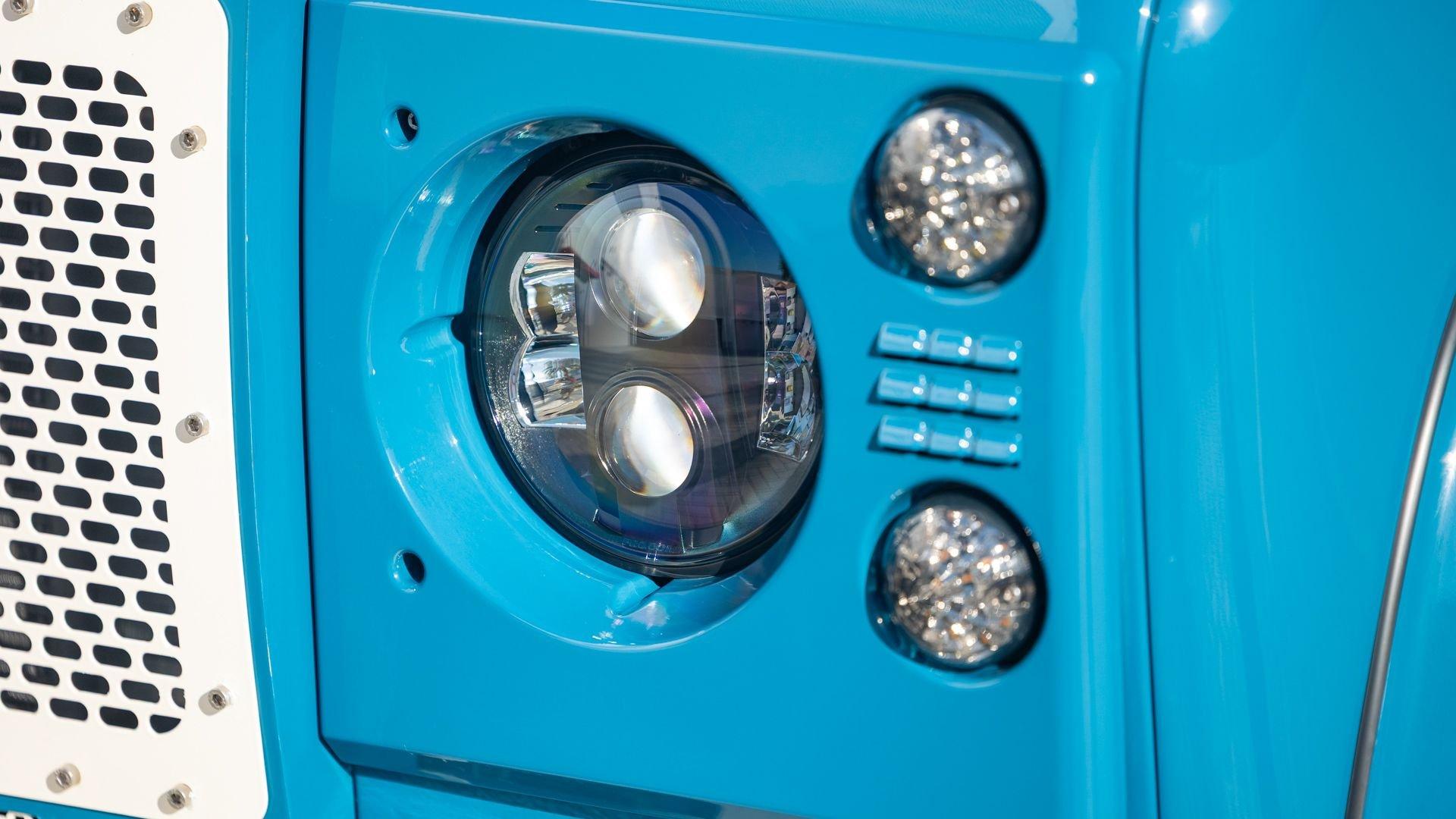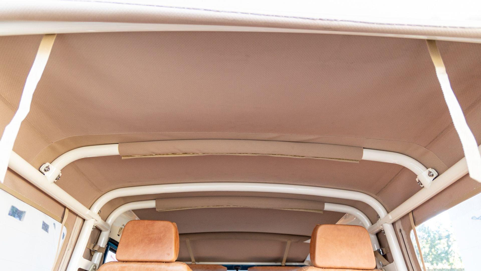 This particular D110 Rover Trophy Soft Top, noted as 002, is perhaps the epitome of the company's ethos. Built from a sandblasted and powder-coated chassis, the body, with numerous new components including its doors, hood, fenders, and bulkhead, is finished in Oslo Blue. The exterior is trimmed in Wimbledon White with matched 18-inch Custom Trophy Honeycomb white powder coated rims shod with BFGoodrich All-Terrain T/A KO2 Baja Champion tires. White Fire and Ice side steps clad with honey-colored wood tie into the freshly fitted mohair canvas soft top with zip-up windows.