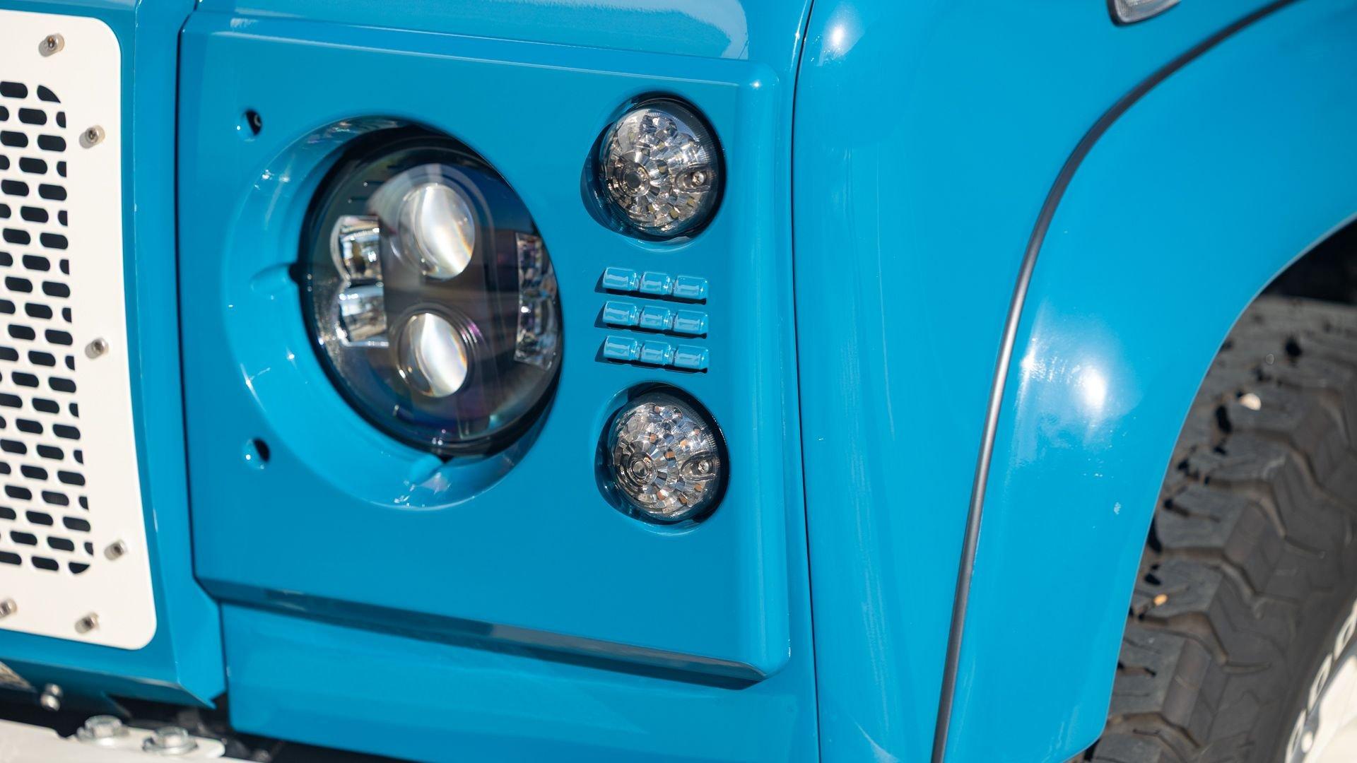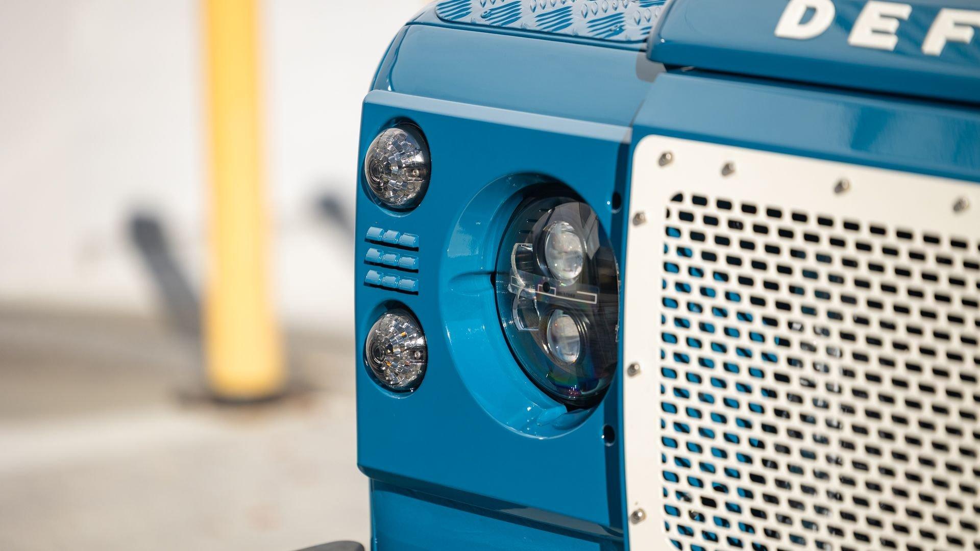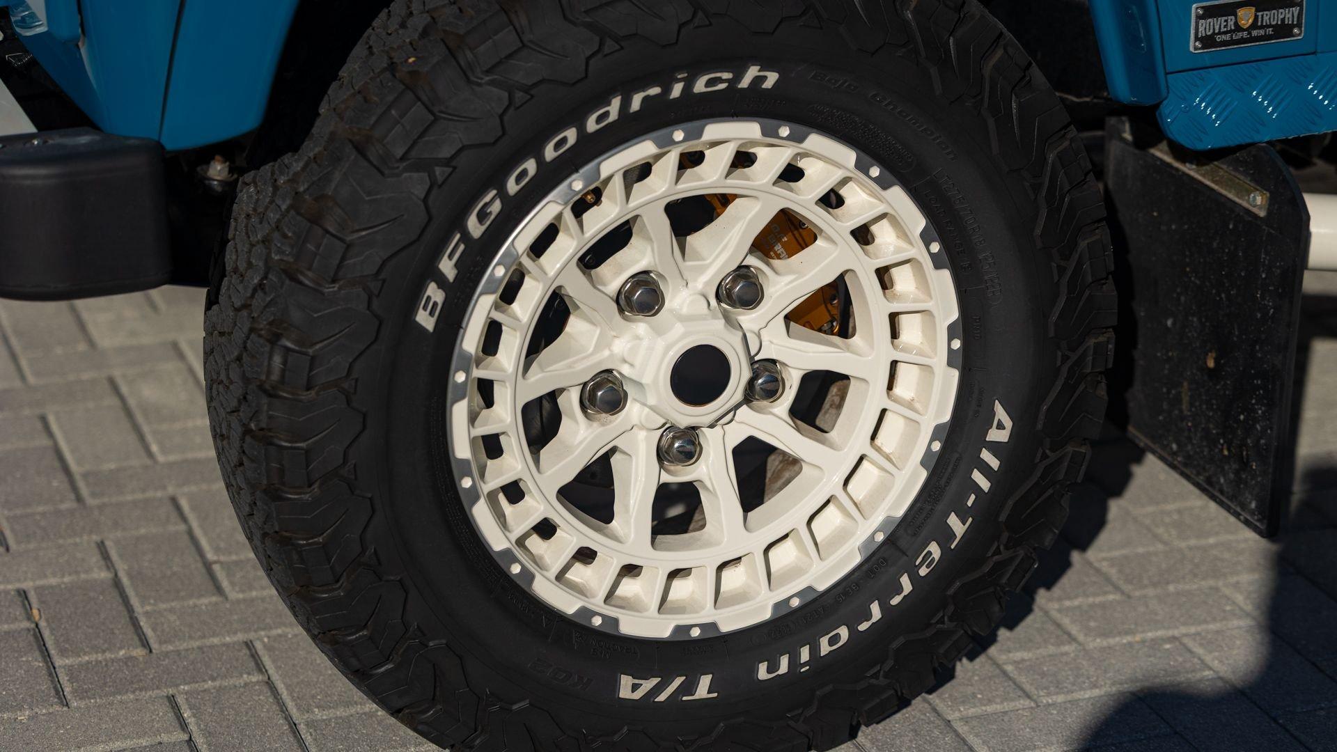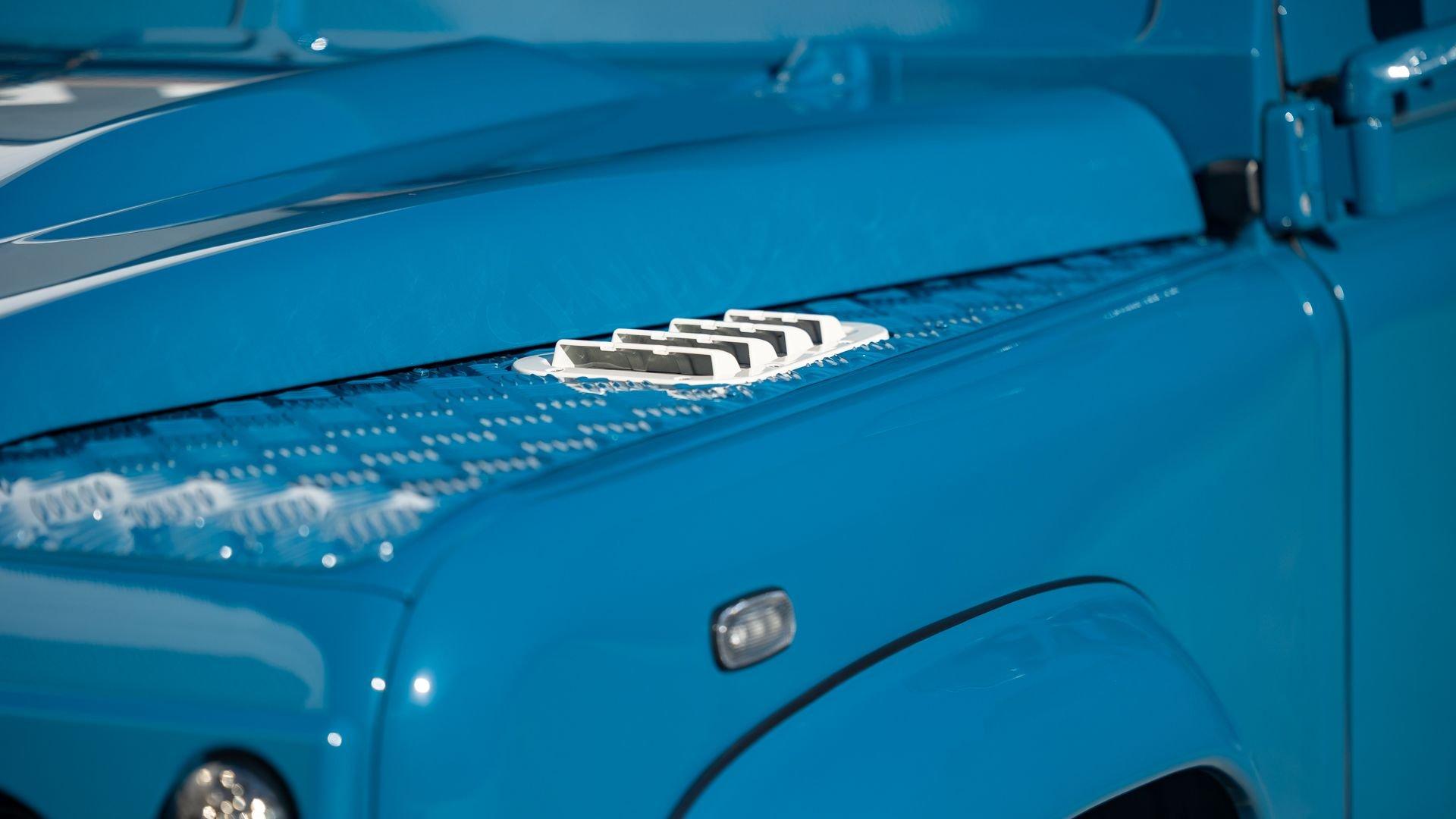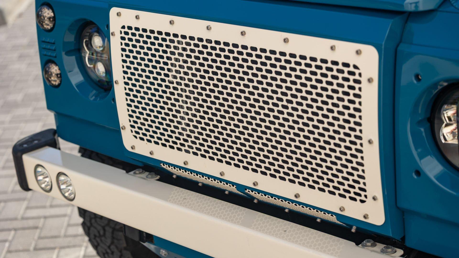 This particular D110 Rover Trophy Soft Top, noted as 002, is perhaps the epitome of the company's ethos. Built from a sandblasted and powder-coated chassis, the body, with numerous new components including its doors, hood, fenders, and bulkhead, is finished in Oslo Blue. The exterior is trimmed in Wimbledon White with matched 18-inch Custom Trophy Honeycomb white powder coated rims shod with BFGoodrich All-Terrain T/A KO2 Baja Champion tires. White Fire and Ice side steps clad with honey-colored wood tie into the freshly fitted mohair canvas soft top with zip-up windows.