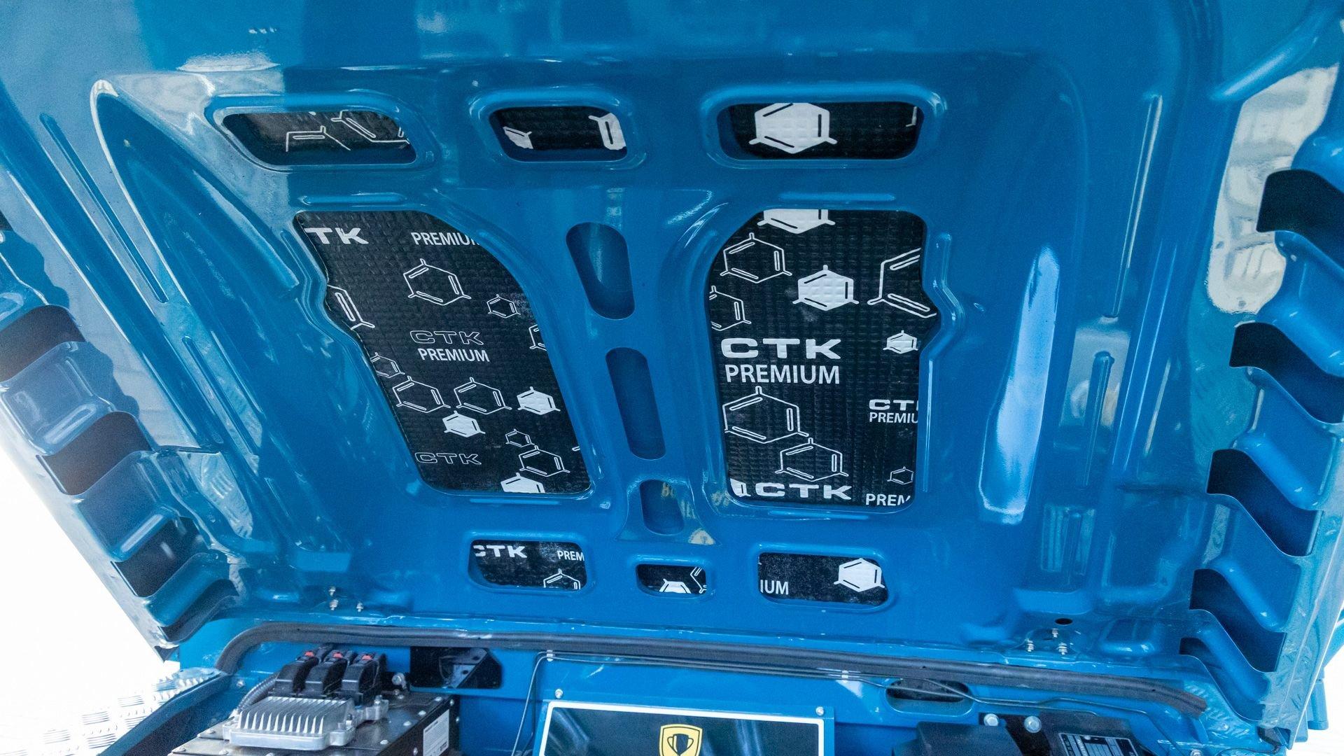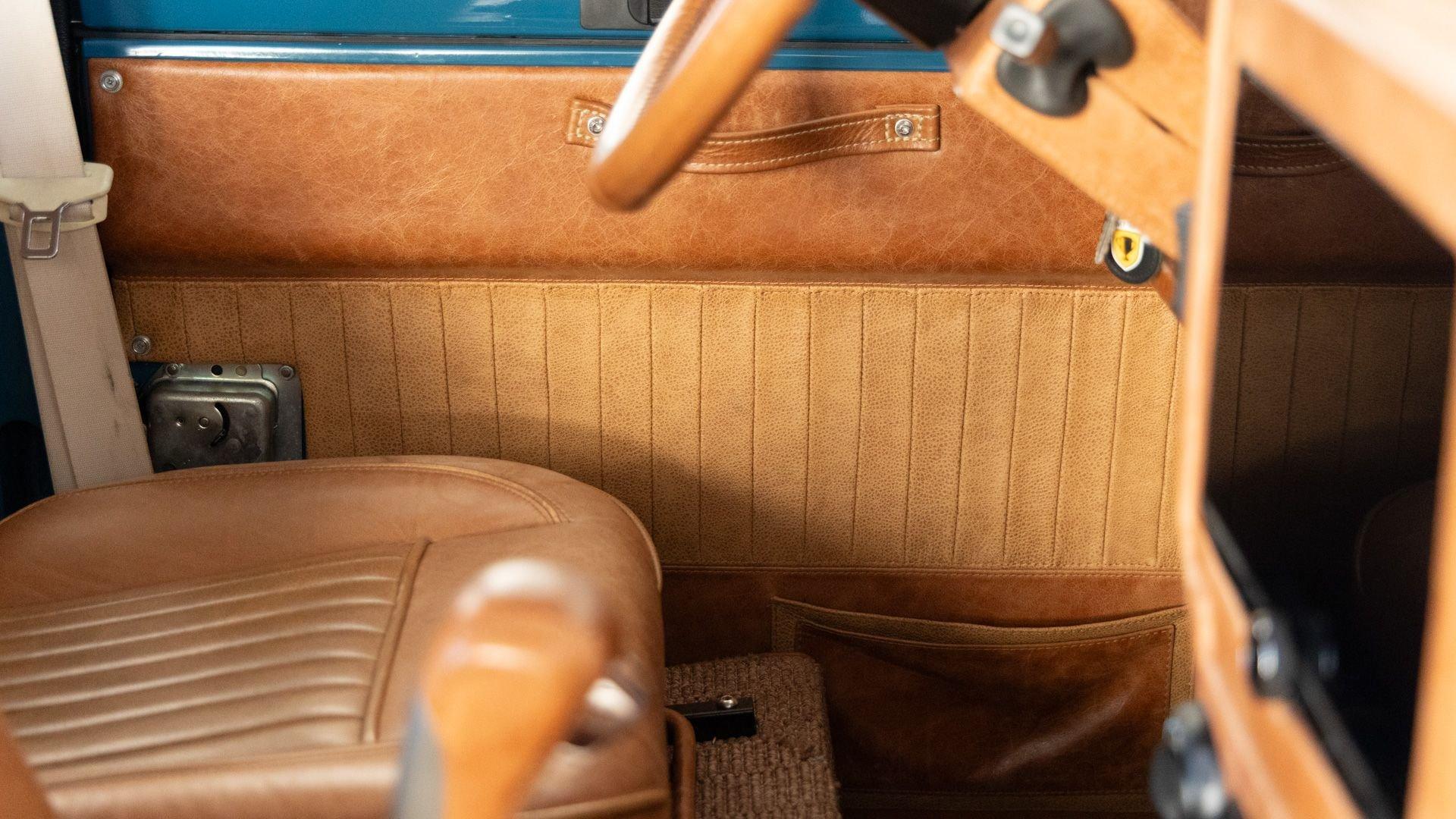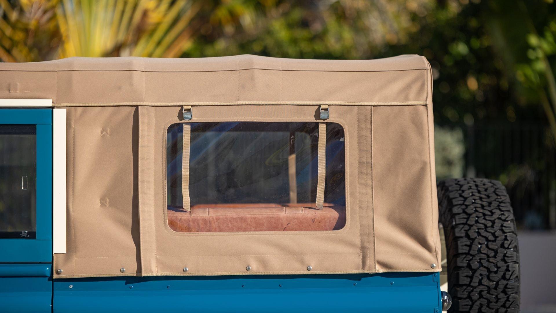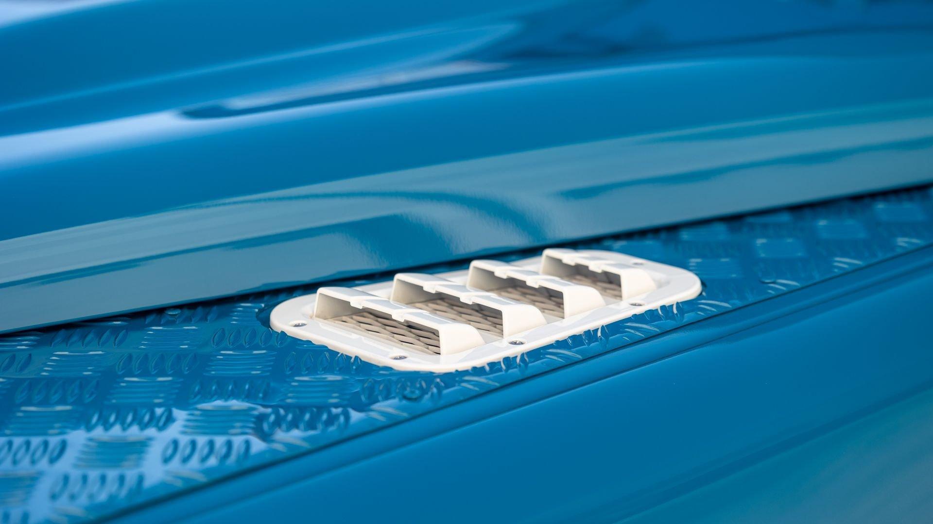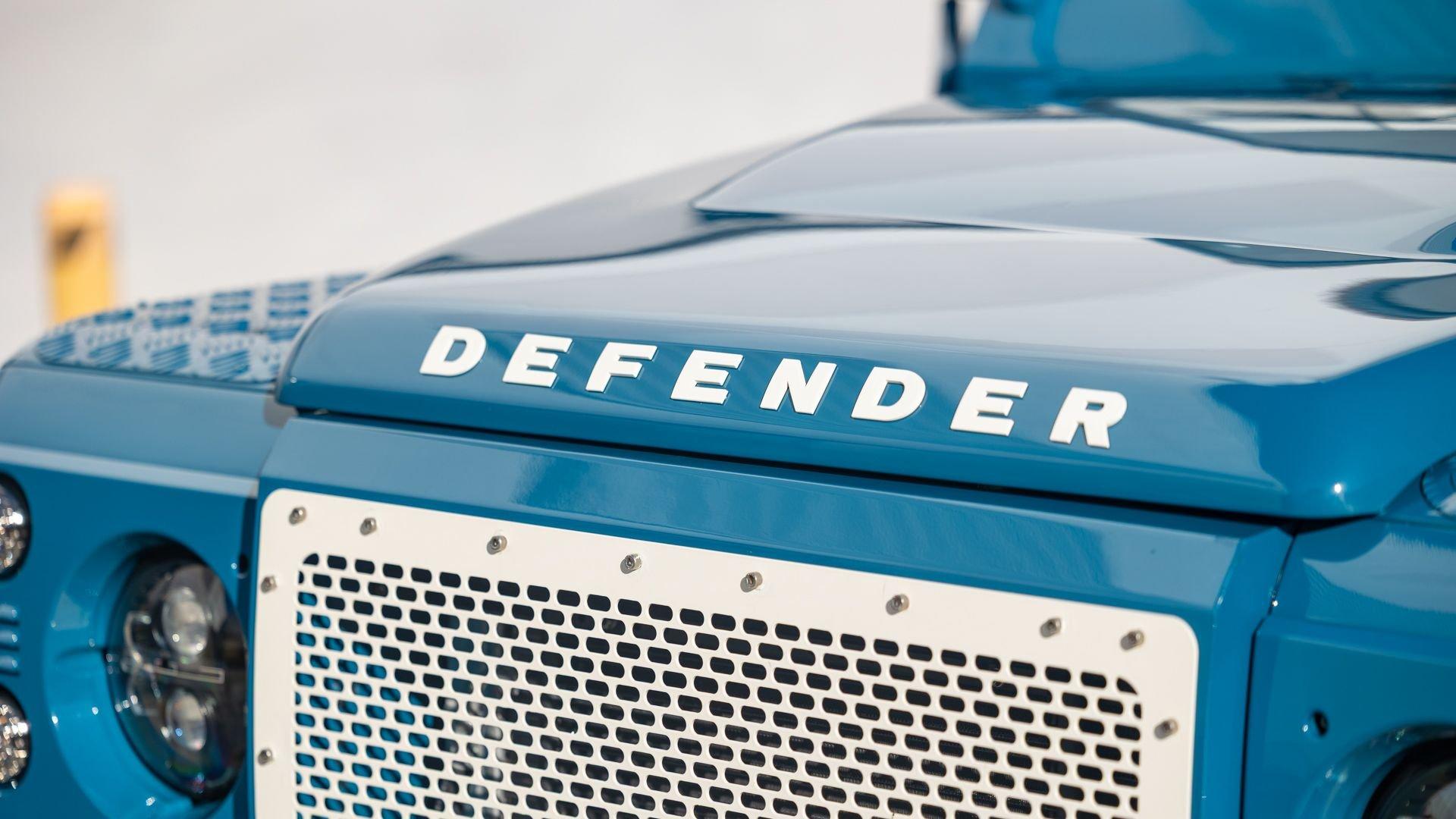 This particular D110 Rover Trophy Soft Top, noted as 002, is perhaps the epitome of the company's ethos. Built from a sandblasted and powder-coated chassis, the body, with numerous new components including its doors, hood, fenders, and bulkhead, is finished in Oslo Blue. The exterior is trimmed in Wimbledon White with matched 18-inch Custom Trophy Honeycomb white powder coated rims shod with BFGoodrich All-Terrain T/A KO2 Baja Champion tires. White Fire and Ice side steps clad with honey-colored wood tie into the freshly fitted mohair canvas soft top with zip-up windows.