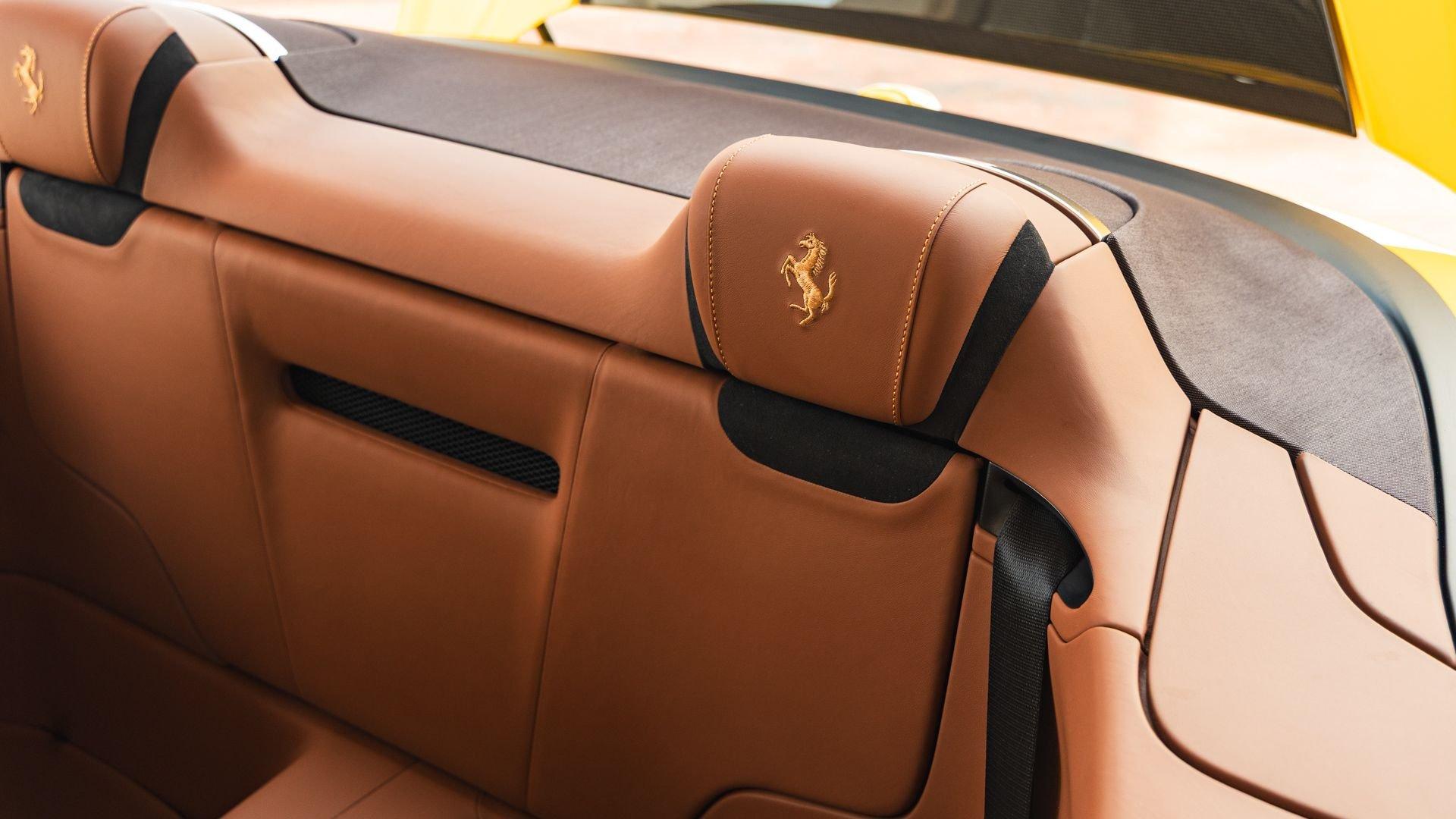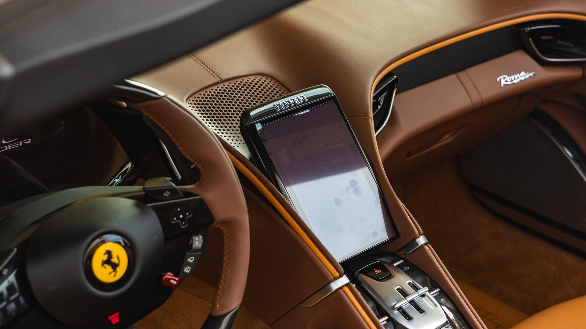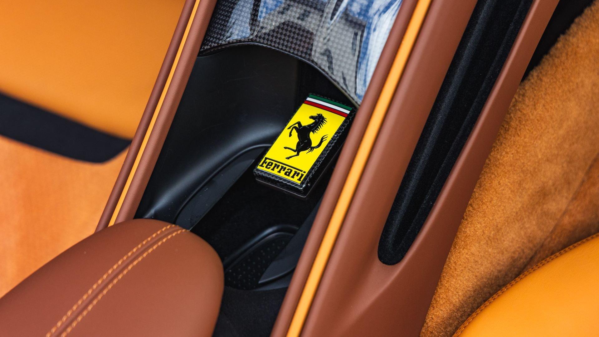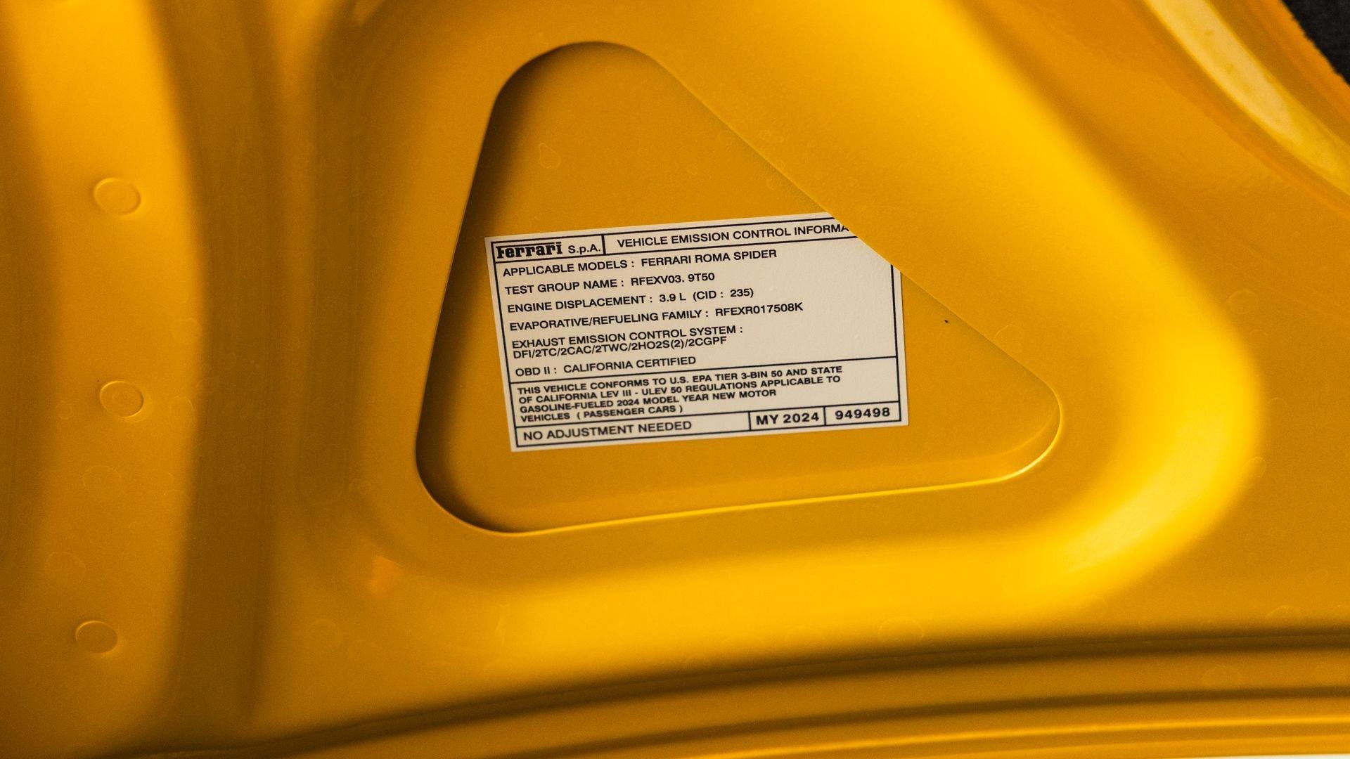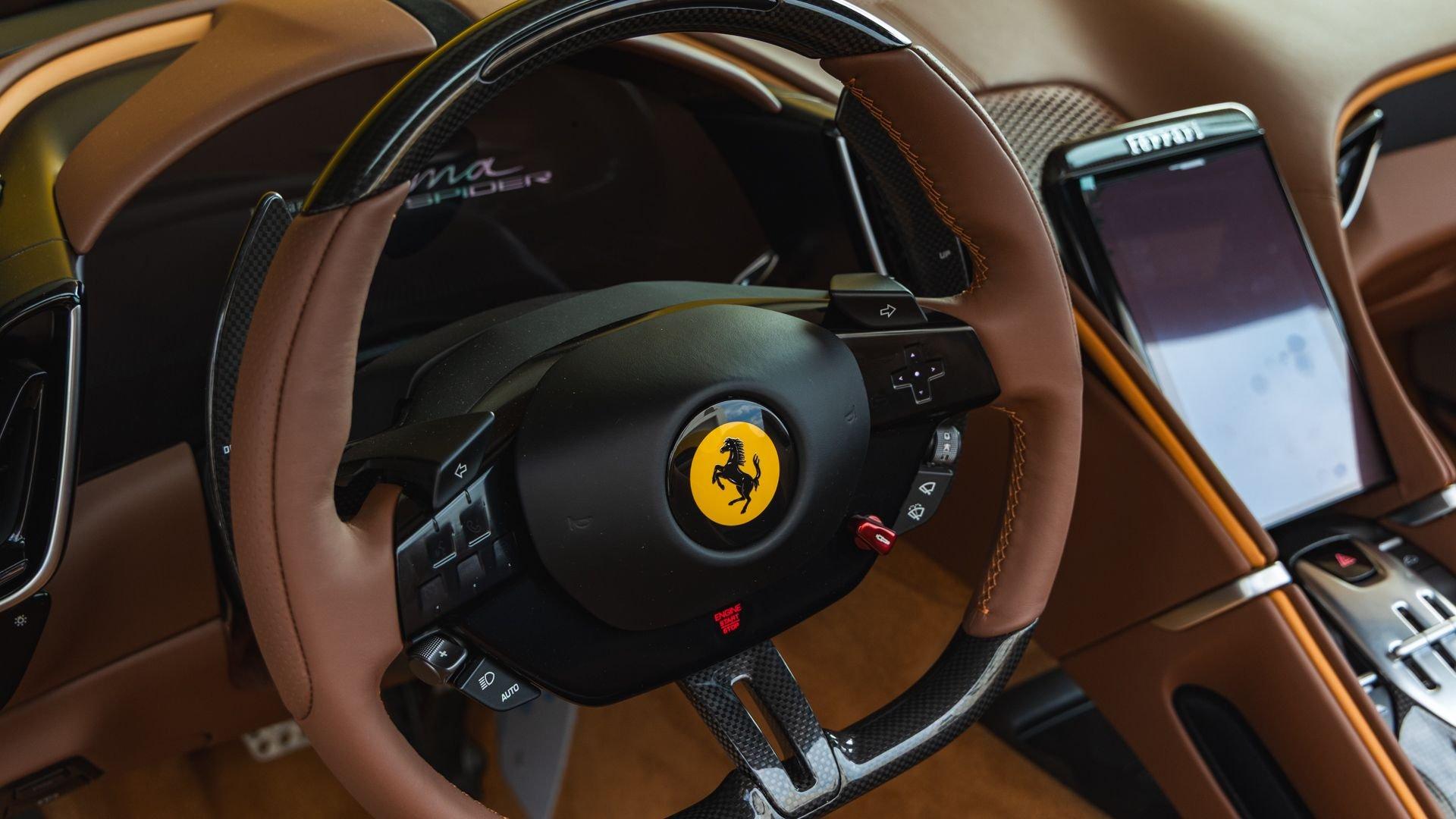 Specified in Extracampionario Giallo Triplo Strato over two-tone Beige Tradizione and Terra Bruciata leather, this 2024 Roma Spider presents a sophisticated, highly optioned configuration with numerous carbon-fiber upgrades. Exposed gloss carbon-fiber adorns the front spoiler, rear active aero spoiler, rear diffuser, exterior sill kick plates, and under-door covers, while extending the theme inside are carbon-fiber and dashboard inserts and upper tunnel trim, a carbon fiber-steering wheel with LED shift lights, and even a carbon-fiber vehicle key. Diamond-polished 20-inch forged wheels frame gold brake calipers, with black tailpipe tips and “Scuderia Ferrari” fender shields rounding out the impressive exterior specification.