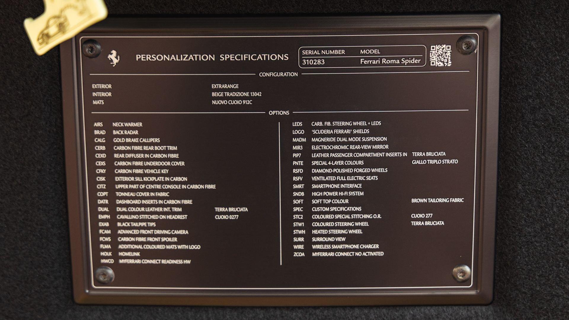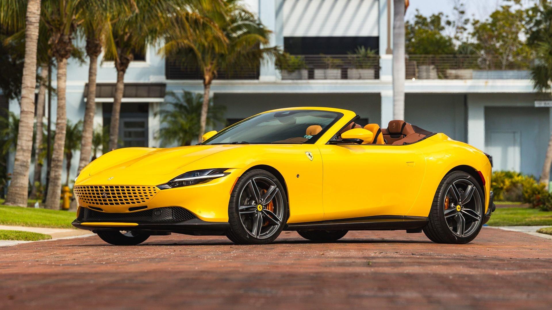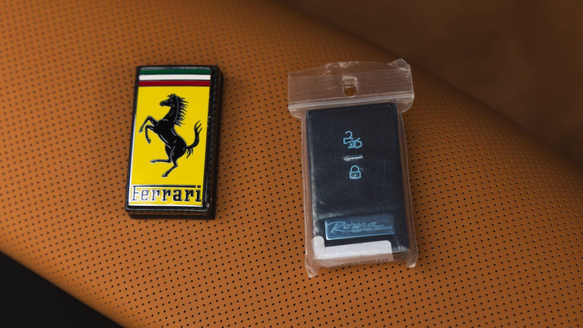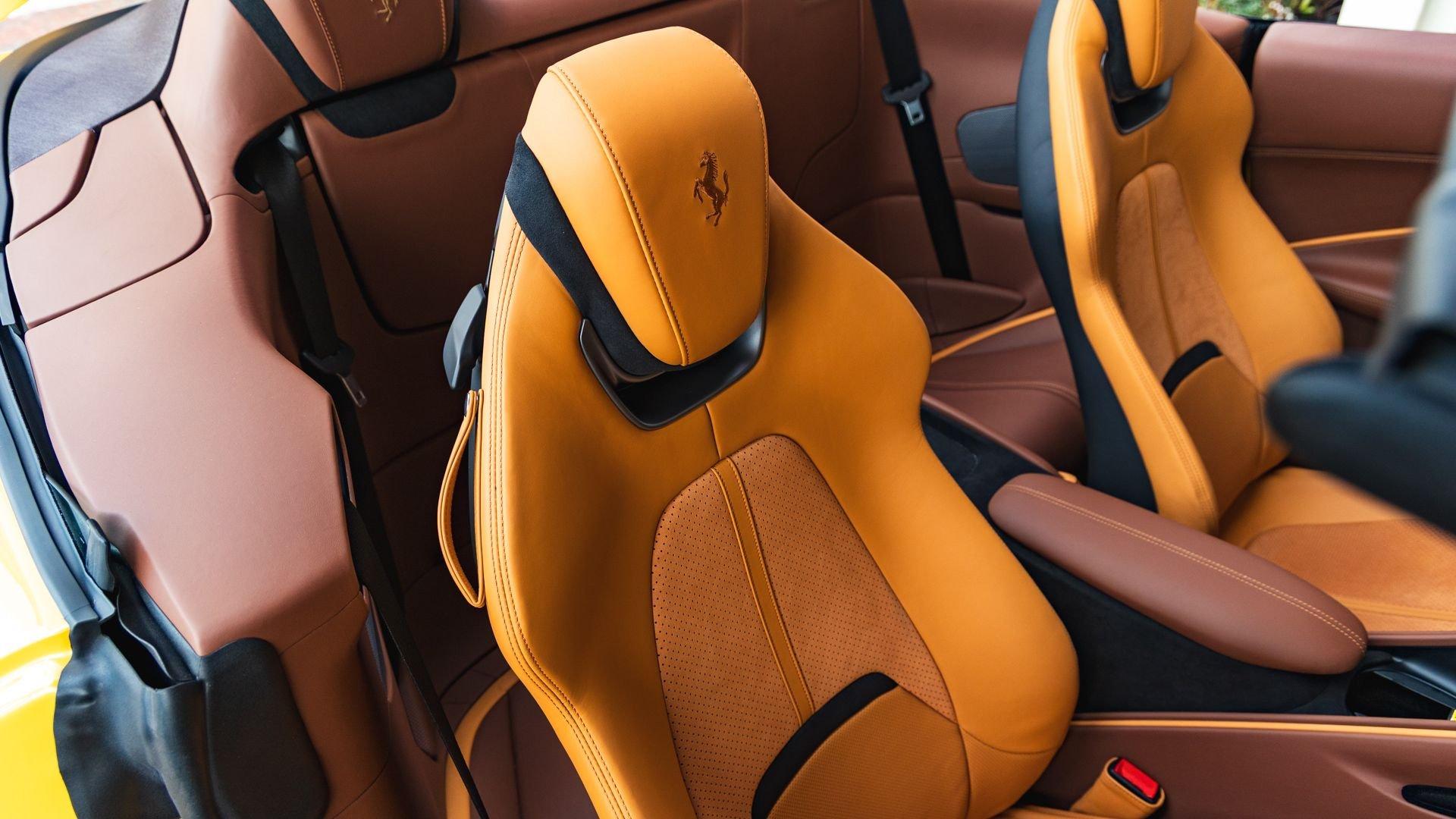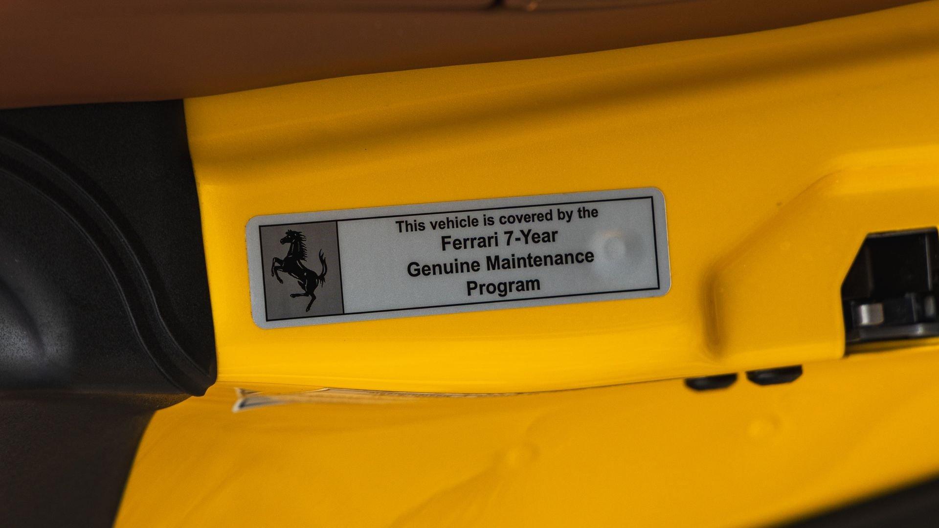 Specified in Extracampionario Giallo Triplo Strato over two-tone Beige Tradizione and Terra Bruciata leather, this 2024 Roma Spider presents a sophisticated, highly optioned configuration with numerous carbon-fiber upgrades. Exposed gloss carbon-fiber adorns the front spoiler, rear active aero spoiler, rear diffuser, exterior sill kick plates, and under-door covers, while extending the theme inside are carbon-fiber and dashboard inserts and upper tunnel trim, a carbon fiber-steering wheel with LED shift lights, and even a carbon-fiber vehicle key. Diamond-polished 20-inch forged wheels frame gold brake calipers, with black tailpipe tips and “Scuderia Ferrari” fender shields rounding out the impressive exterior specification.