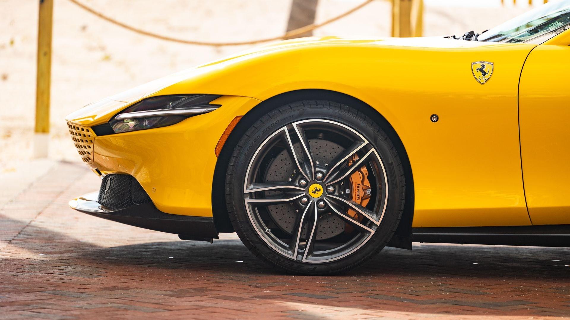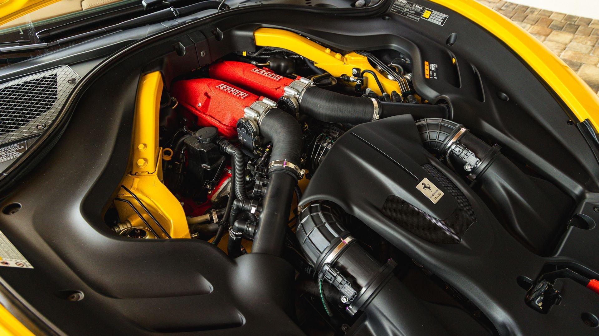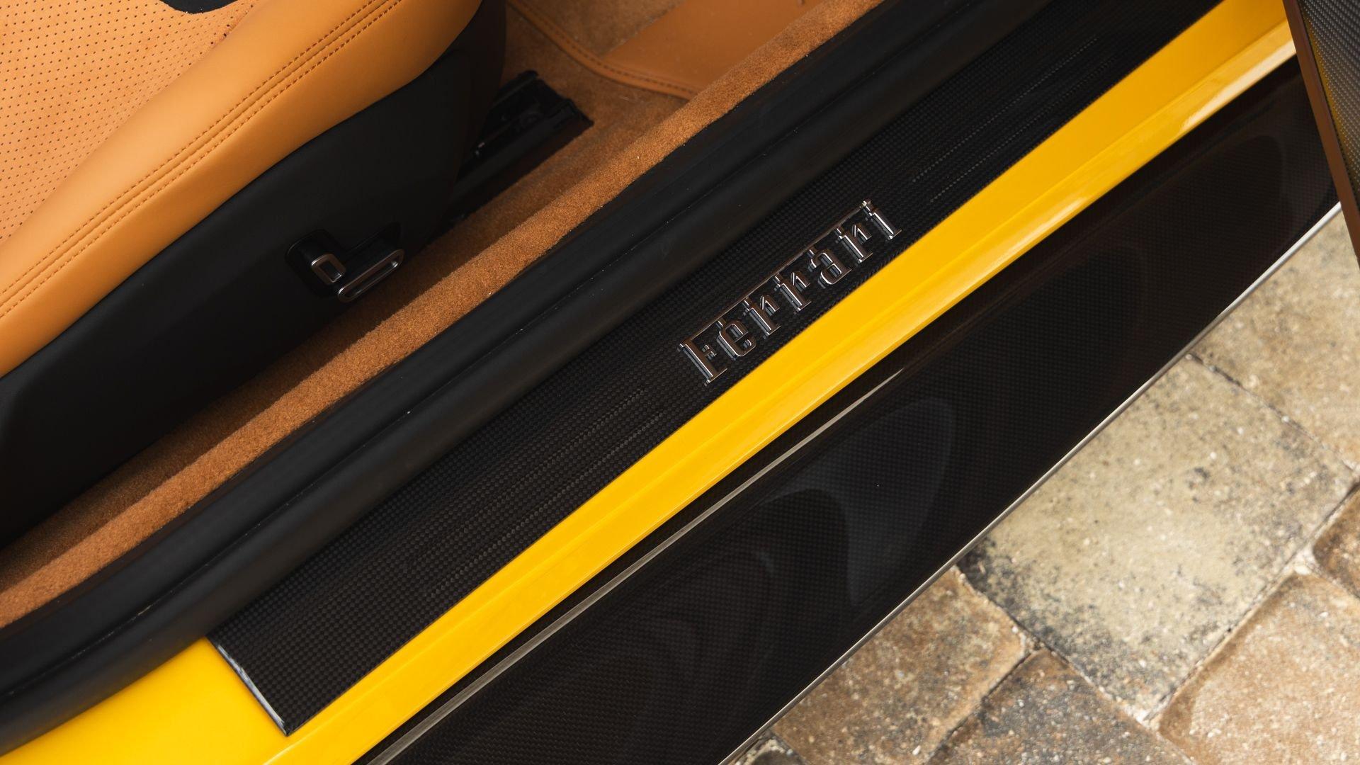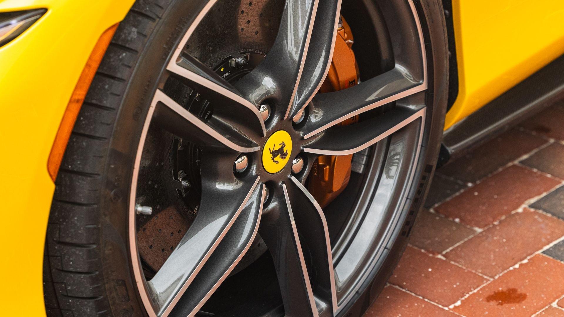 Specified in Extracampionario Giallo Triplo Strato over two-tone Beige Tradizione and Terra Bruciata leather, this 2024 Roma Spider presents a sophisticated, highly optioned configuration with numerous carbon-fiber upgrades. Exposed gloss carbon-fiber adorns the front spoiler, rear active aero spoiler, rear diffuser, exterior sill kick plates, and under-door covers, while extending the theme inside are carbon-fiber and dashboard inserts and upper tunnel trim, a carbon fiber-steering wheel with LED shift lights, and even a carbon-fiber vehicle key. Diamond-polished 20-inch forged wheels frame gold brake calipers, with black tailpipe tips and “Scuderia Ferrari” fender shields rounding out the impressive exterior specification.