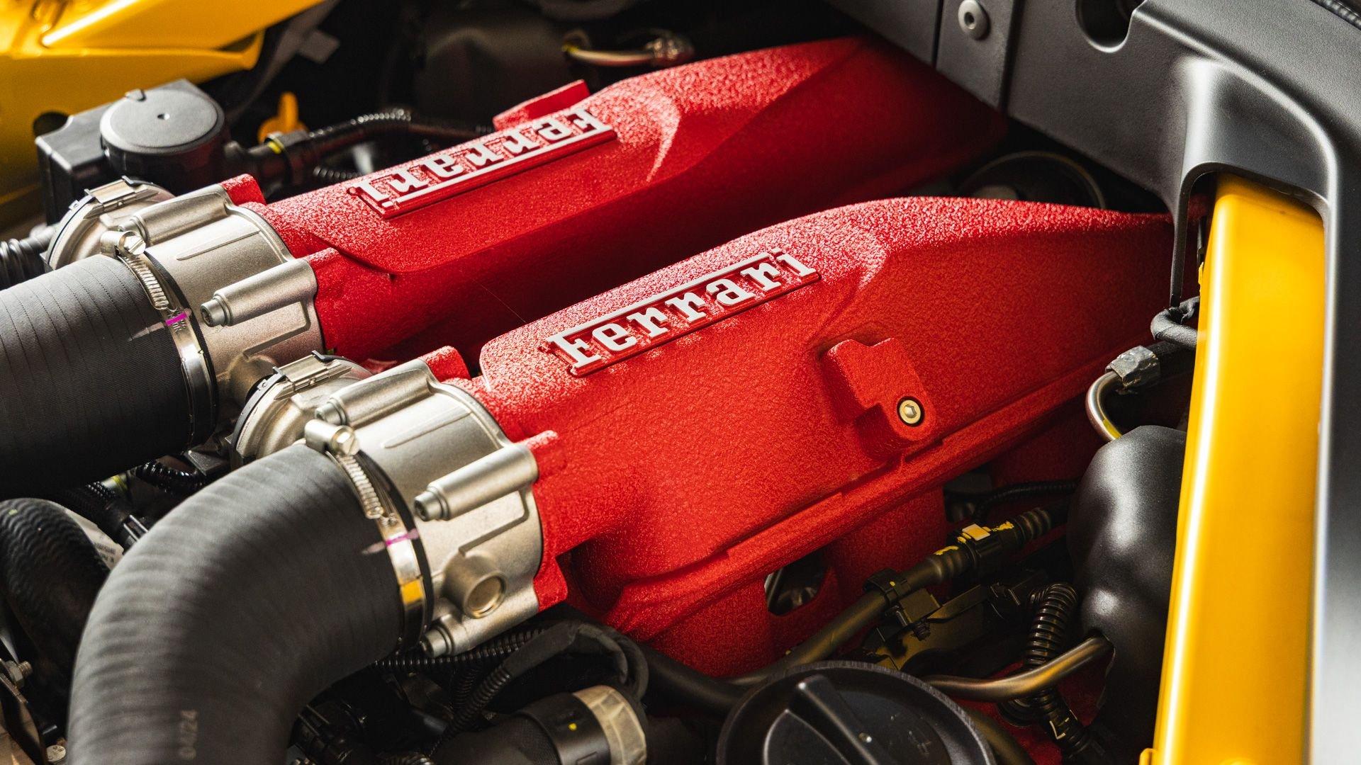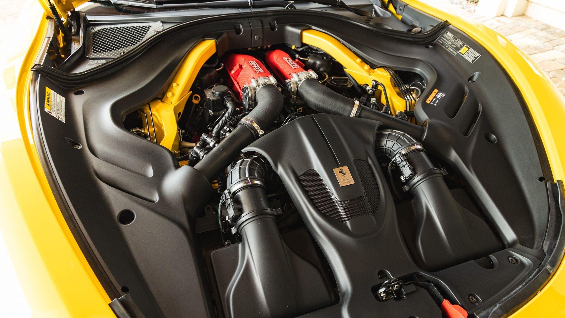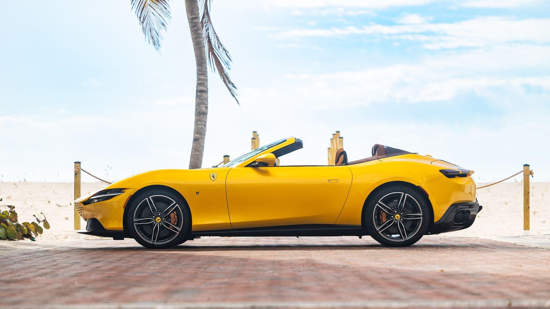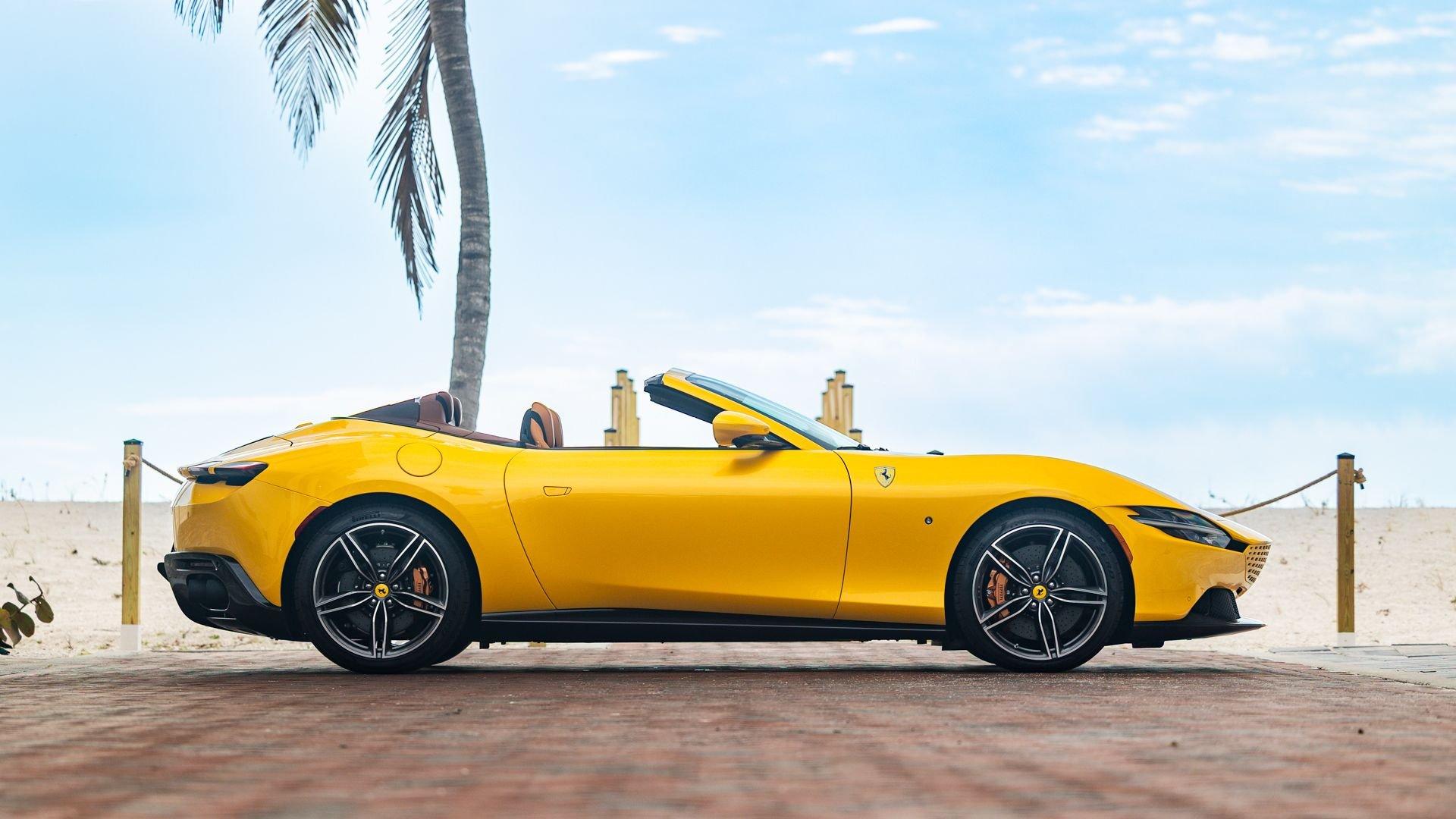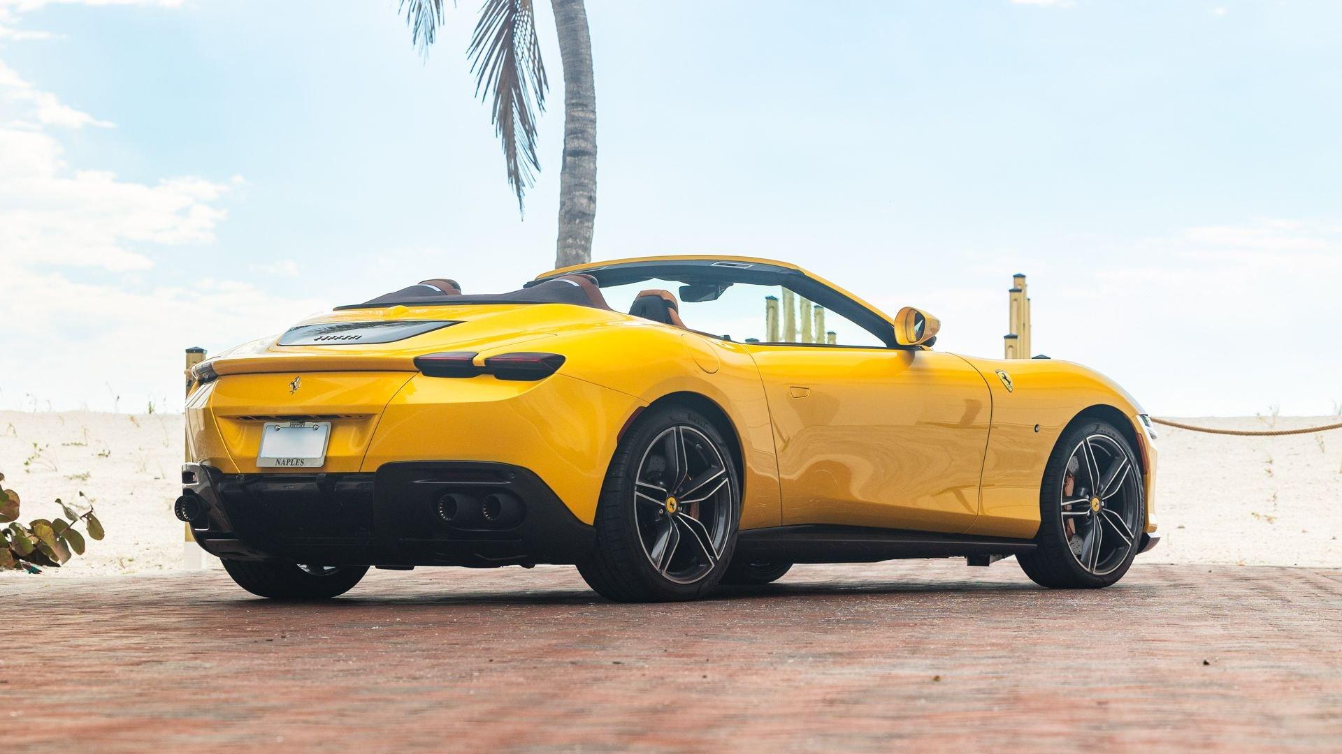 Specified in Extracampionario Giallo Triplo Strato over two-tone Beige Tradizione and Terra Bruciata leather, this 2024 Roma Spider presents a sophisticated, highly optioned configuration with numerous carbon-fiber upgrades. Exposed gloss carbon-fiber adorns the front spoiler, rear active aero spoiler, rear diffuser, exterior sill kick plates, and under-door covers, while extending the theme inside are carbon-fiber and dashboard inserts and upper tunnel trim, a carbon fiber-steering wheel with LED shift lights, and even a carbon-fiber vehicle key. Diamond-polished 20-inch forged wheels frame gold brake calipers, with black tailpipe tips and “Scuderia Ferrari” fender shields rounding out the impressive exterior specification.