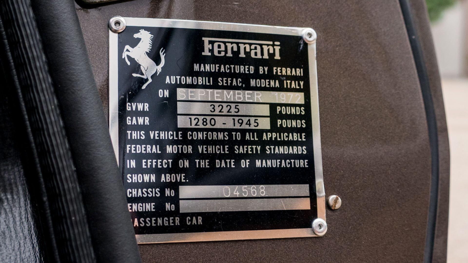 Leaving the factory on 17 January 1973, and imported to the United States through Chinetti-Garthwaite Ferrari of Pennsylvania, this example was delivered new to its first owner, Dr. José Guzman of Kenton, Ohio, on May 31 of the same year, via the dealer European Motor Garage, finished in the distinctly 1970s color combination of Marrone Metallizzato over a Beige leather interior.