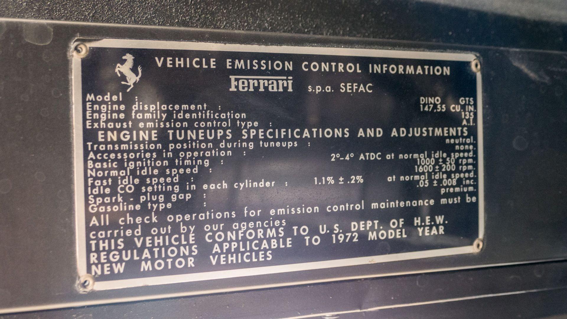 Unveiled at the 1972 Geneva International Motor Show, the GTS version, a Scaglietti-built Targa-style convertible, benefited from the evolutionary updates introduced on the GT and featured a black removable roof panel, with the rear quarter windows replaced by metal sail panels incorporating three air vents. Thanks to its mid-rear configuration, which allowed for ideal weight distribution, and a more streamlined front end, the Dino-originally conceived as a brand extension-quickly became a beloved sports car worthy of the Ferrari name. Its success was such that orders continued to pour in even after production came to an end in 1974.