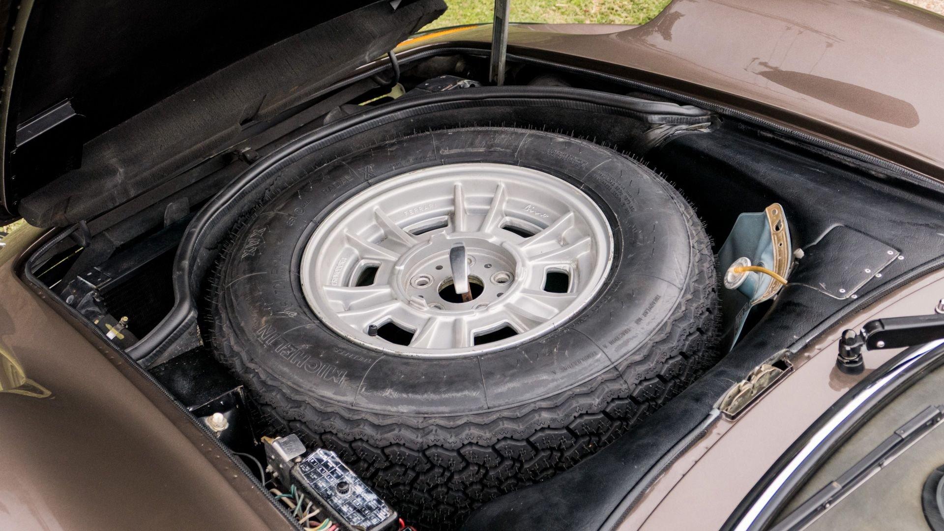Enjoyed by its current owner since 2022, the car has since undergone a comprehensive cosmetic restoration, including a full repaint and a complete interior retrim, both executed in its original factory color scheme. The 14-inch Cromodora wheels, fitted with yellow Dino-branded center caps and shod with correct Michelin XWX tires and accompanied by a matching spare wheel, complete the iconic silhouette of this Dino 246 GTS.
