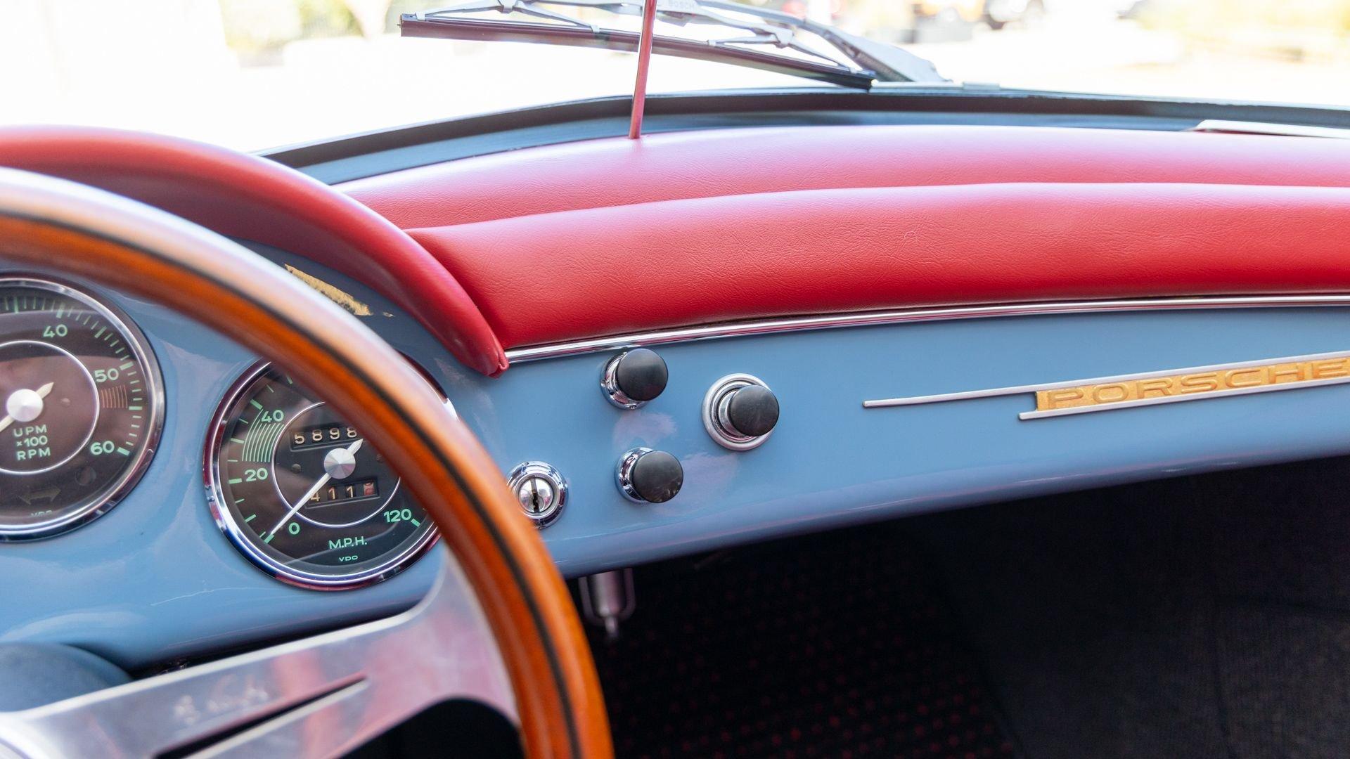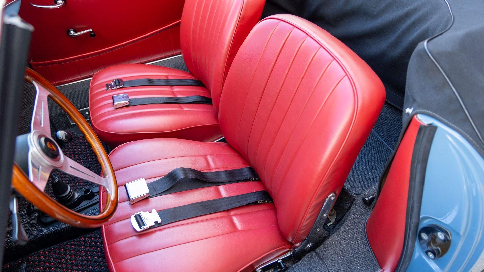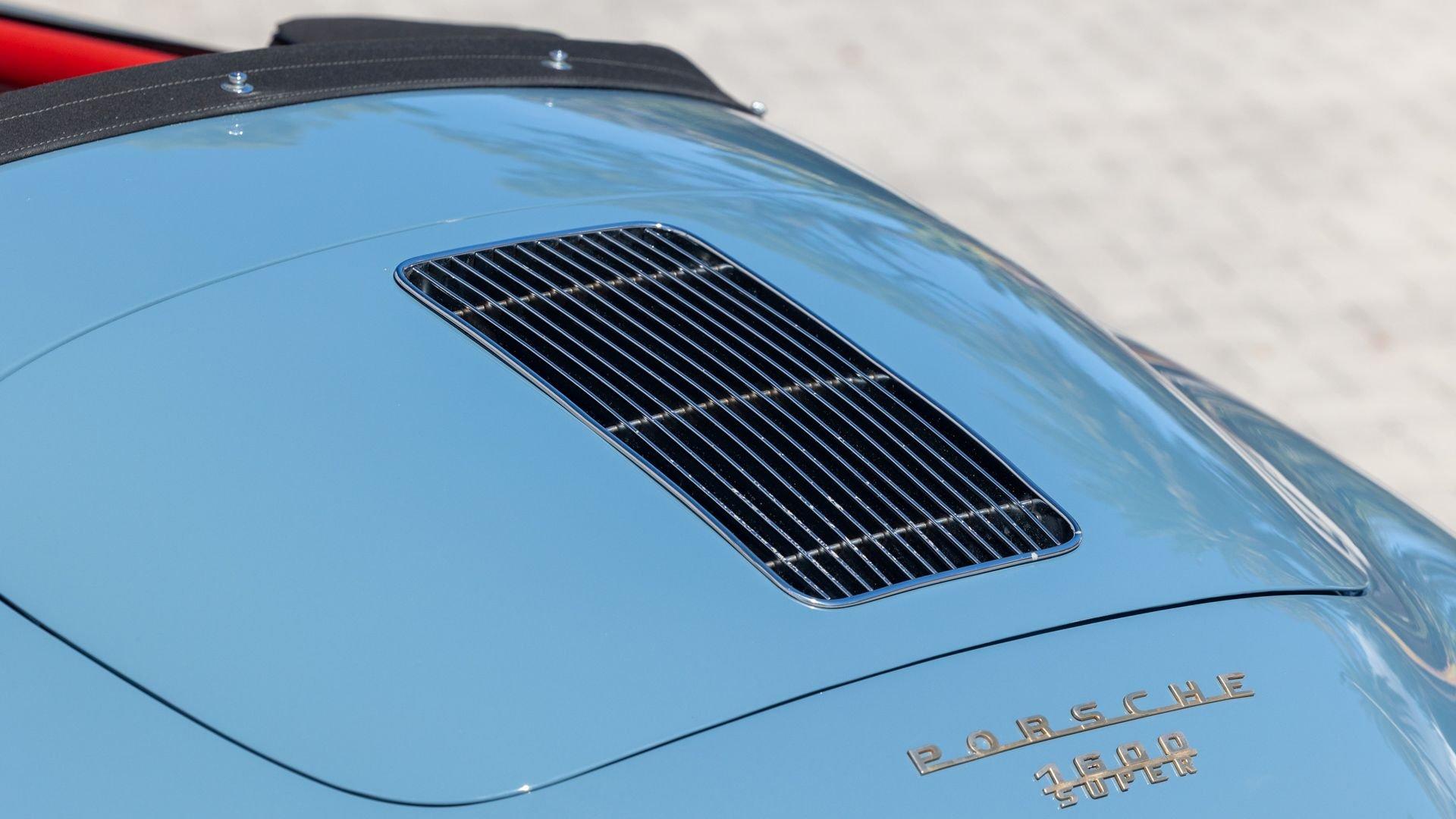 Today, the Roadster continues to wear a red-upholstered interior with charcoal square-weave carpeting as new. Its body-color dashboard is set with three VDO gauges framed by a wood-rimmed, three-spoke Nardi steering wheel. The exterior has been refinished in the refreshing shade of Aetna Blue, a period-correct color offered in 1960 and 1961 and paired with a matching blue soft top. It is fitted with an air-cooled flat-four Type 616/15 from a 1965 model year 1600 C offering a 15-horsepower boost over the original unit along with a four-speed transmission from the same era.