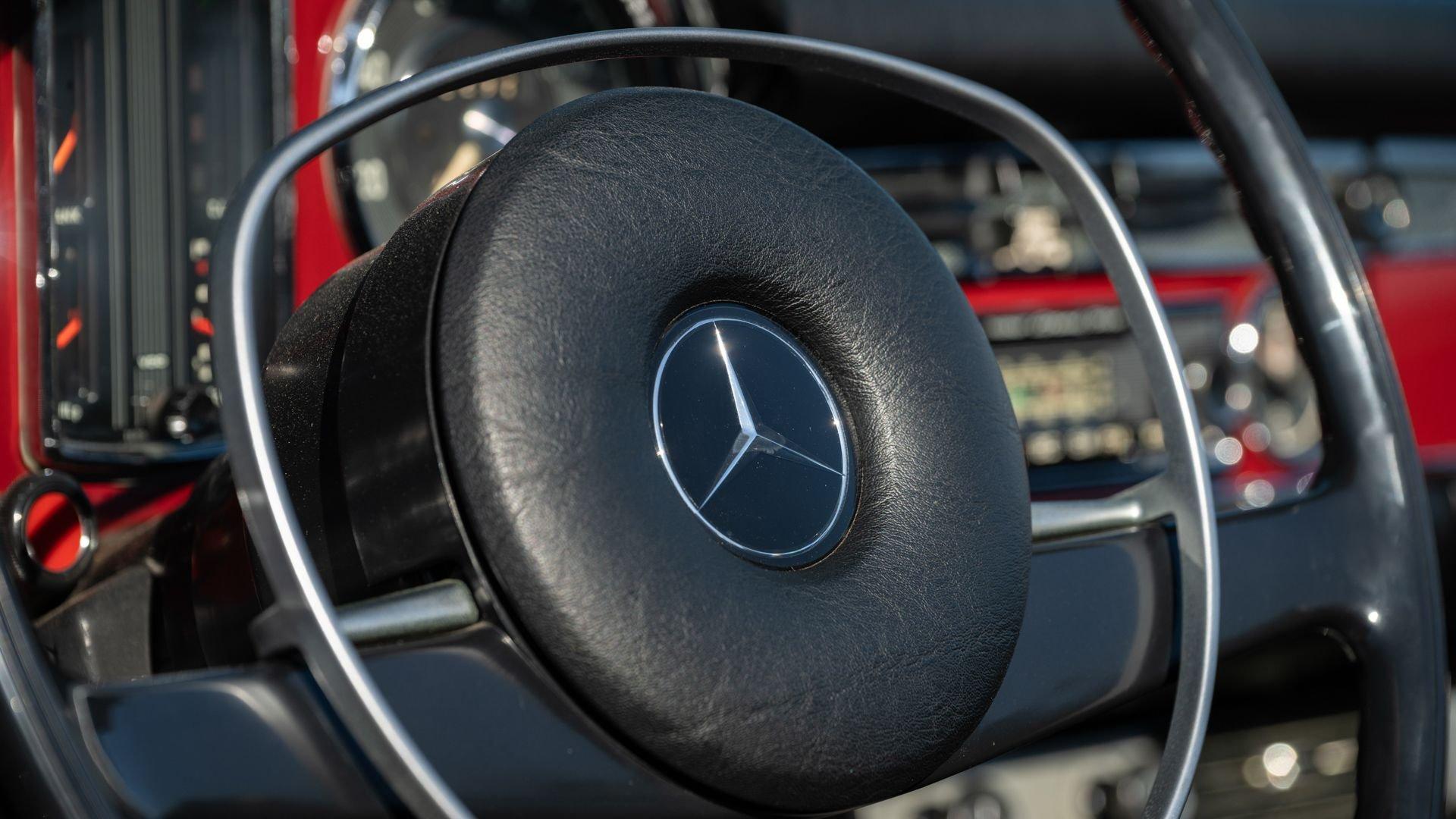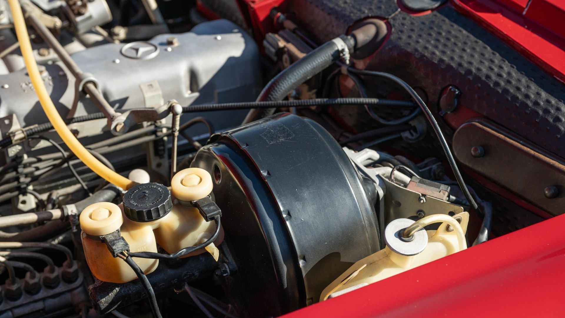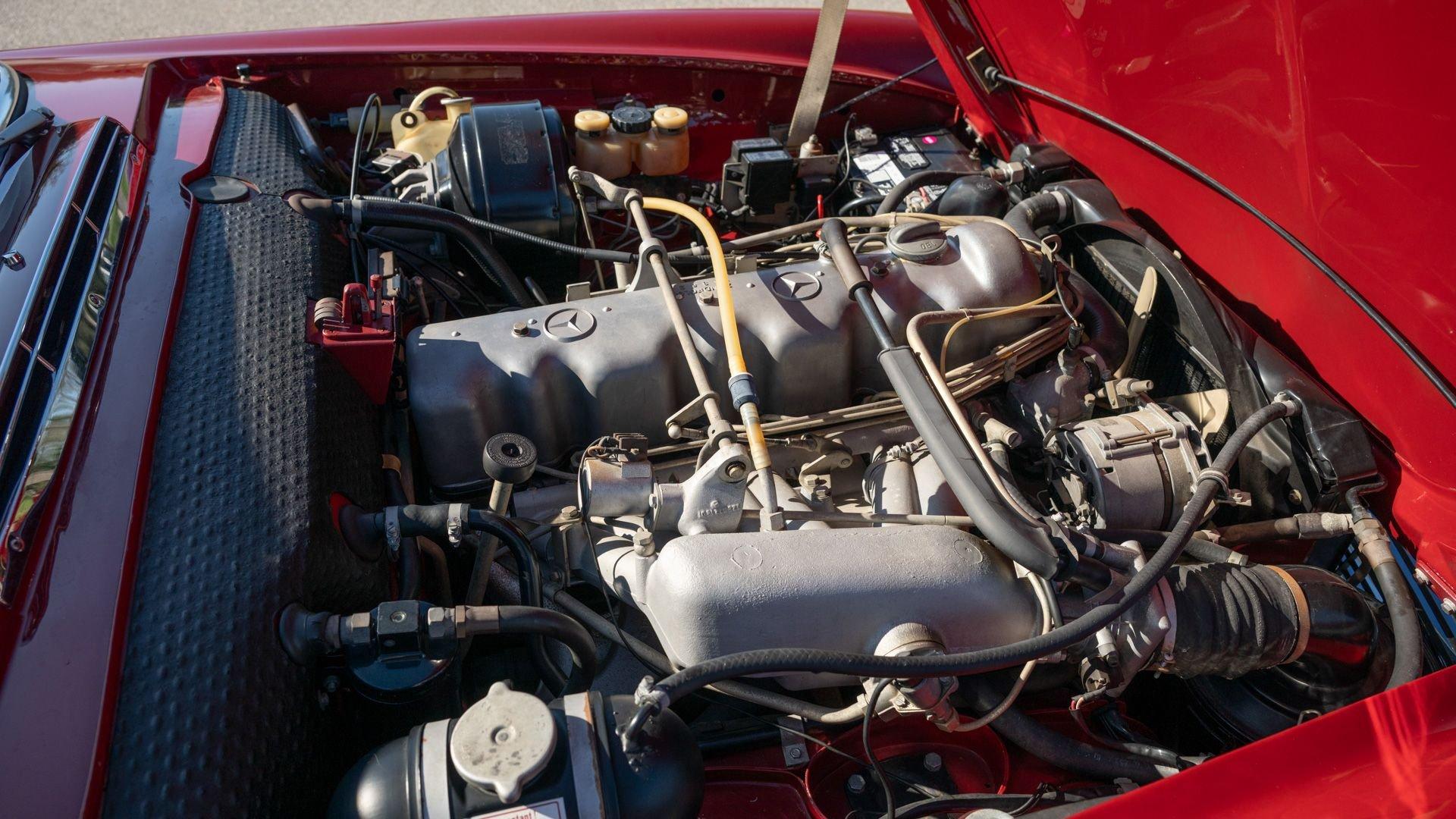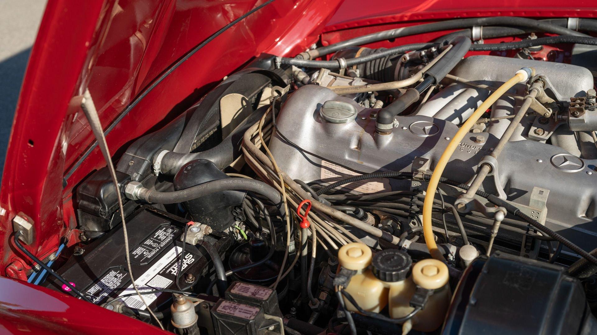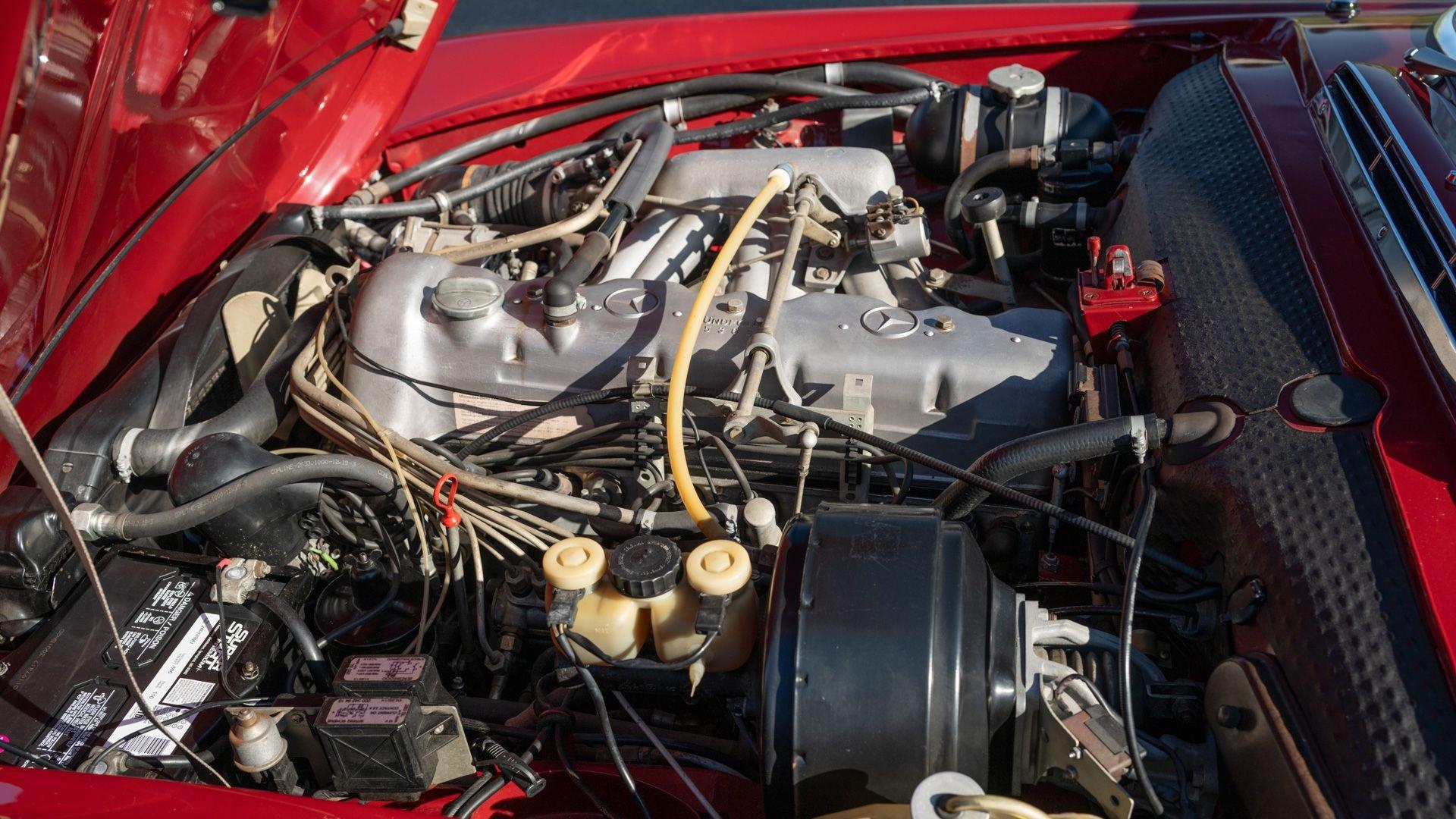 Today the 280 SL shows beautifully throughout, with the 576 Deep Red exterior paint redone to by Mr. Platz still in very nice condition, while the interior appears to be original, with the exception of the carpets, which were recently professionally replaced by the factory correct type and color. A recent inspection reveals that the original engine and transmission remain in the car, and inside, next to the classic Becker Grand Prix radio, is the period Frigiking air conditioning system fitted, of the correct type which the Mercedes-Benz dealers would offer to these cars in the early 1970s, as the factory didn't offer that option.