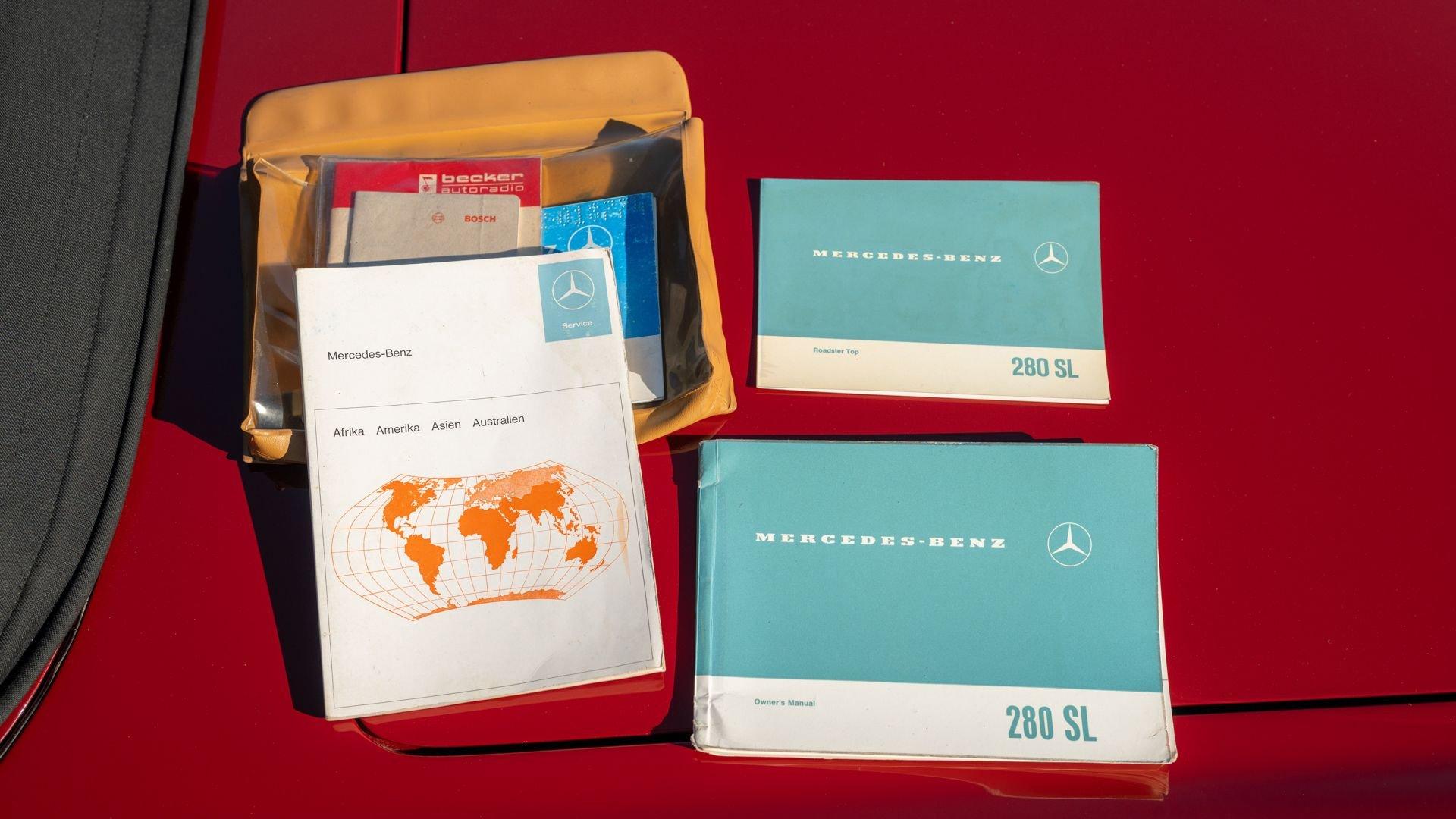 Body number 3453 is stamped on panels, which display very good fit, and original spotwelds reveal a sound car spared from neglect. The engine compartment and undercarriage are equally impressive, displaying correct, clean finishes. A black convertible top is fitted, renewed at some stage as well. The 280 SL is offered with its restoration records of Mr. Platz's work, original manuals in a pouch, including an owner's manual, service book stamped with chassis number, Becker radio manual and a digital copy of the Mercedes-Benz issued Data Card.