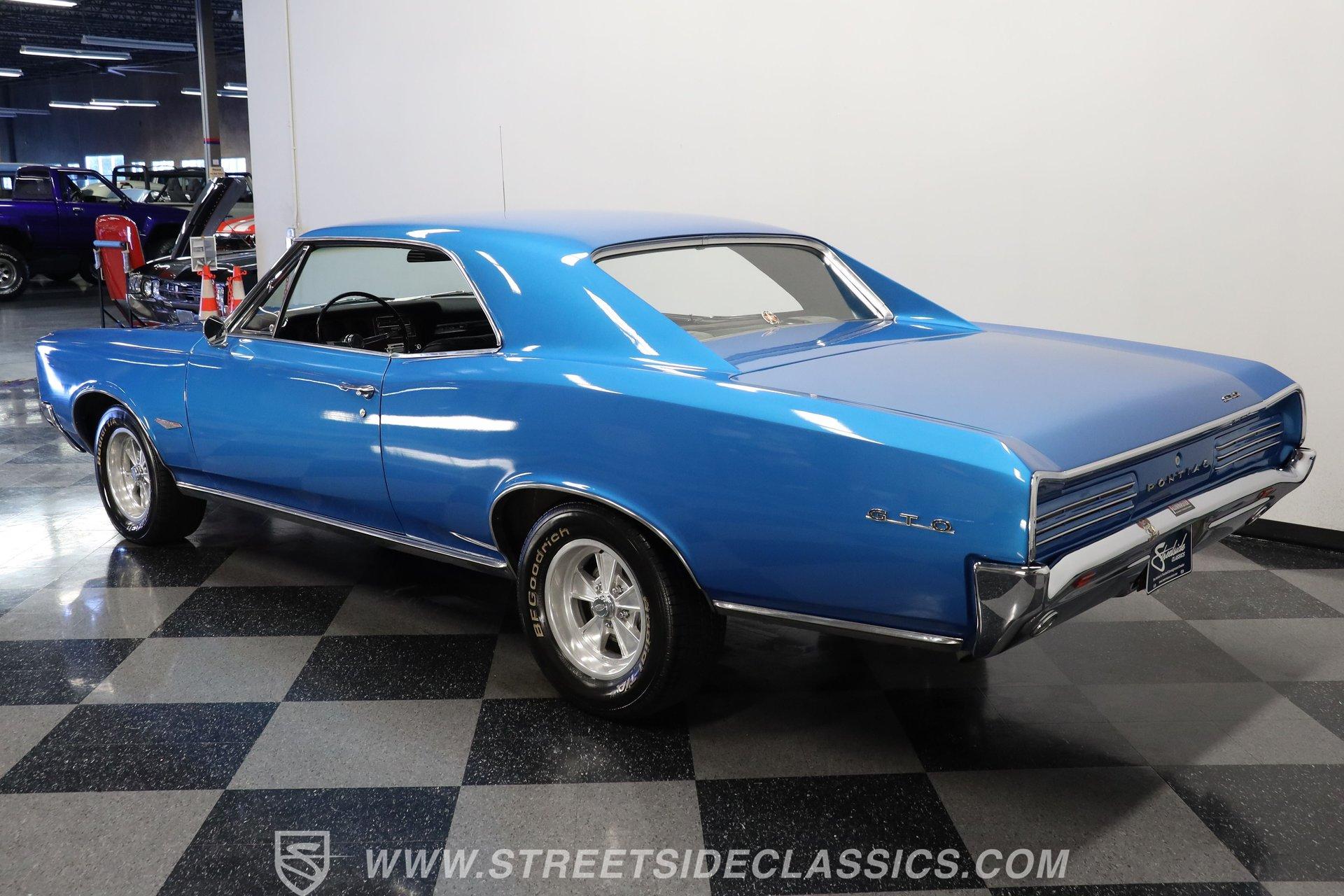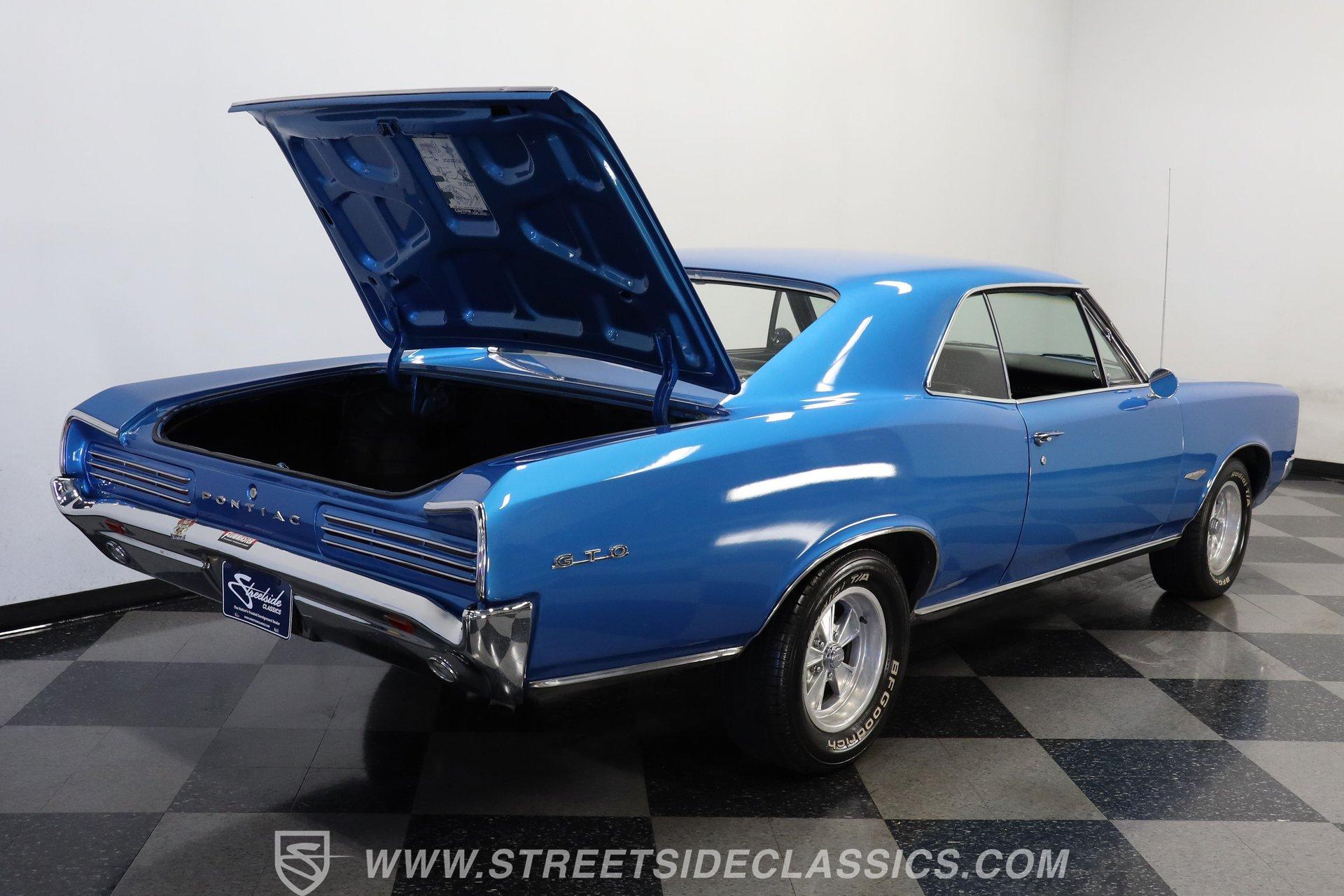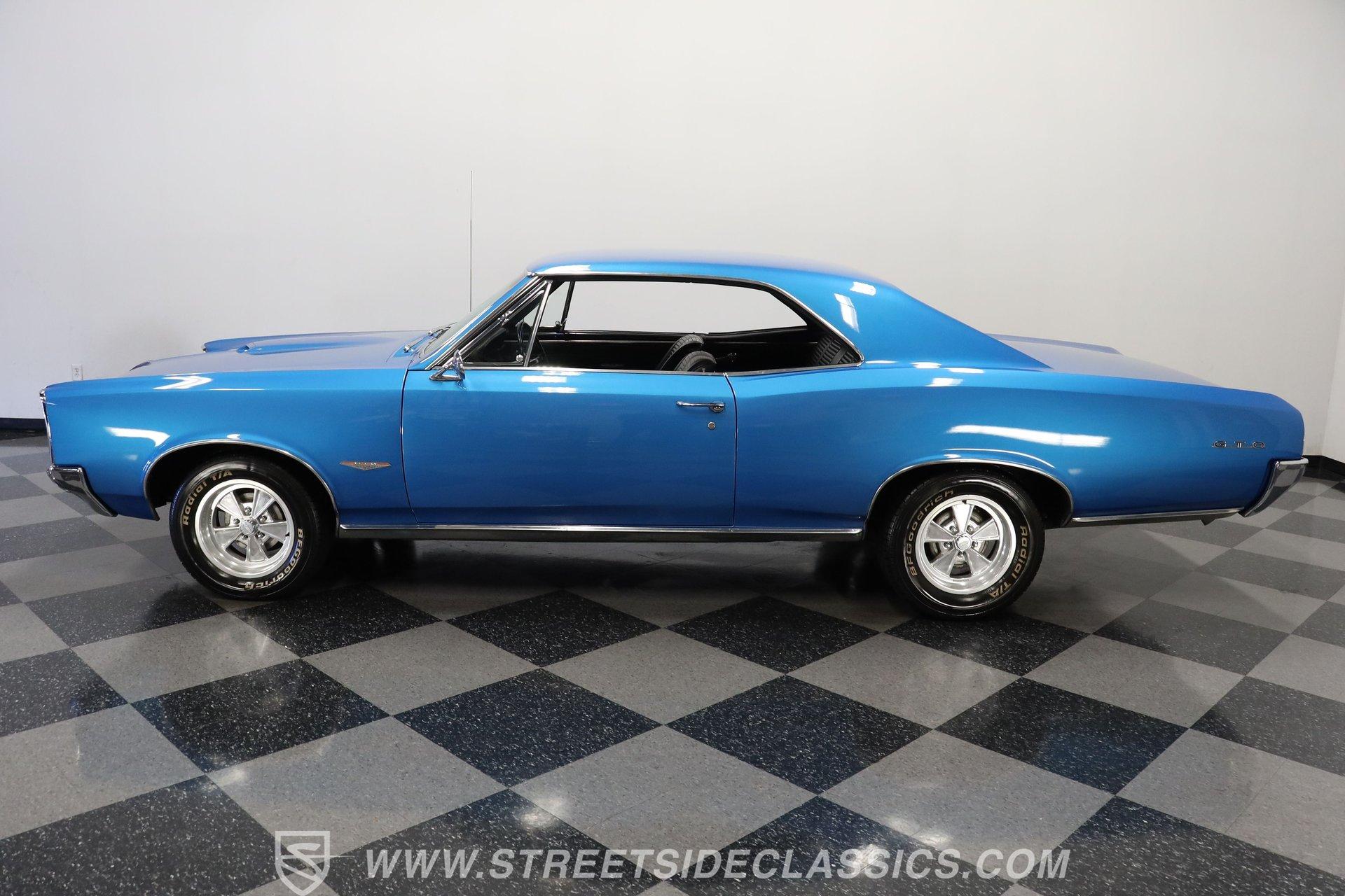 This 1966 Pontiac GTO showcases a Medium Blue Metallic exterior, accenting its muscular body. The iconic split grille and stacked headlights define its aggressive front end, while the hardtop profile emphasizes the GTO's sleek lines. Chrome bumpers add a touch of brilliance to both ends, and dual exhaust tips peek out from beneath the rear. Mounted on nostalgic 15-inch Cragar wheels and BF Goodrich Radial T/A tires staggered 235/60R15 front and 255/60R25 rear, this Pontiac exemplifies classic muscle car design.