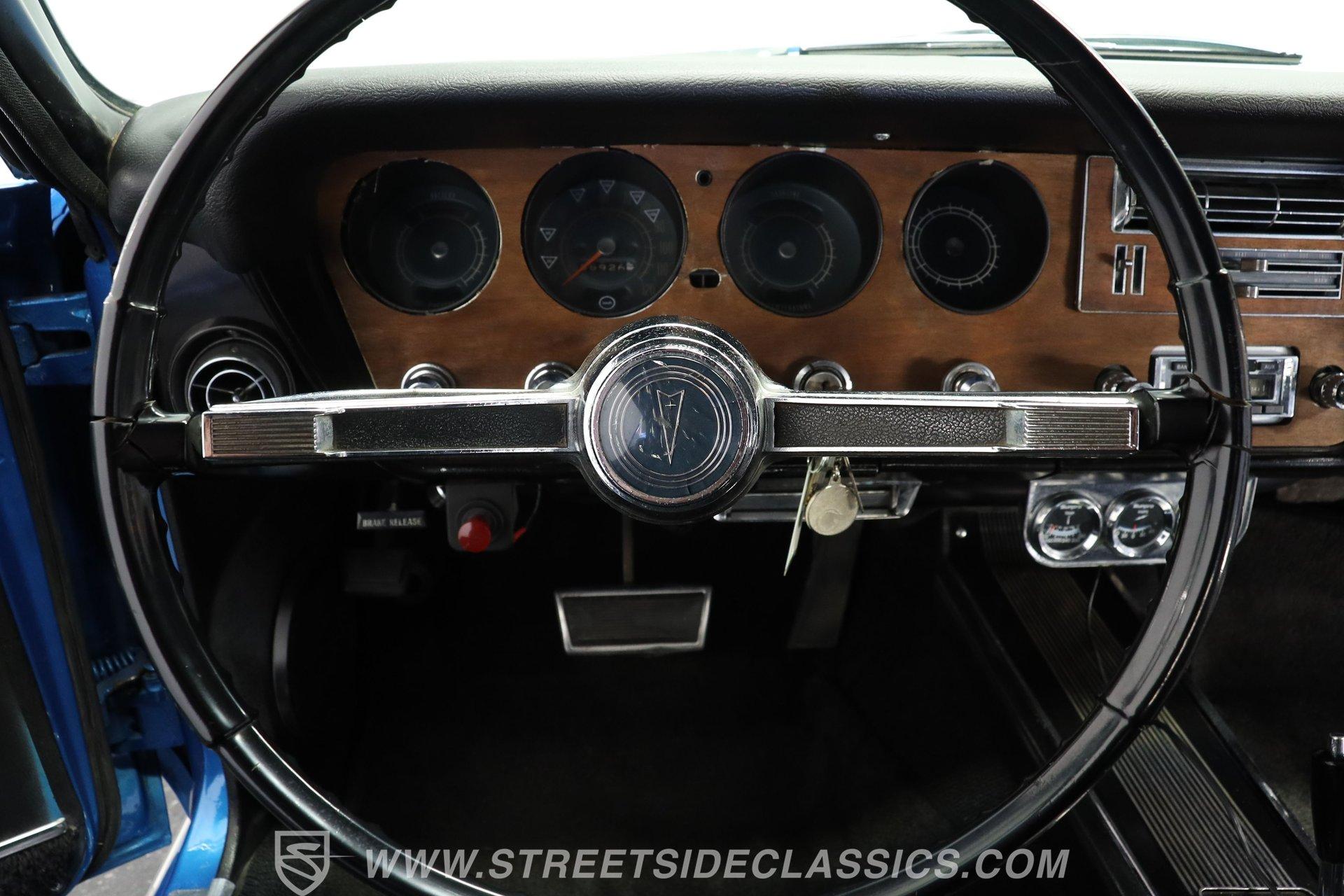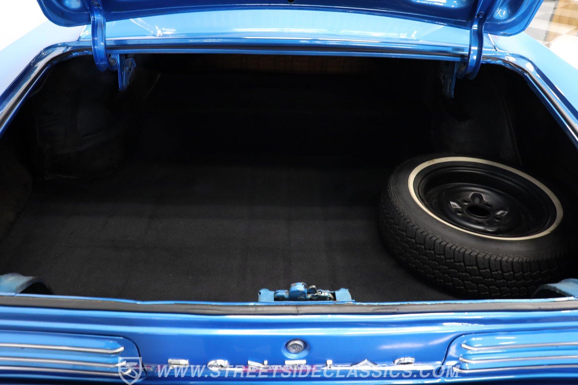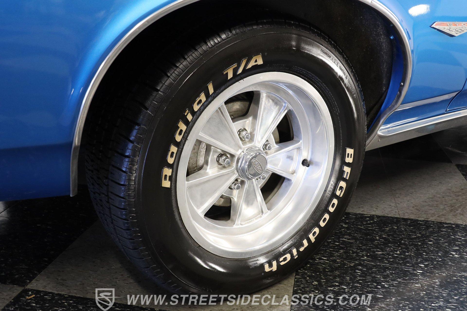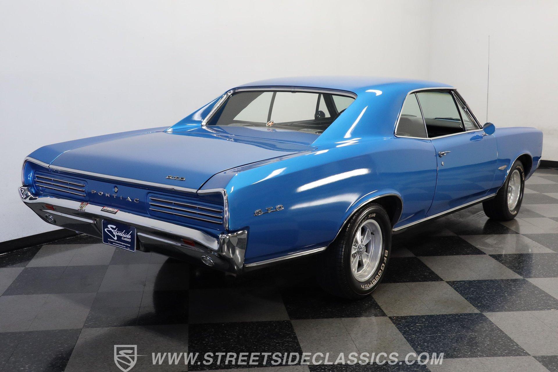 This 1966 Pontiac GTO showcases a Medium Blue Metallic exterior, accenting its muscular body. The iconic split grille and stacked headlights define its aggressive front end, while the hardtop profile emphasizes the GTO's sleek lines. Chrome bumpers add a touch of brilliance to both ends, and dual exhaust tips peek out from beneath the rear. Mounted on nostalgic 15-inch Cragar wheels and BF Goodrich Radial T/A tires staggered 235/60R15 front and 255/60R25 rear, this Pontiac exemplifies classic muscle car design.