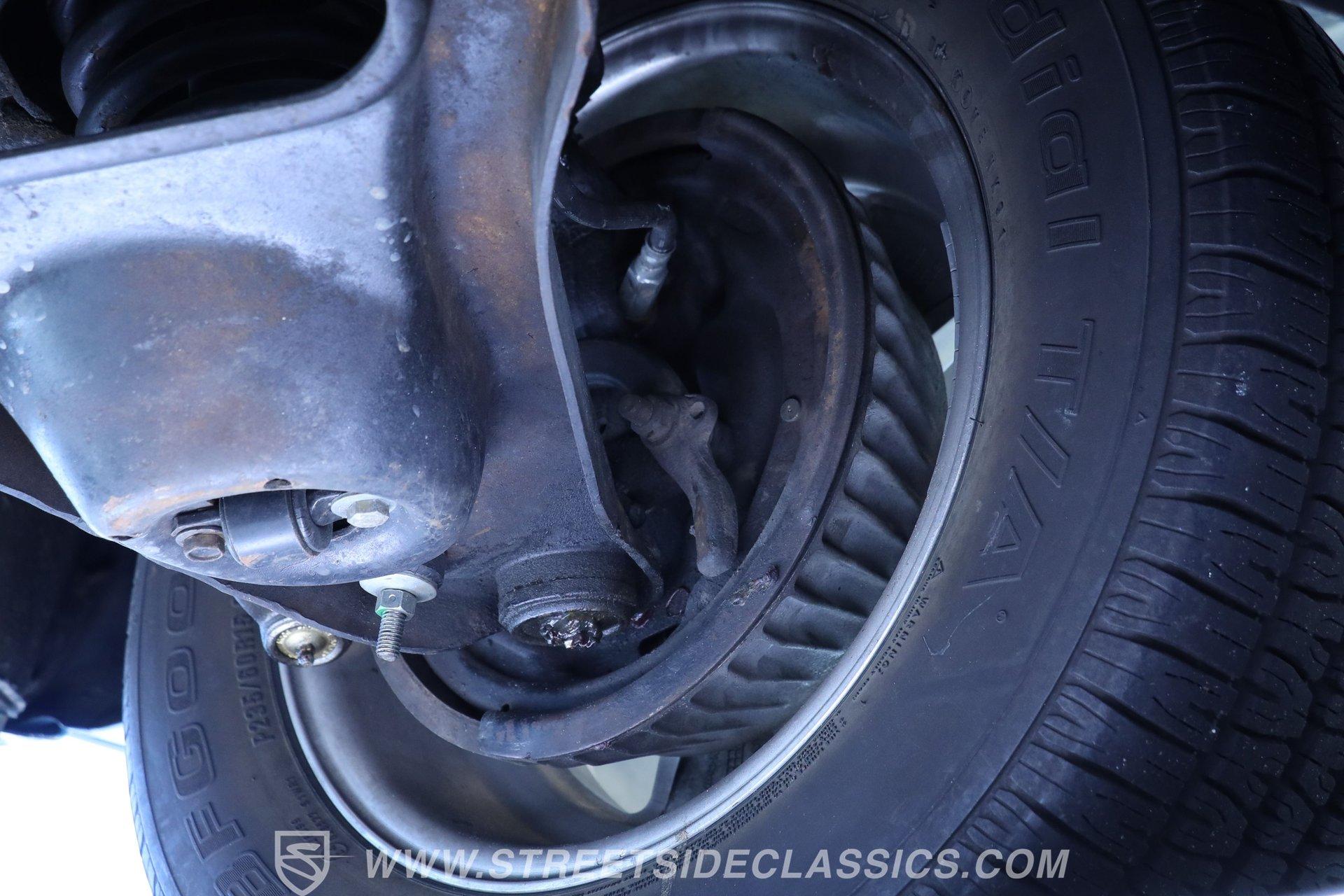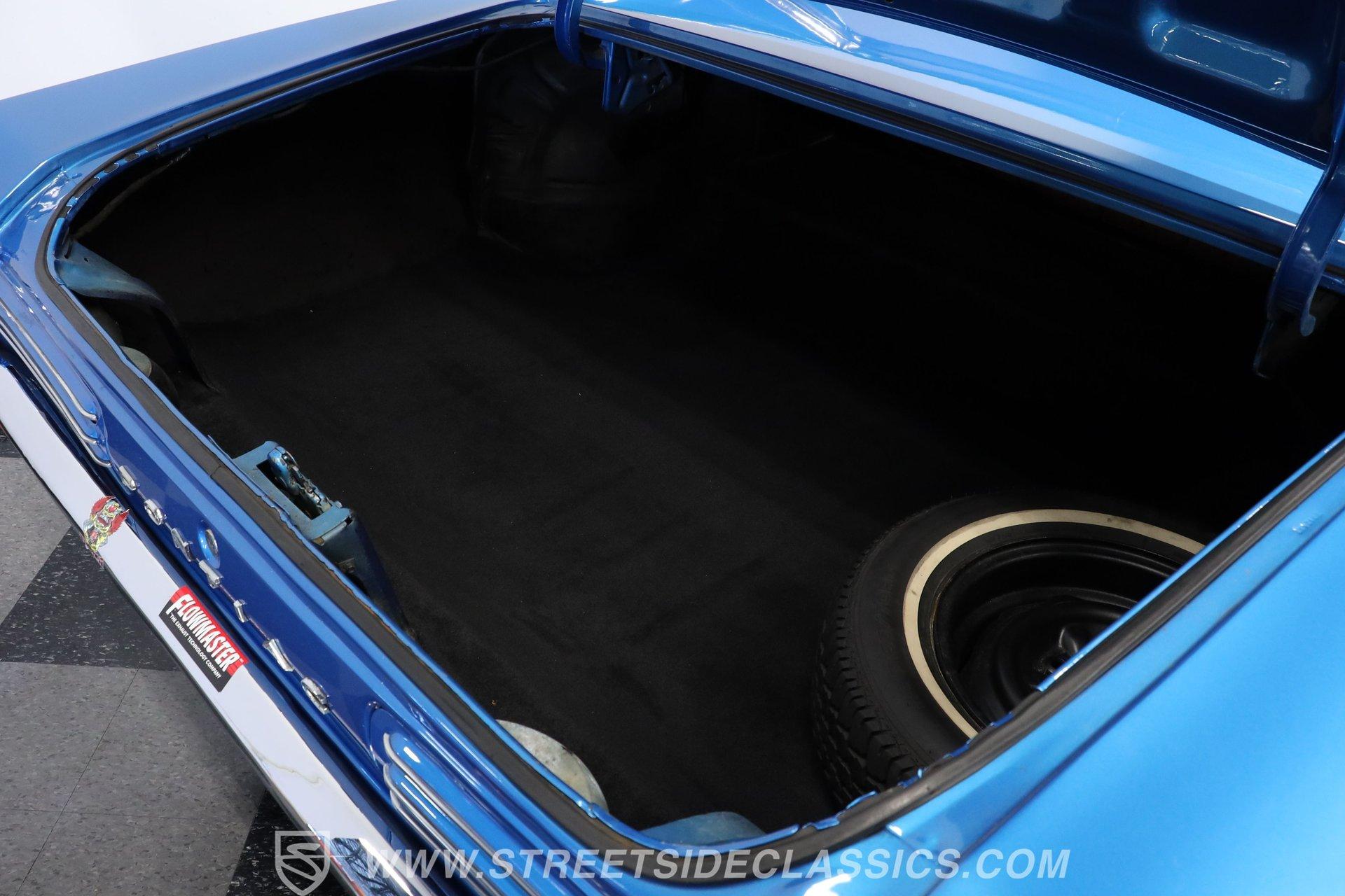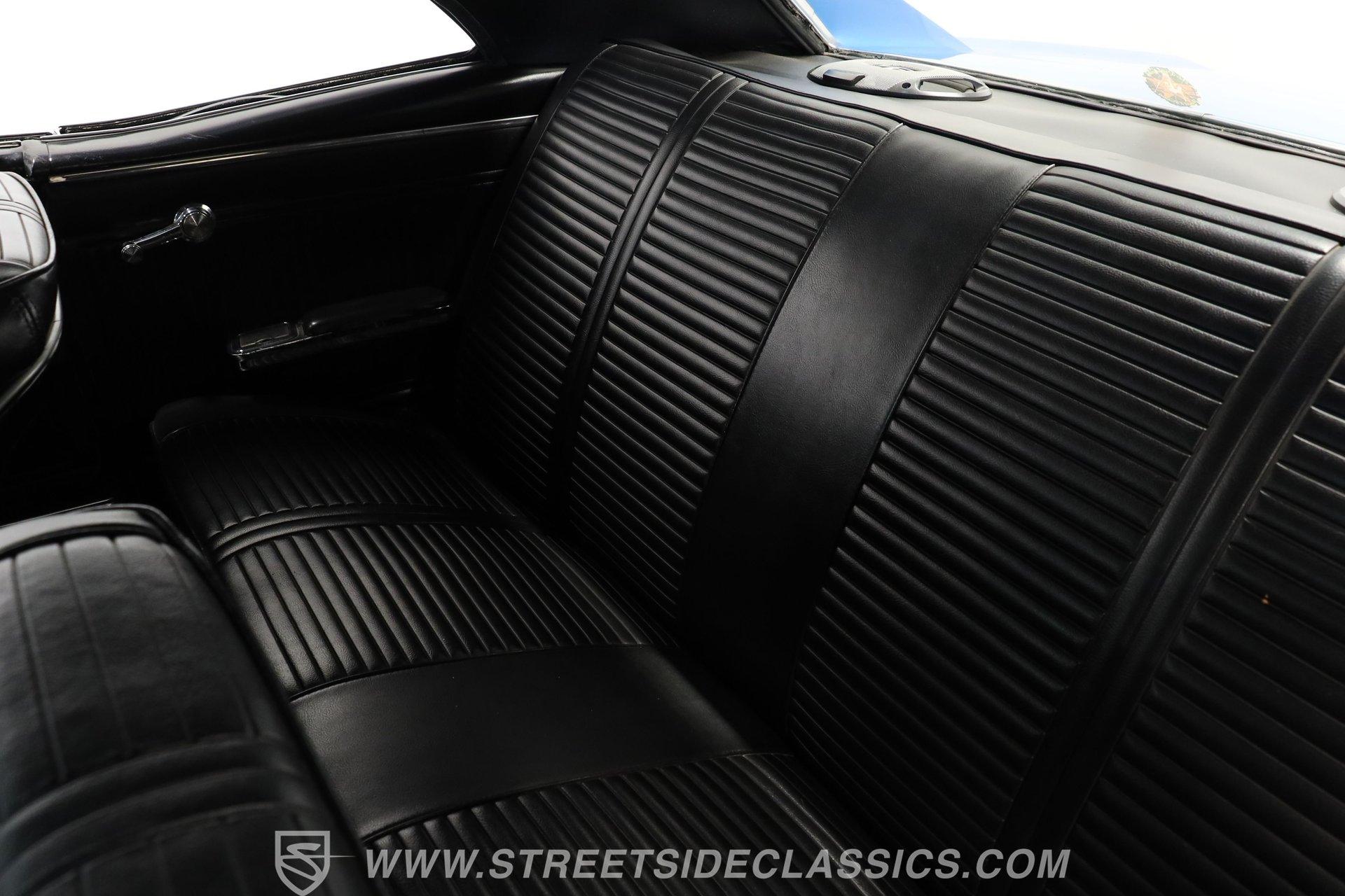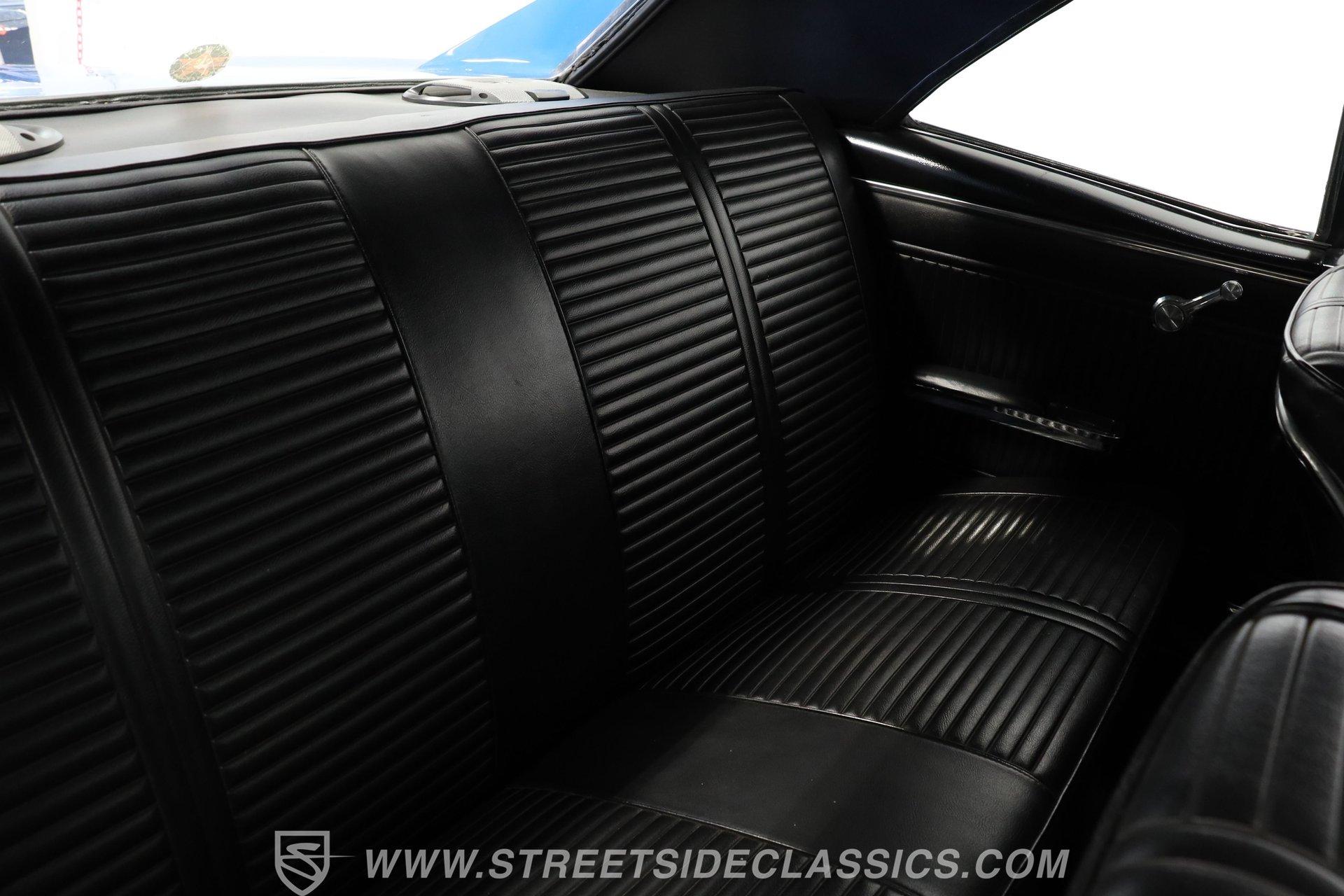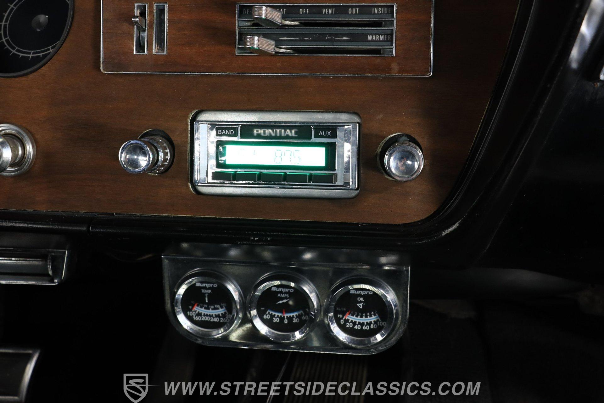Black vinyl bucket seats anchor the performance-oriented interior. The factory console houses the shifter for the automatic transmission. A retro AM/FM radio provides audio, while the dash displays stock instrumentation. Under-dash mounted, chrome bezel SunPro gauges monitor the powerful engine's vital signs. Power steering allows for easy maneuvering, complementing the car's performance setup.