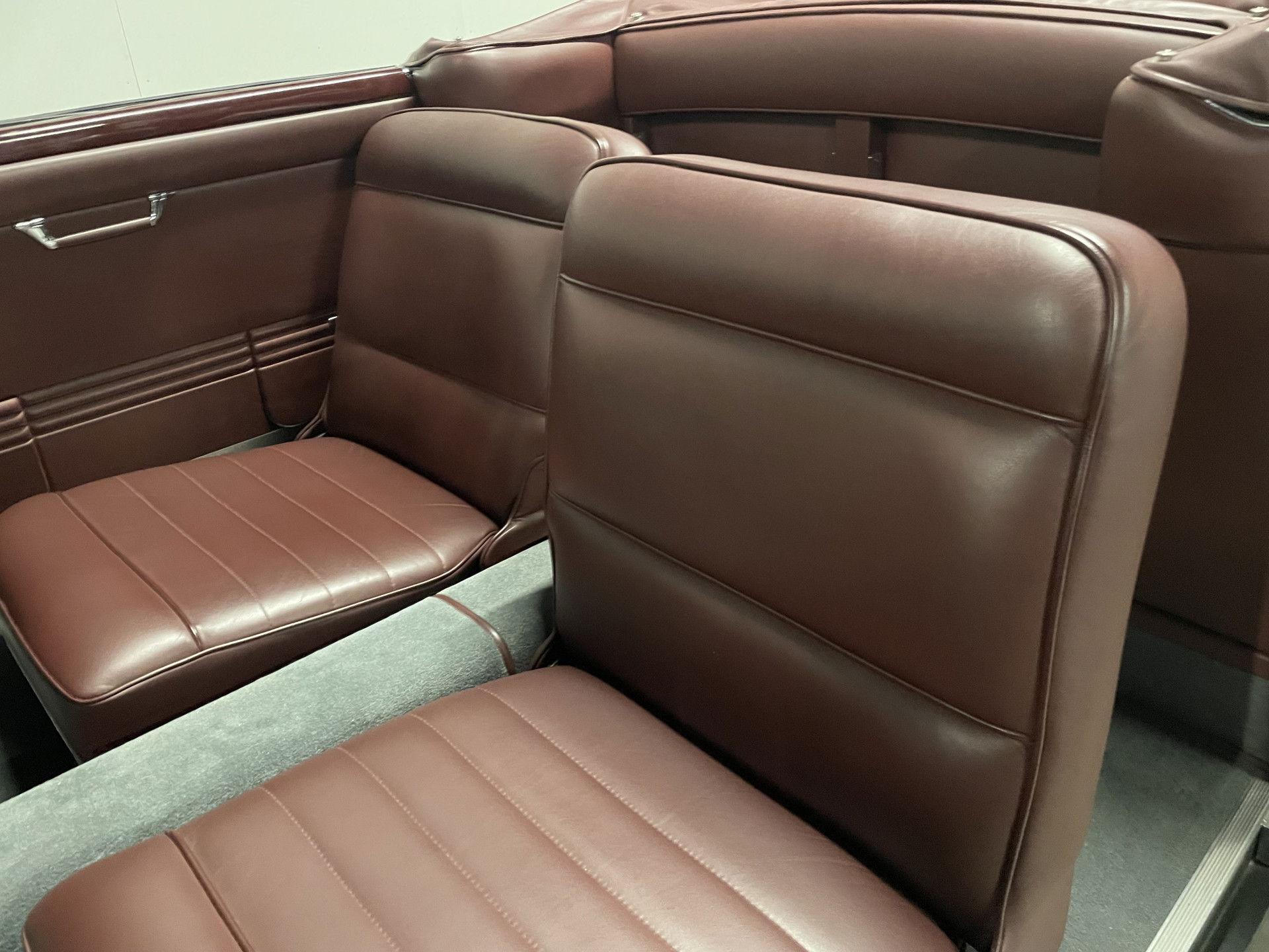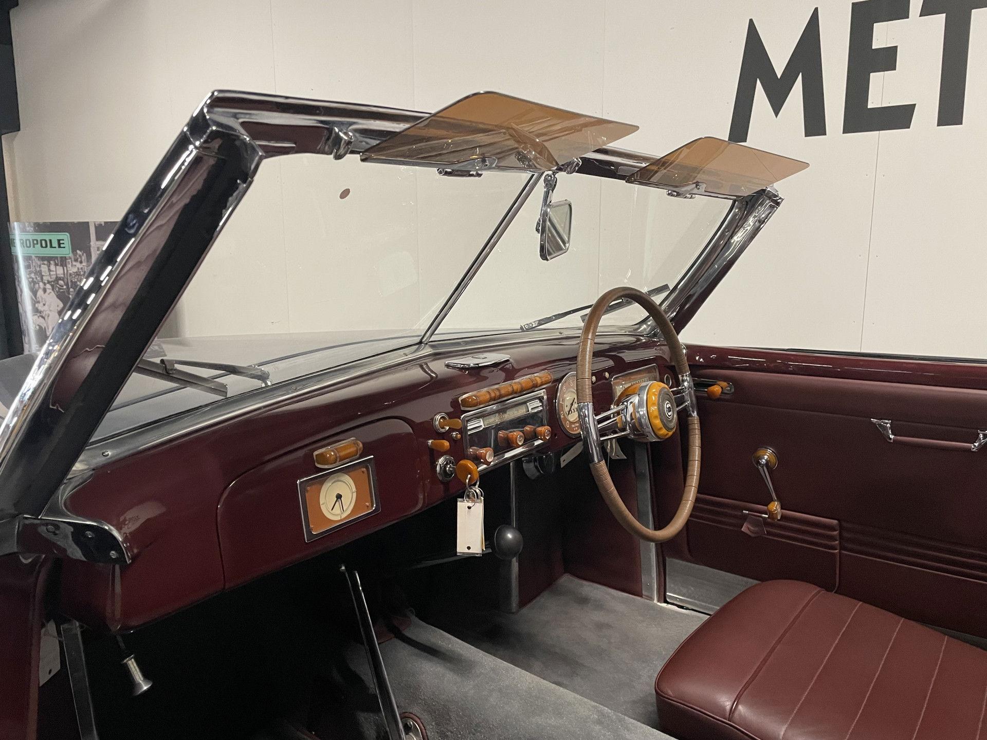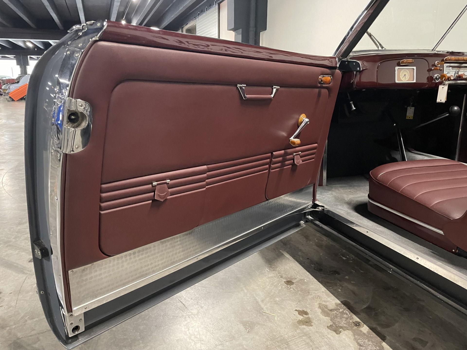 The driver and passenger have a dashboard that matches the upholstery and is set with a striking, unique composition in Bakelite and chrome. Because the spare tire took up most of the trunk, folding rear seats were necessary to provide adequate space for luggage.