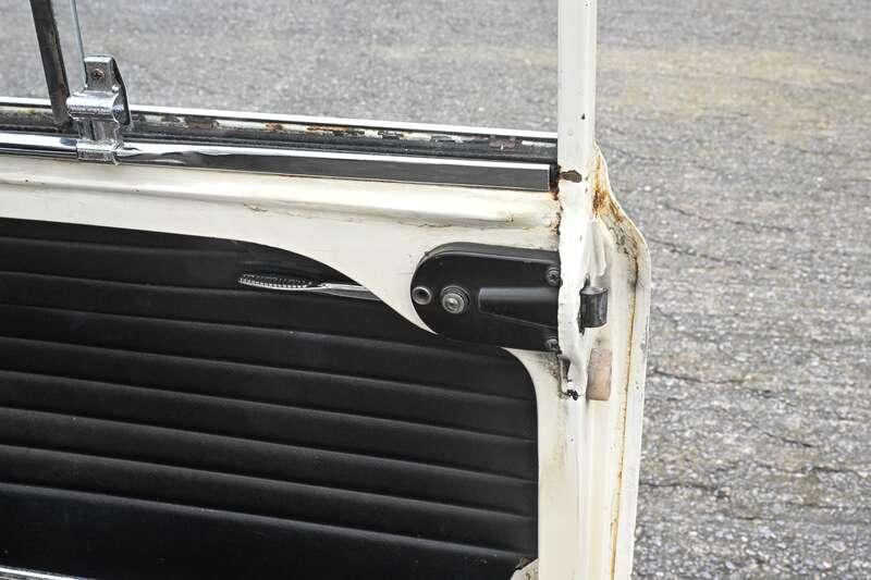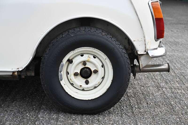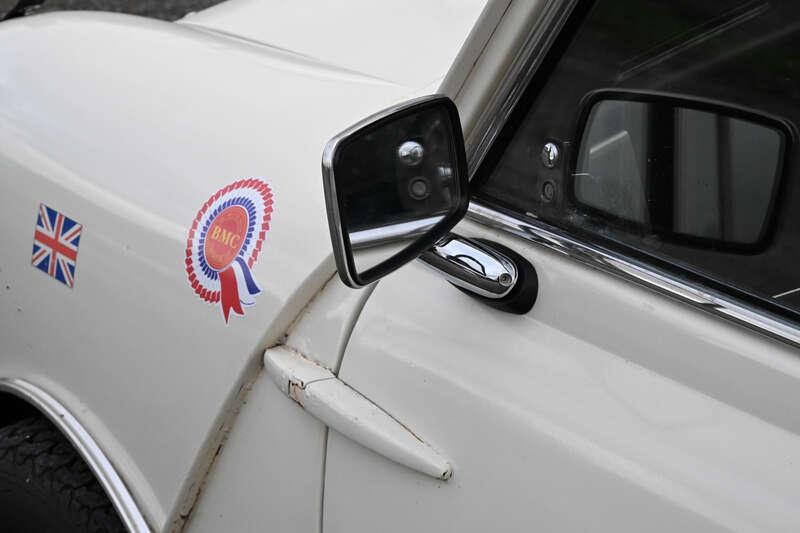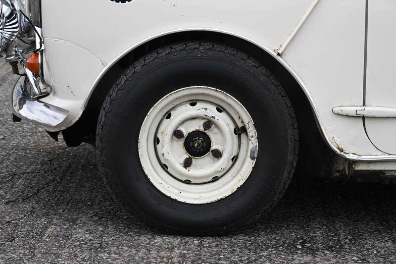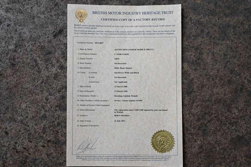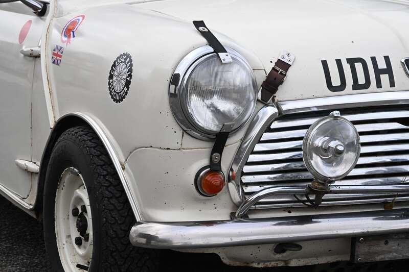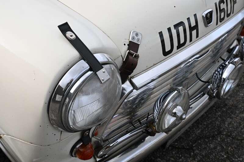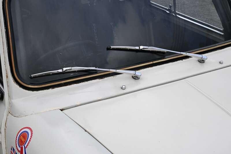 - Finished in its original Snowberry White with a black cap and fitted with standard-size steel Cooper wheels fitted with Blockley tyres, laminated front windscreen, auxiliary spotlights and twin fuel tanks