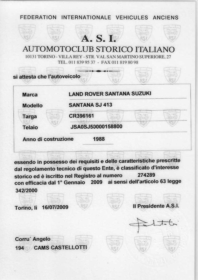 This charming 1988 Suzuki Santana SJ 413, built in Spain by Santana Motor, is one of the most iconic and beloved versions of Suzuki's compact 4×4. This example boasts official ASI certification, confirming its originality and historic importance, and has survived in excellent, largely original condition.