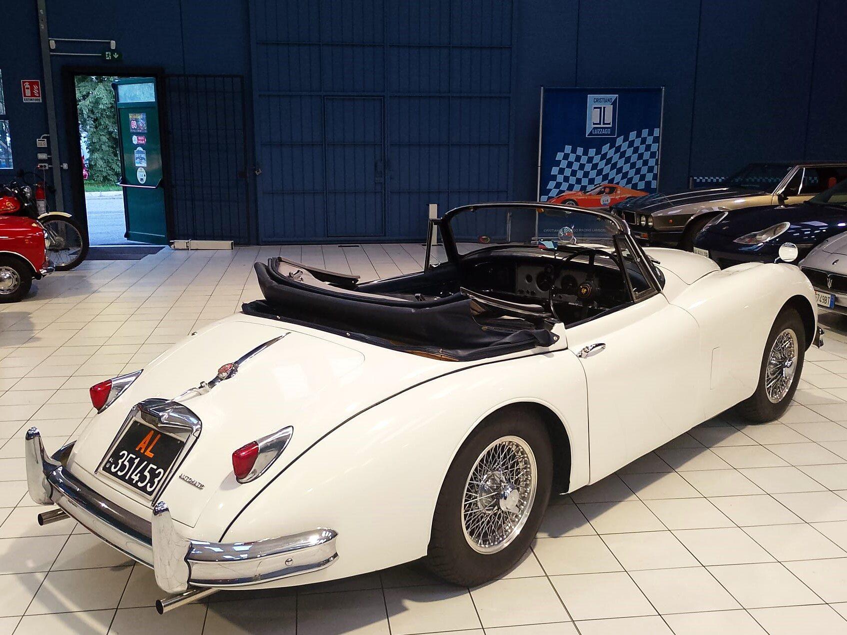 First registered in the United Kingdom in 1960, this elegant Jaguar XK150 Drop Head Coupe (DHC) was imported to Italy in 1975, when it was just 15 years old—not yet considered a classic car. Initially registered in Milan, it was later re-registered in Alessandria following a change of ownership, and it still retains its original black Italian license plates, an important trace of its long-standing Italian provenance.